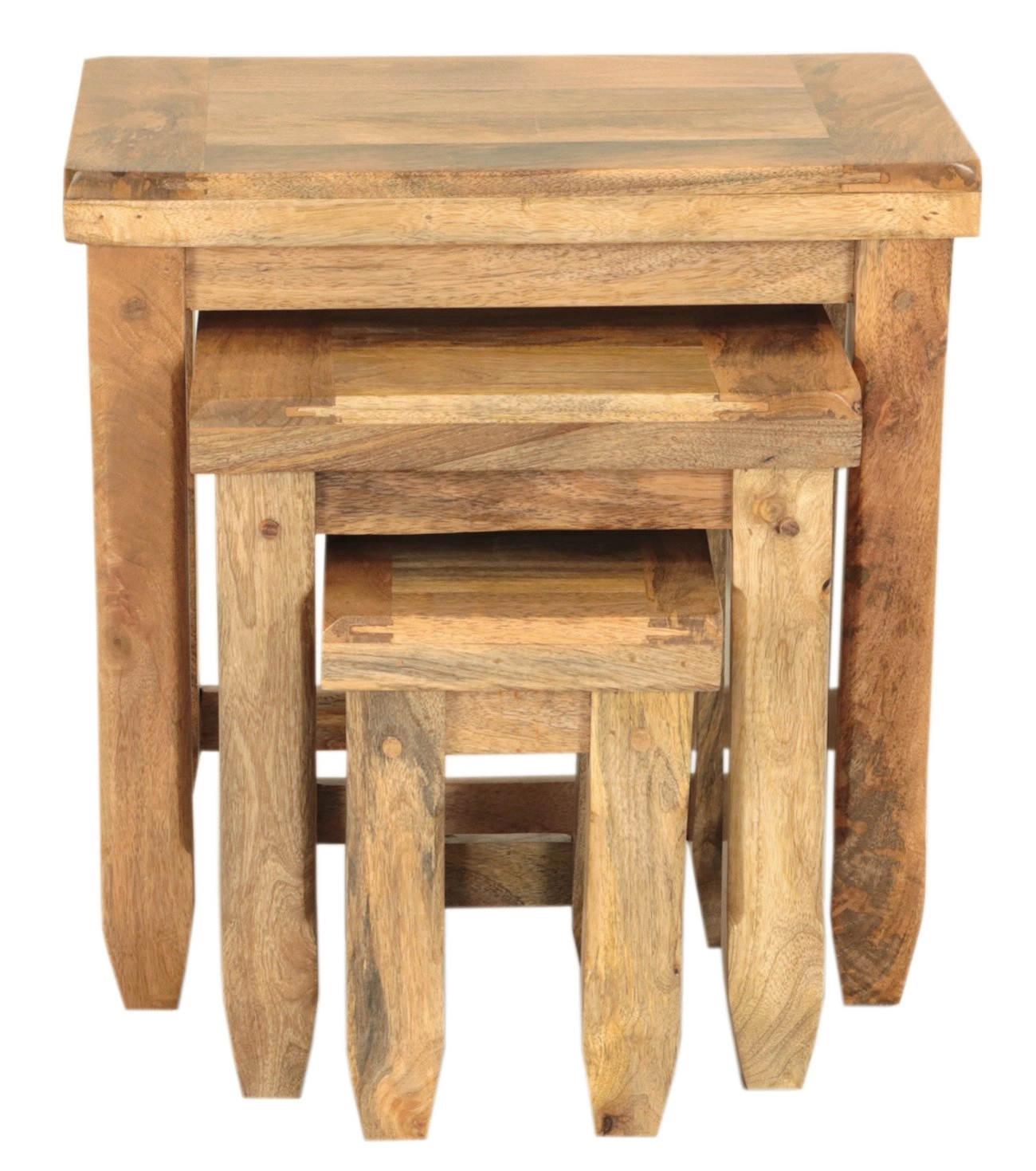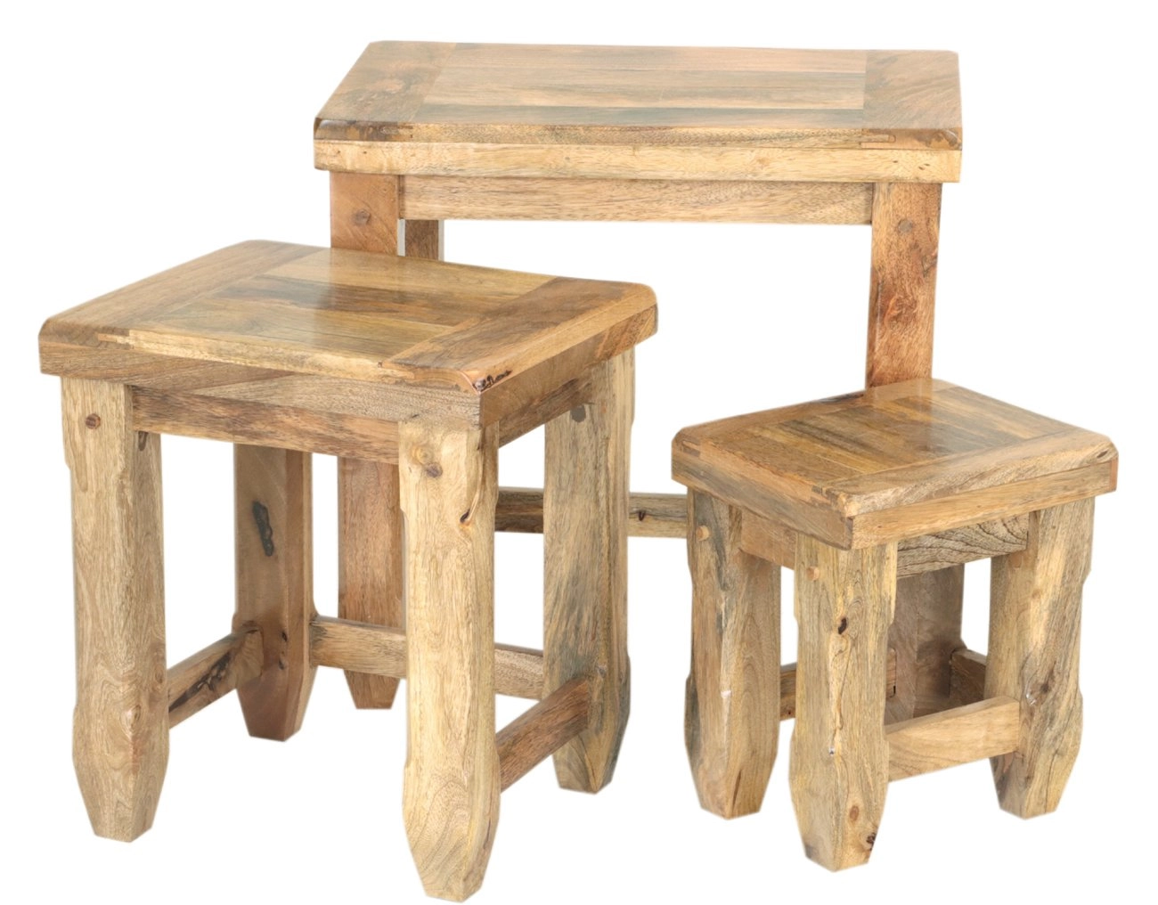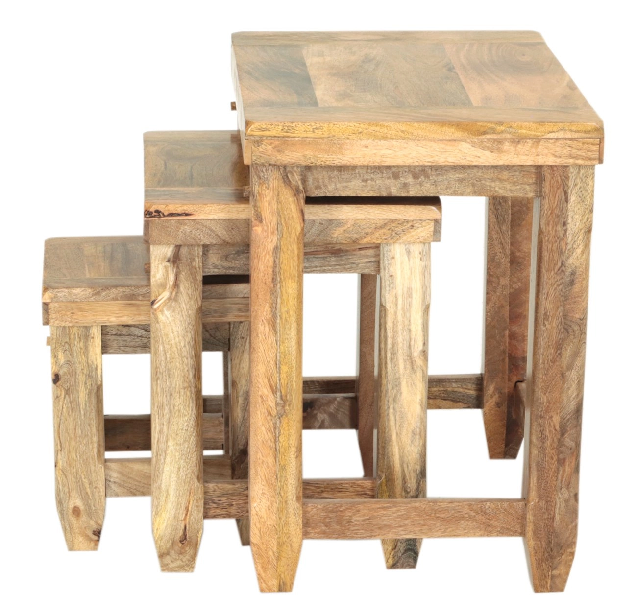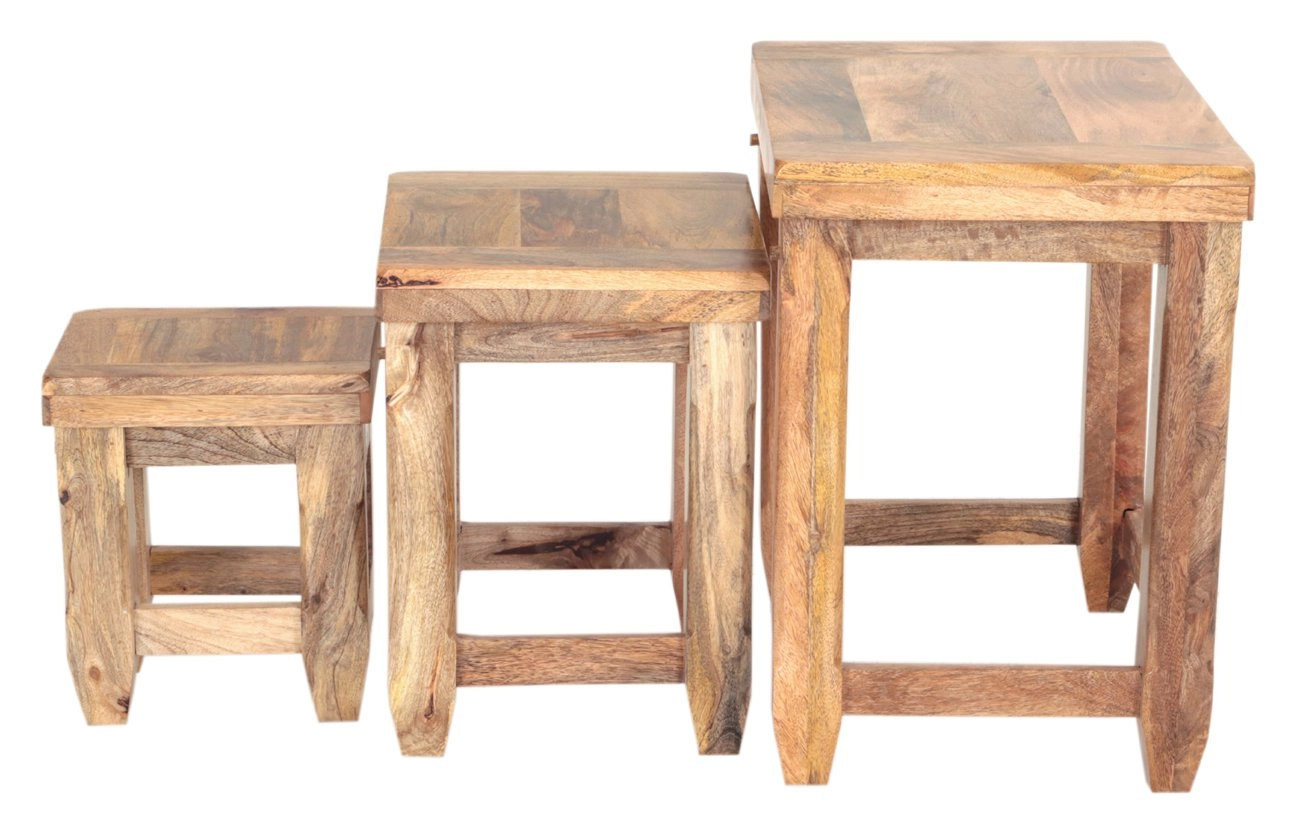 Odkládací stolky 3 ks jsou vyrobeny z kvalitního masivního mangového dřeva. Velikosti: 52x51x36cm, 37x41x31cm, 26x31x22cm (ŠxVxH).