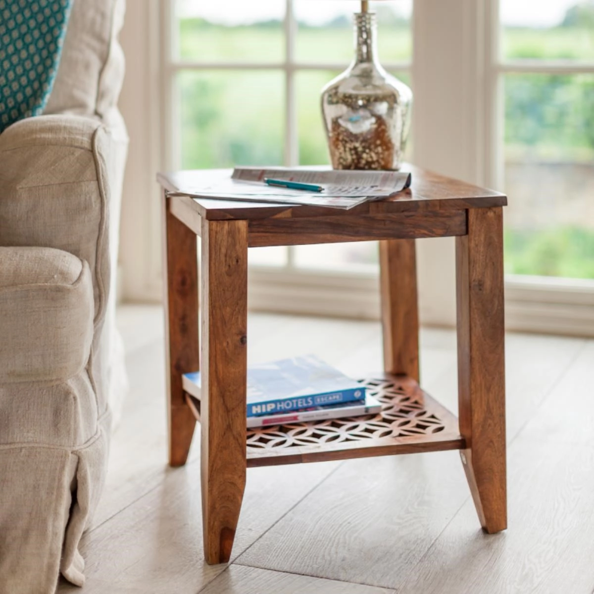 Odkládací stolek z masivu z kolekce Mira z masivu je vyroben z kvalitního masivního palisandrového dřeva. Odkládací stolky které máme skladem se dají prohlédnout osobně nebo objednat na zakázku v kterémkoliv z našich nabízených odstínů! Indický koloniální nábytek palisandr masiv.