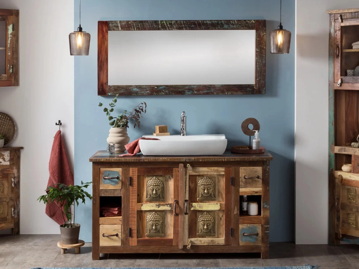 Koupelnová sestava Sumana II z masivního dřeva je dokonalým spojením elegance a funkčnosti, které promění vaši koupelnu v oázu klidu a pohody. S její hnědou, lakovanou povrchovou úpravou se přírodní krása dřeva harmonicky prolíná s moderním designem, což činí tento kus nábytku skvělým doplňkem do jakéhokoliv stylu interiéru. Recyklované tvrdé dřevo, které bylo použito k výrobě této sestavy, nejenže zajišťuje dlouhou životnost a odolnost, ale také přináší do vaší koupelny kousek přírody a šetrnost k životnímu prostředí. Každý detail byl pečlivě promyšlen, aby splnil jak estetické, tak praktické požadavky, ať už jde o úložný prostor pro kosmetiku, nebo o dostatečnou plochu pro umyvadlo.