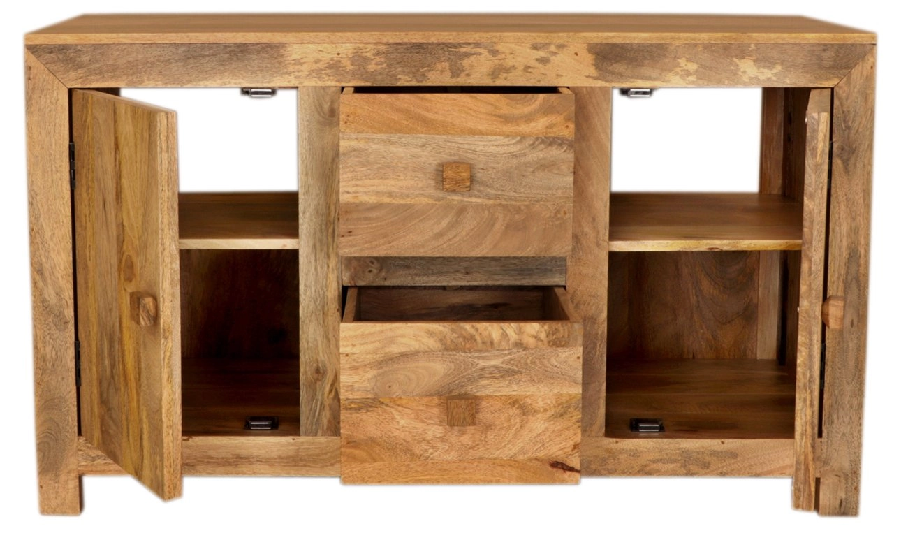 Každý kus mangového dřeva má originální texturu, která dodává skříňce na jedinečnosti.