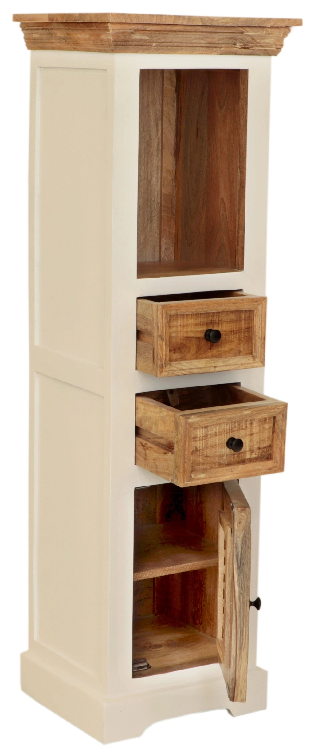Skříňka je vybavena dvěma prostornými zásuvkami a dvířky, poskytujícími dostatek místa pro vaše koupelnové potřeby – od ručníků po kosmetiku. Organizační schopnosti této koupelnové skříňky ocení každý, kdo si zakládá na pořádku a praktičnosti. Mangové dřevo s nádhernou texturou a teplými tóny činí tuto skříňku do koupelny z masivu opravdu stylovým kouskem nábytku.