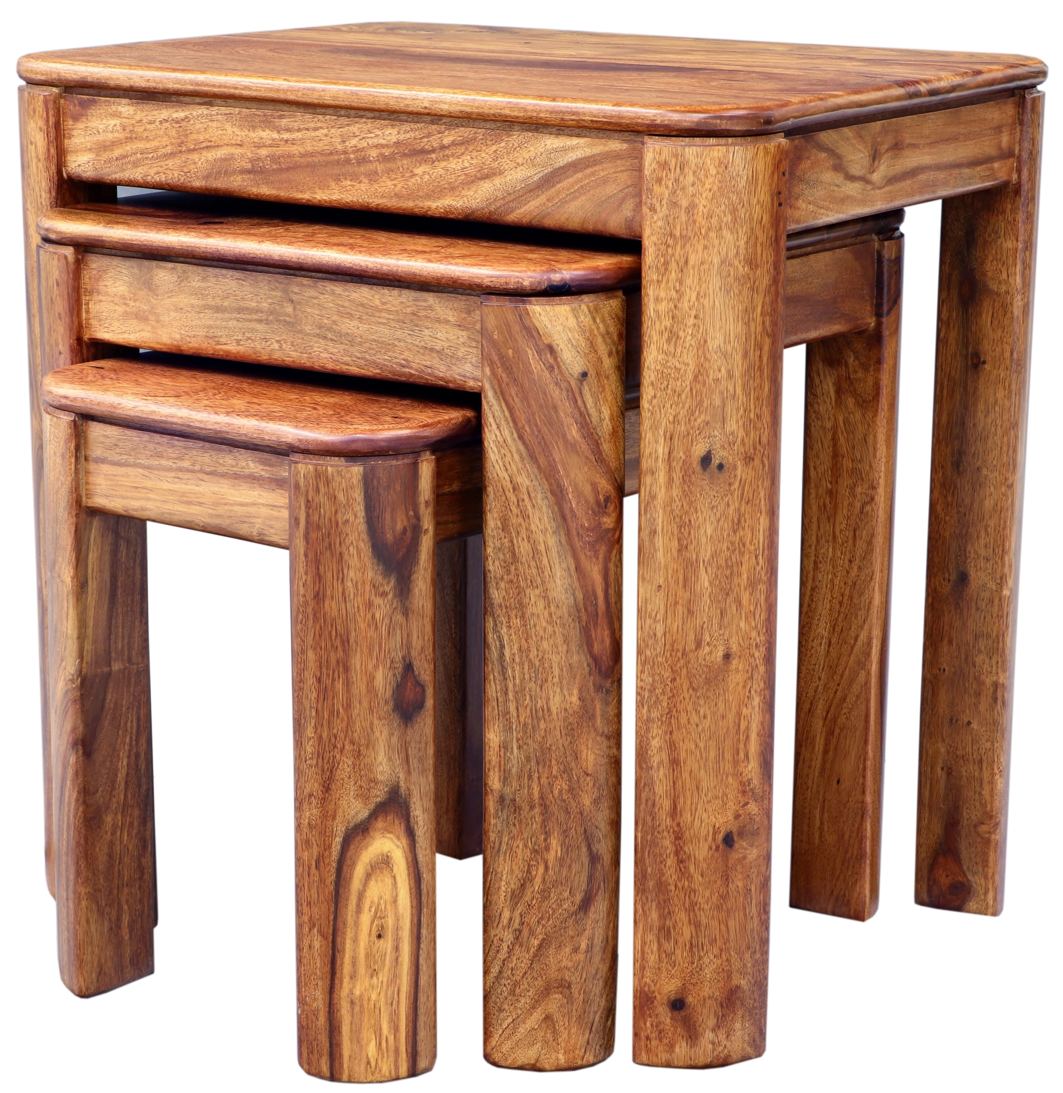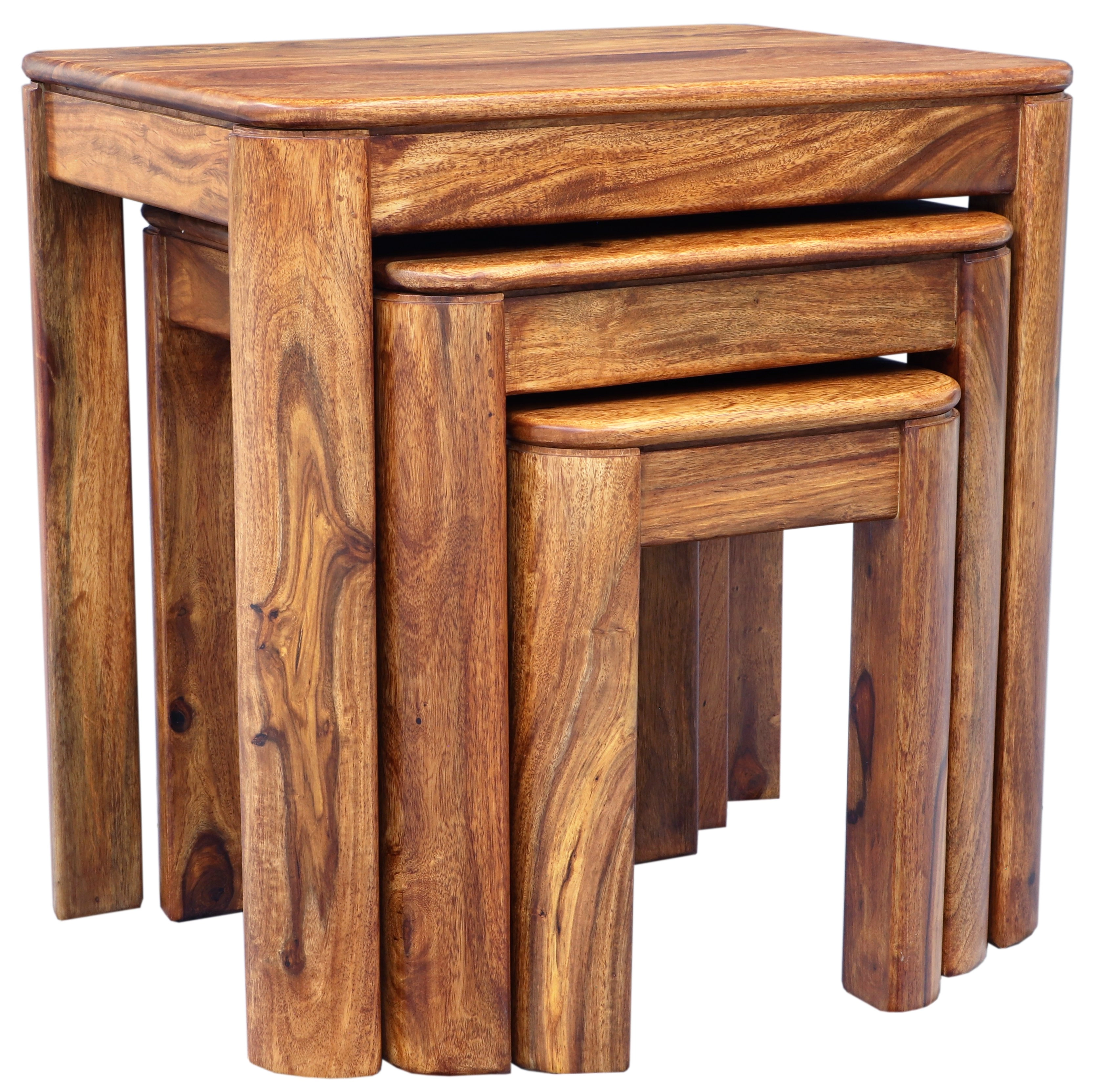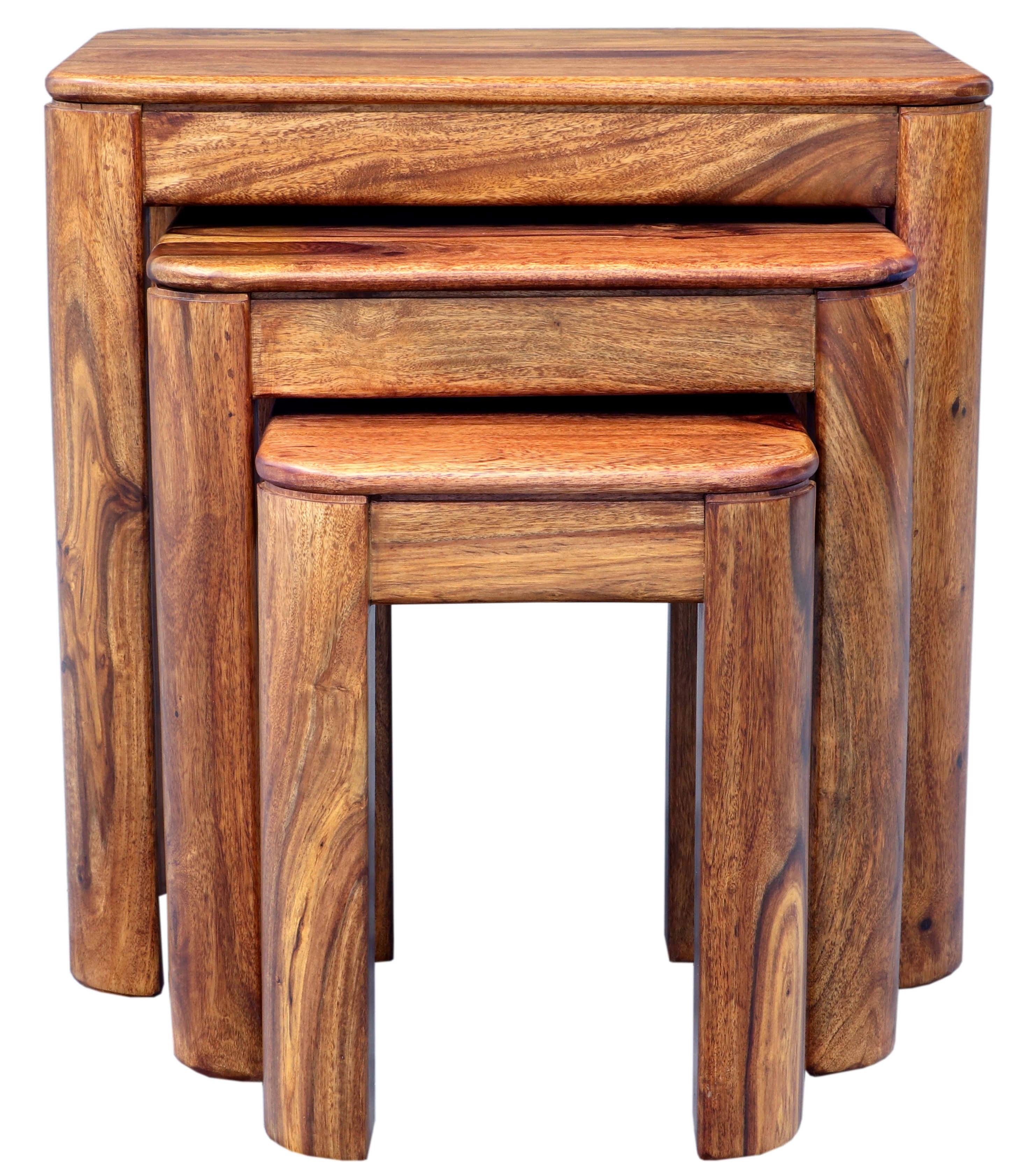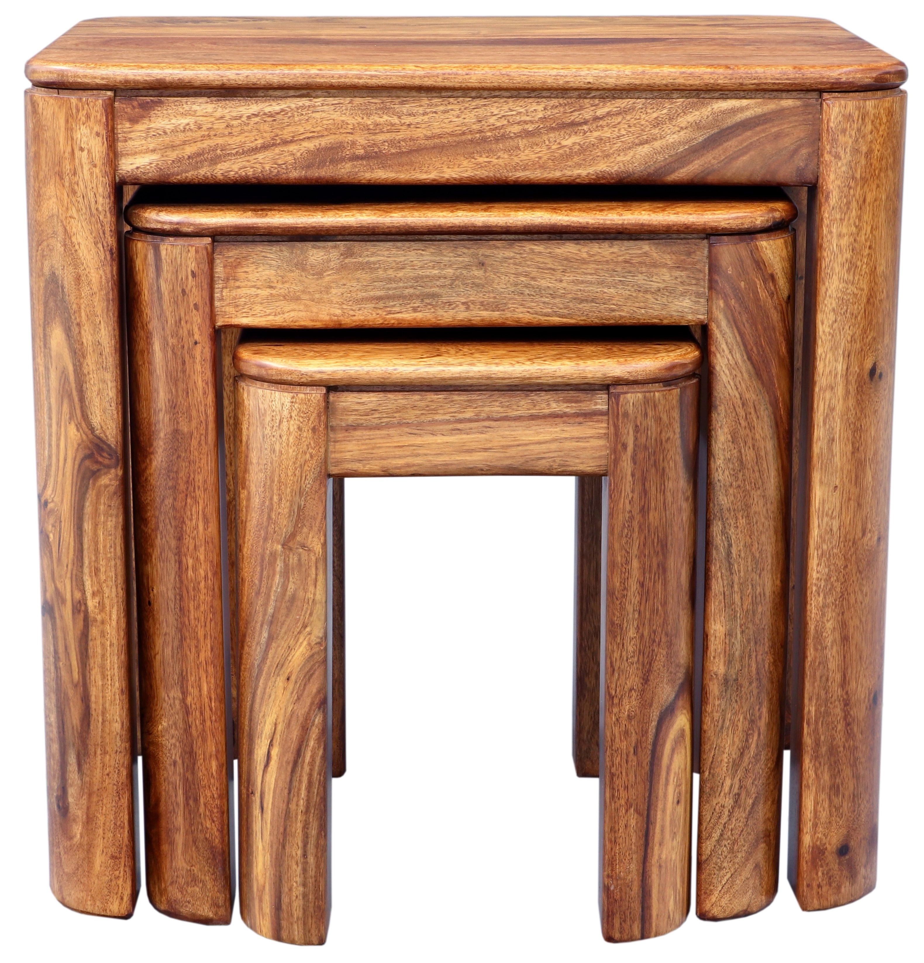Odkládací stolky Tina z masivu palisandru jsou nejen krásné, ale i praktické. Tyto stolky jsou vyrobeny z vysoce kvalitního masivního palisandrového dřeva, známého svou odolností a atraktivním vzhledem. Set tří stolků různých velikostí perfektně zapadne do každého interiéru, poskytující dostatek prostoru pro vaše knihy, kávu nebo dekorace. Každý kus je jedinečný s vlastním charakterem dřeva, což zaručuje, že interiér vašeho domova bude opravdu originální.