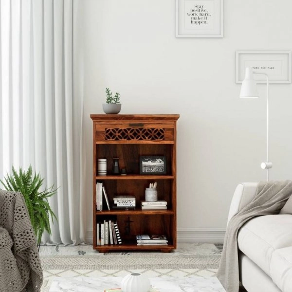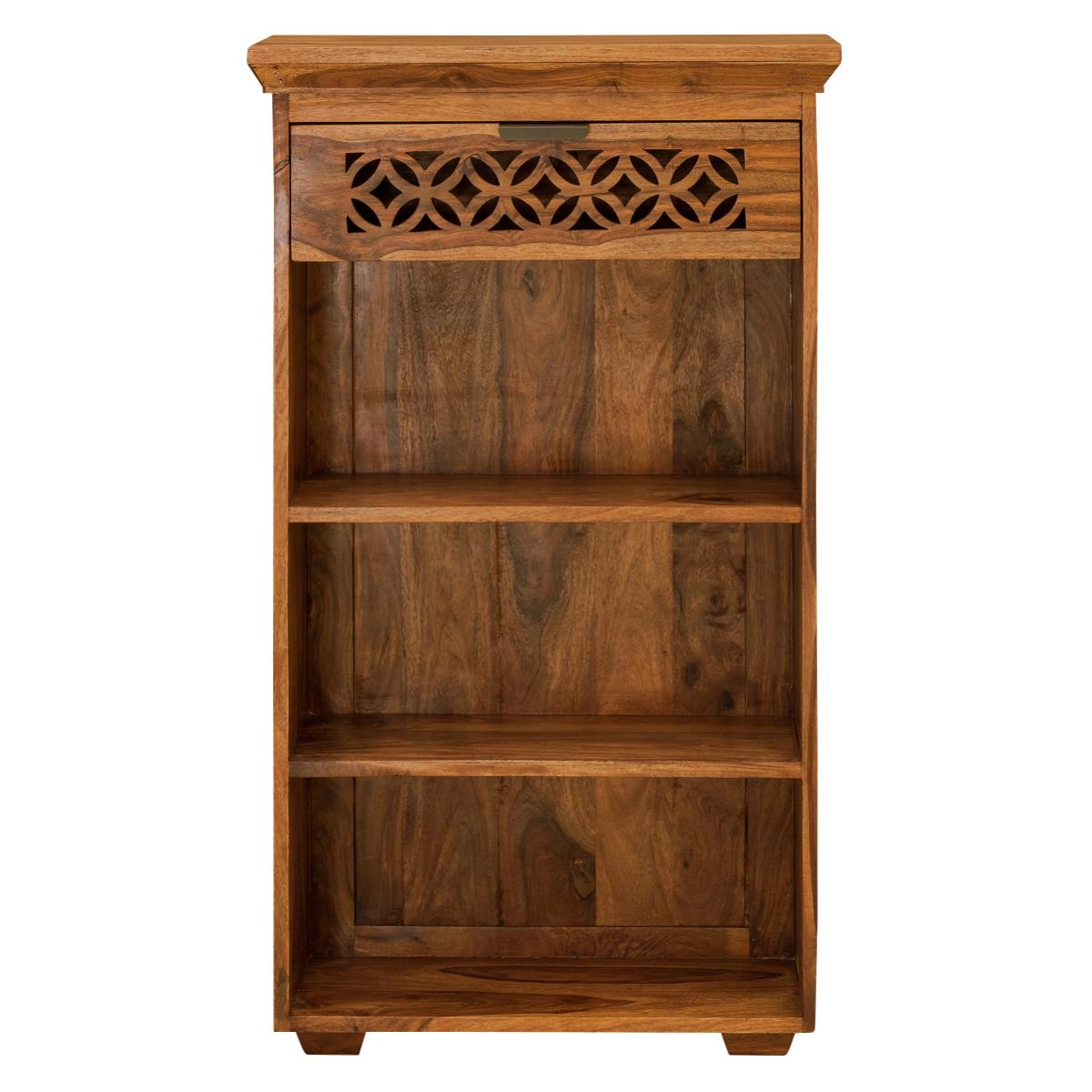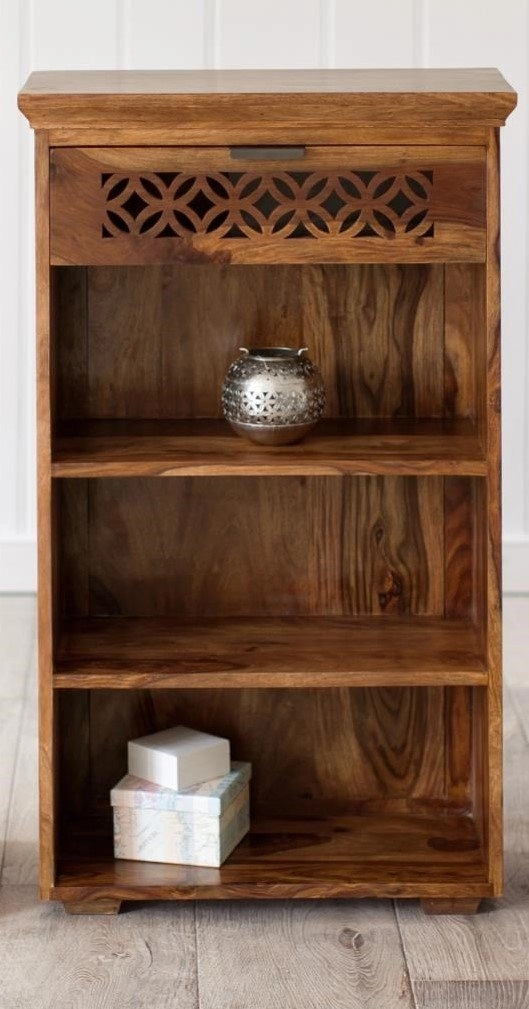 Objevte kouzlo tradičního indického řemesla s knihovnou z masivu palisandr o rozměrech 60x120x45 cm. Tato knihovna o šířce 60 cm je ideální volbou pro každého, kdo hledá funkční a stylový doplněk do předsíně. Vyrobená z ušlechtilého dřeva palisandru, které je známé pro svou pevnost a krásnou strukturu, přináší do vašeho interiéru kousek exotiky a elegance. Knihovna z masivu nejenže skvěle poslouží pro uložení knih, ale díky multifunkčnímu designu s ručně vyřezávaným šuplíkem a třemi otevřenými policemi může sloužit i jako praktická skříňka nebo komoda do chodby. Prostor pro vaše věci poskytují police s rozměry 26x47 cm, 25x47 cm a 26x47 cm, které jsou ideální pro vaše knihy, dekorace nebo uspořádání osobních potřeb. Díky svému originálnímu vzhledu a kvalitnímu provedení se tento kousek stane nepostradatelným prvkem vaší domácnosti. Mezi další oblíbené kusy nábytku, které se skvěle kombinují s touto knihovnou, patří konferenční stolky, vitríny, TV stolky a jídelní stoly z masivu.