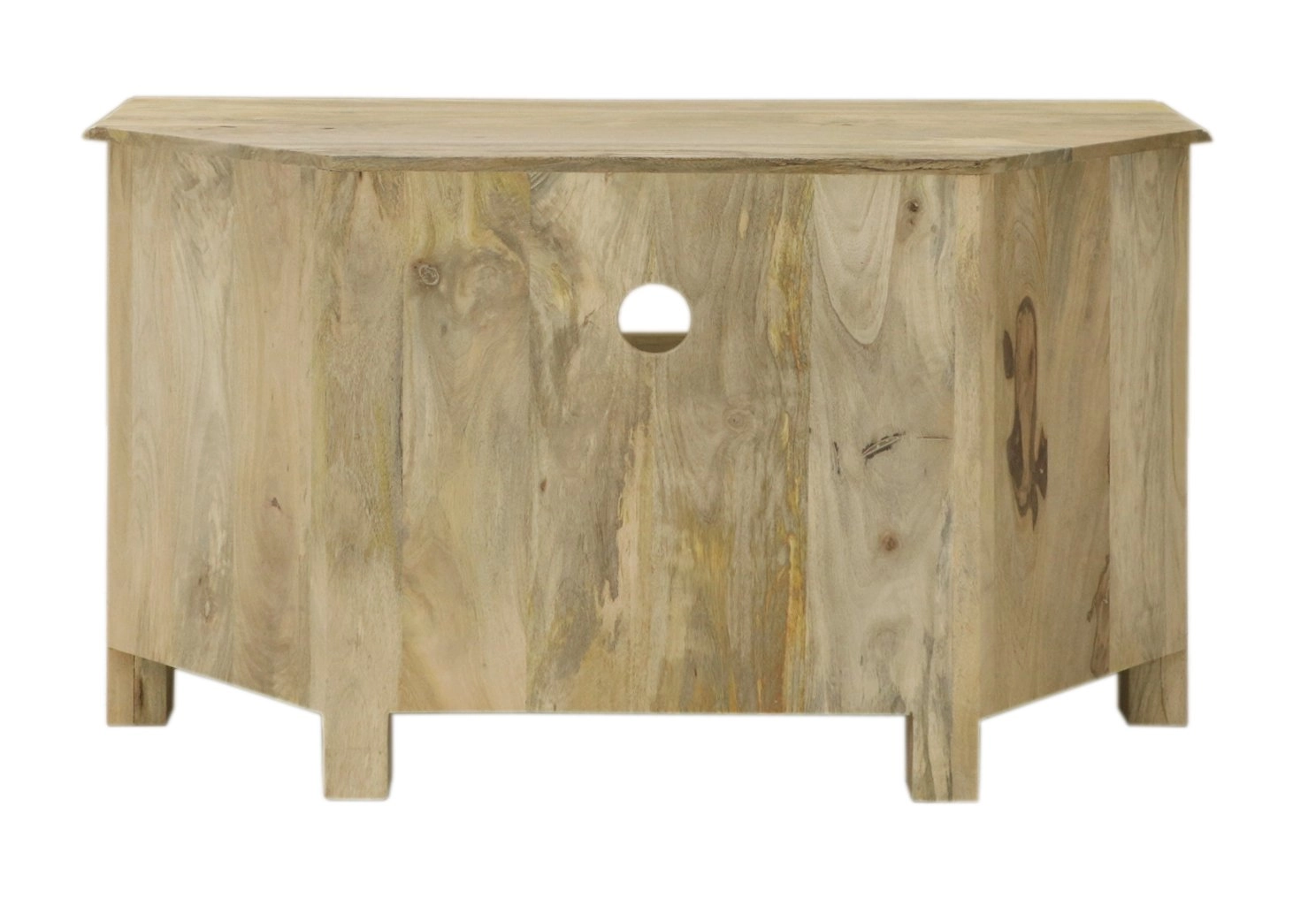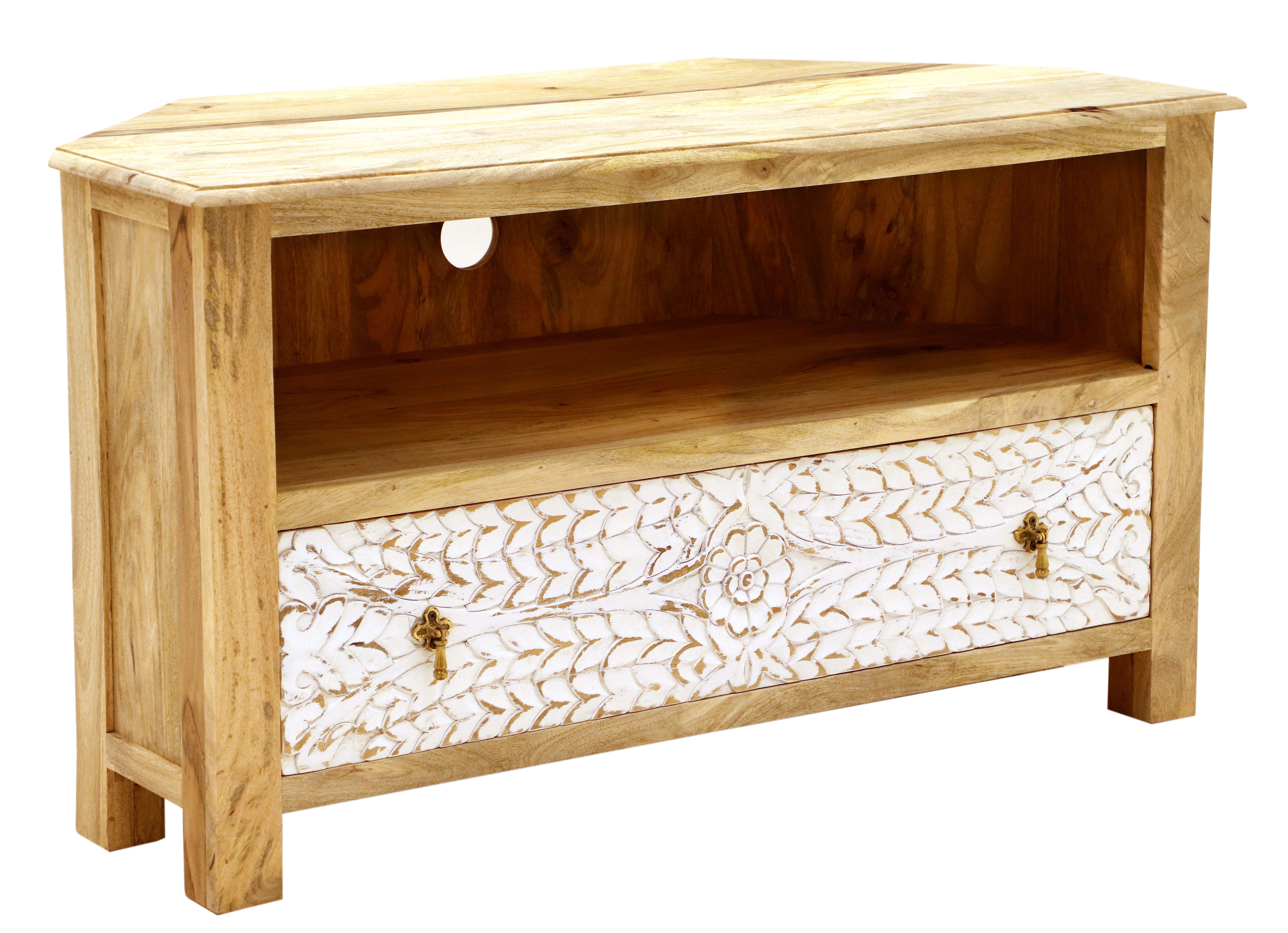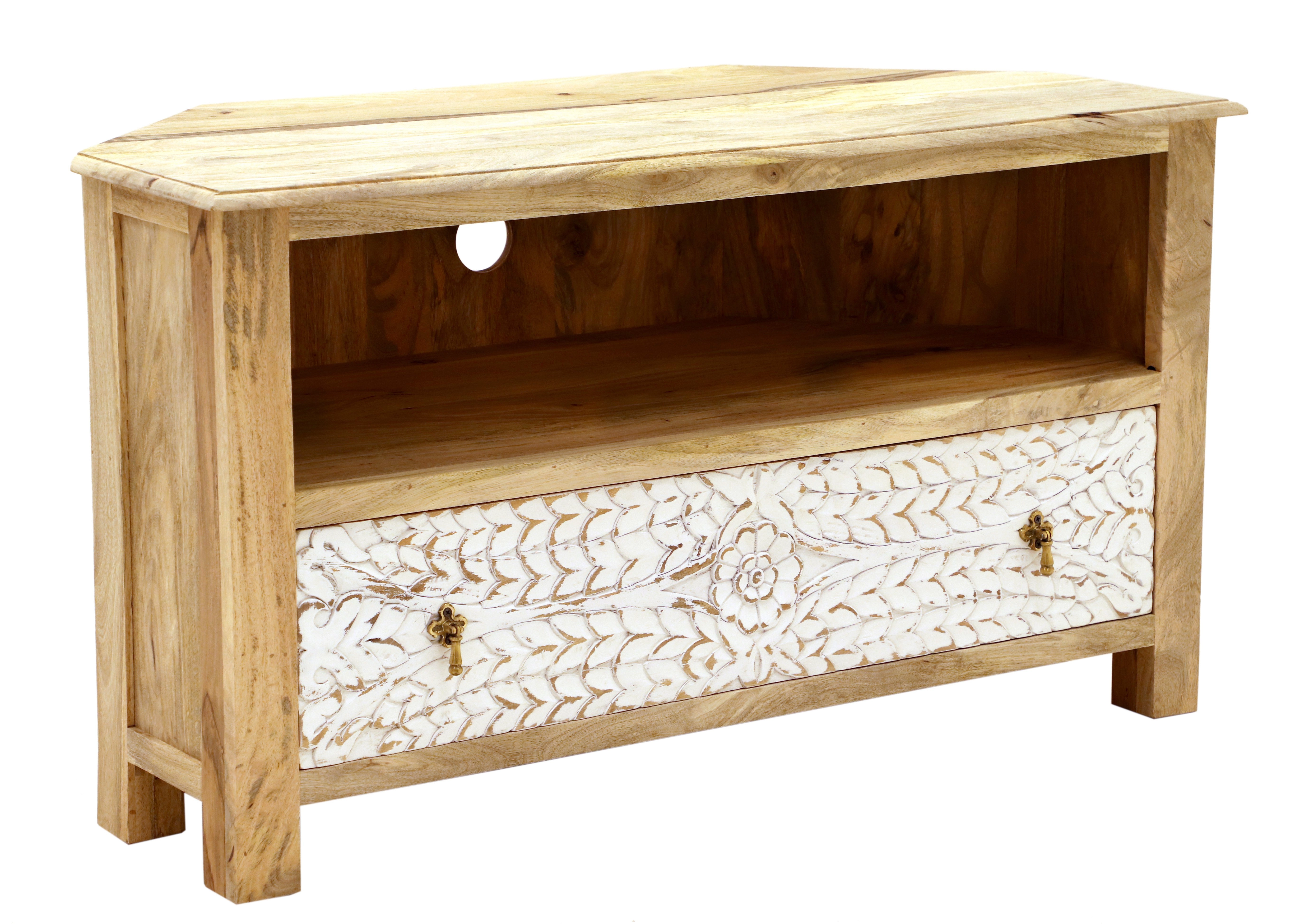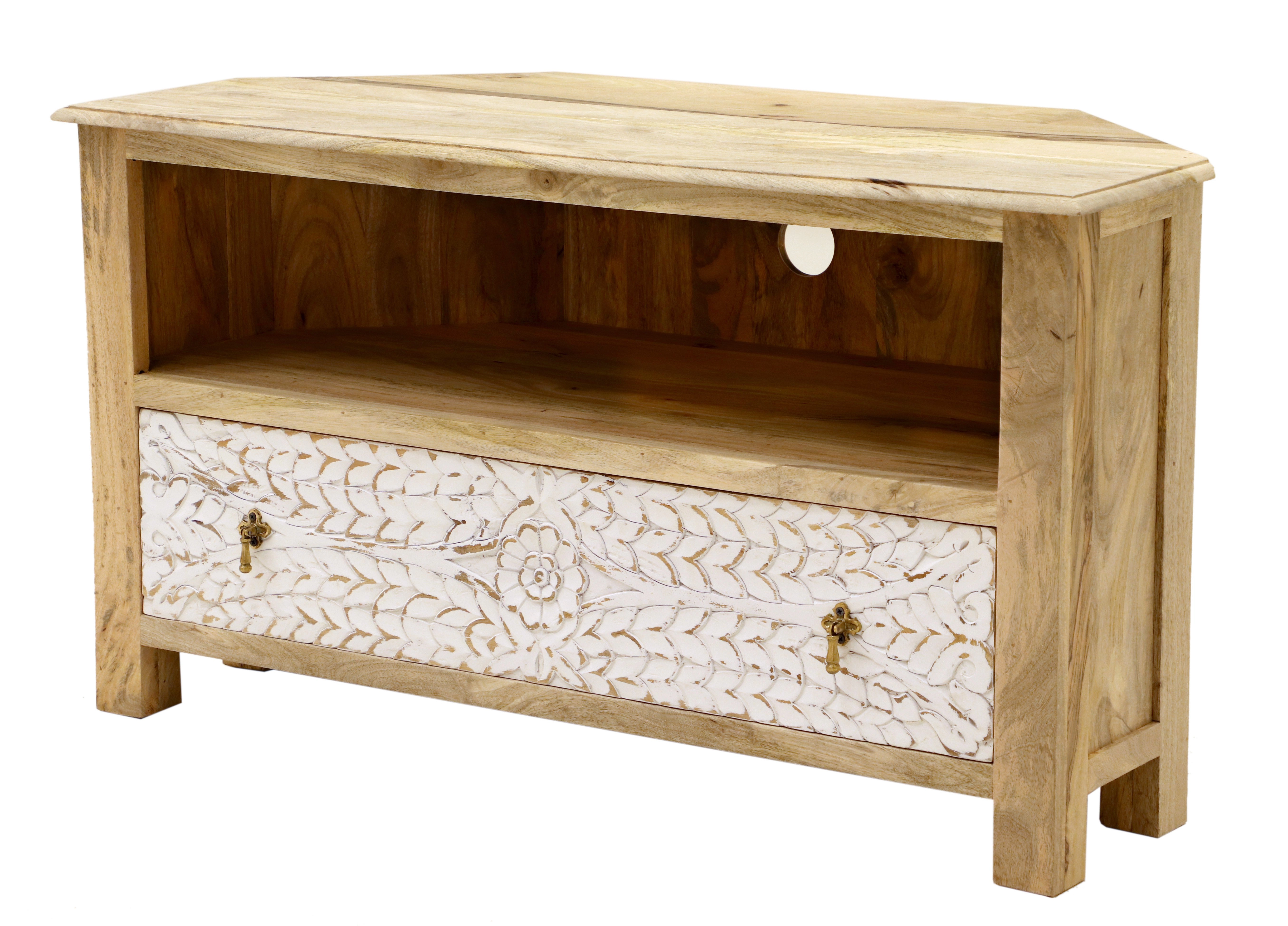 Rohový stolek pod TV z masivního dřeva mango o rozměrech 110x60x50 cm je ideálním doplňkem pro váš obývací pokoj. Tento jedinečný kus nábytku z kategorie masivní indický nábytek kombinuje eleganci s praktičností, což ho činí nezbytností pro ty, kteří si cení kvalitního zpracování a stylového designu.