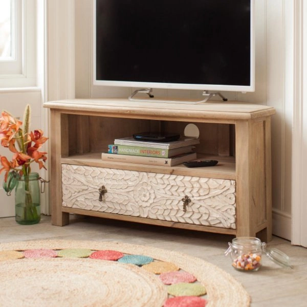 Lidé, kteří si pořizují tento rohový stolek pod TV, často volí také další kousky masivního indického nábytku, jako jsou konferenční stolky, knihovny, komody a sedací soupravy, které dokonale ladí s exotikou a estetikou tohoto stylu.