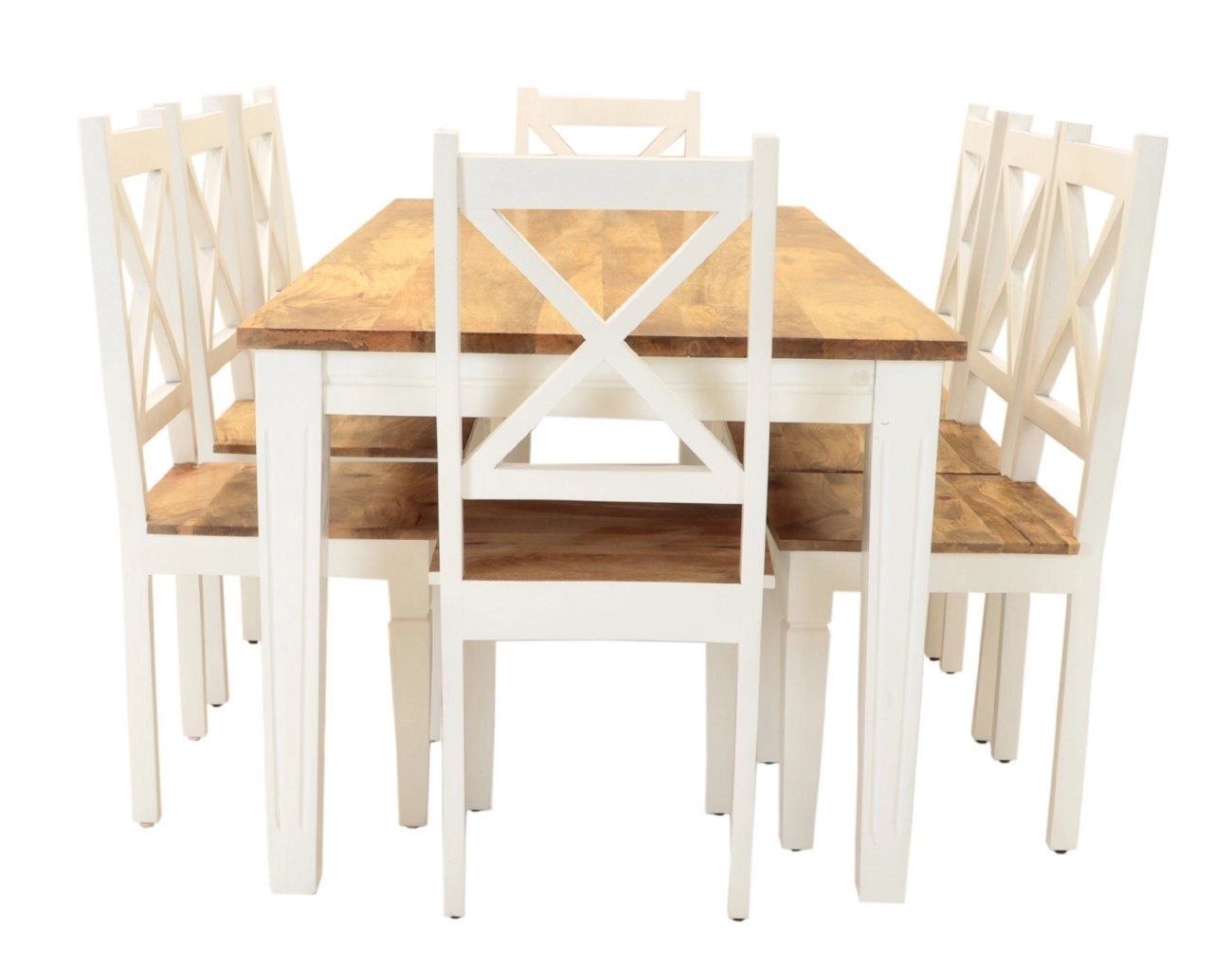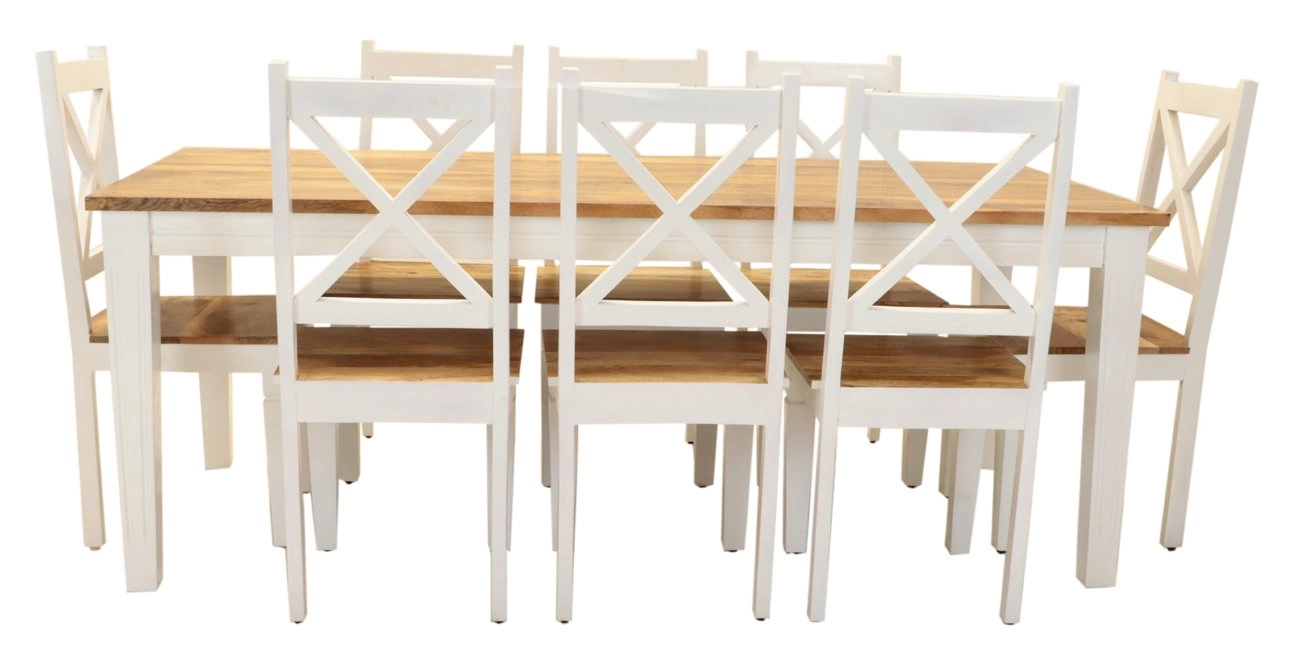 Objevte jedinečnou krásu a funkčnost jídelního setu pro 8 osob z masivního mangového dřeva, který přináší nádech rustikální elegance do každého interiéru. Tento jedinečný kousek z kolekce RETRO je ideálním doplňkem pro ty, kteří si přejí kombinovat tradiční design s pevnou a odolnou konstrukcí. S působivými rozměry jídelního stolu o šířce 200 cm, hloubce 90 cm a výšce 76 cm, které garantují dostatek prostoru pro rodinné večeře i sváteční hostiny.