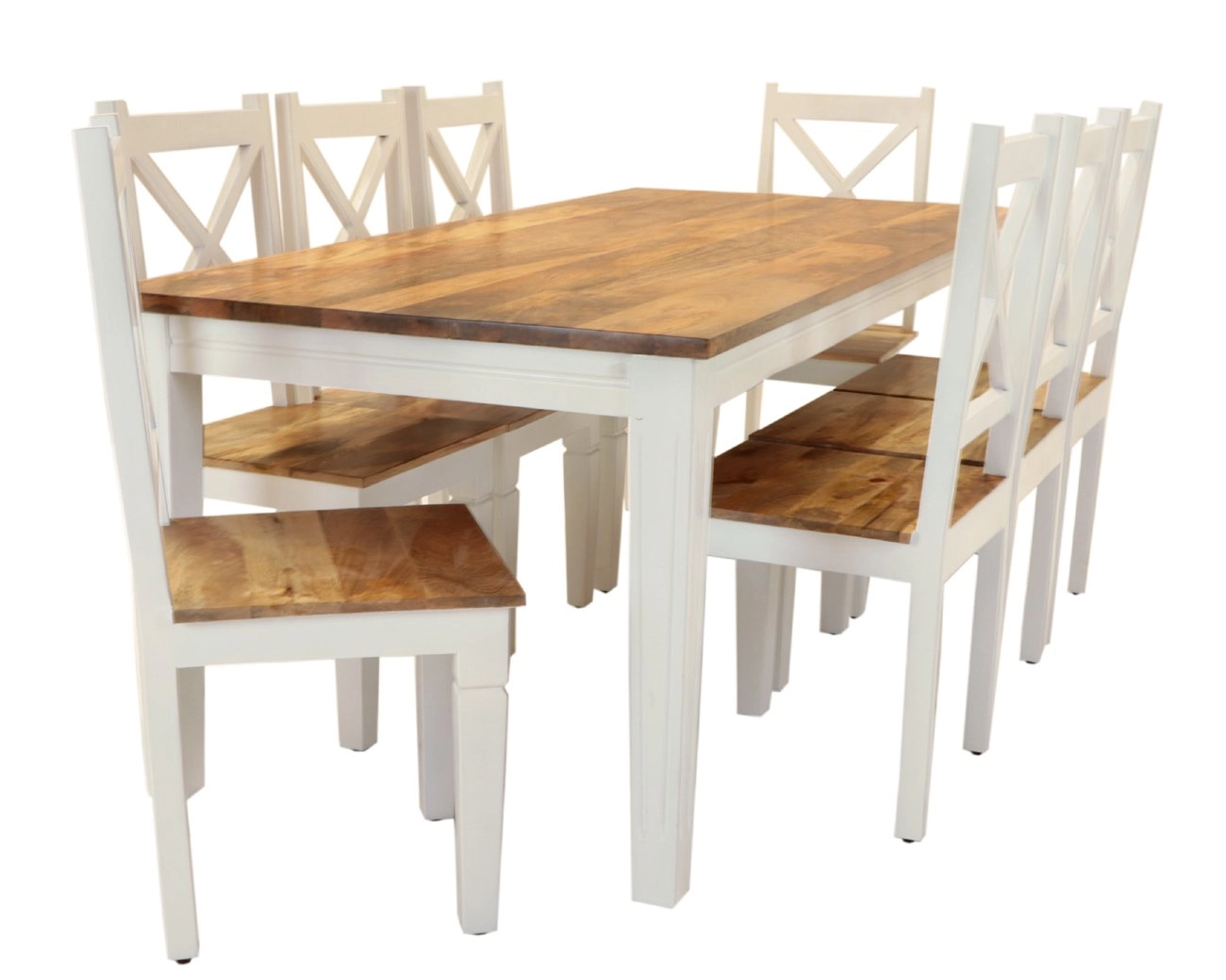 Ruční výroba z indického manga zajišťuje, že každý kousek tohoto jídelního setu je originální, s jemnými rozdíly v textuře a barvě, což podtrhuje jeho autenticitu a charakter. Osm židlí s rozměry 45 cm na šířku, 100 cm na výšku a 45 cm do hloubky dokonale doplňuje celkový vzhled setu a nabízí komfortní posezení pro každého hosta.