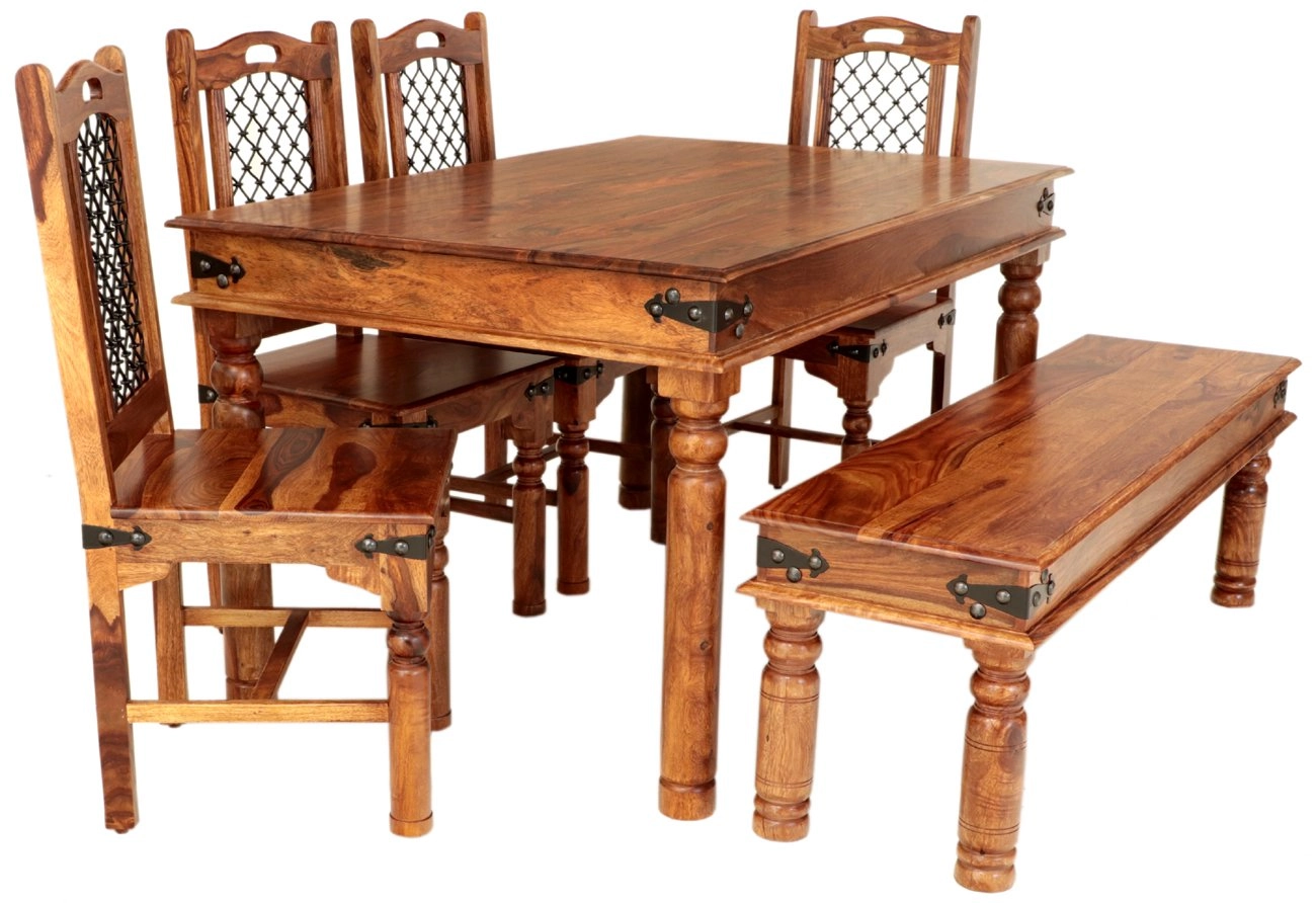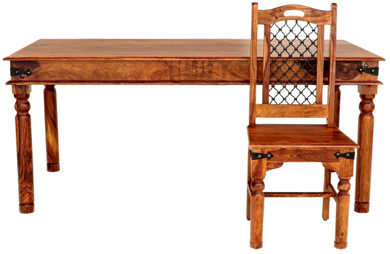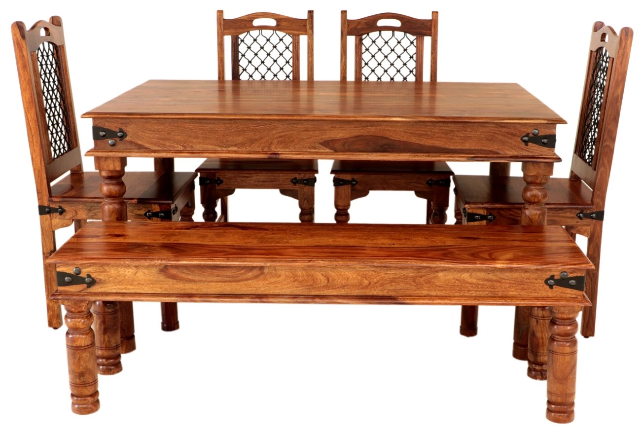 Jídelní stůl a židle pro 6 osob masiv z palisandru je mistrovským kouskem, který přidá nádech elegance a exotiky do vaší jídelny. Tento nádherný jídelní set pochází z Indie a je součástí prestižní Kolekce JALI. Skládá se z jídelního stolu, čtyř židlí a lavice, všechny pečlivě vyrobené z kvalitního palisandrového dřeva, které je známé svou pevností a jedinečnou kresbou. Jídelní stůl má rozměry 175 cm na délku, 76 cm na výšku a 90 cm na šířku, což nabízí dostatek prostoru pro pohodlné usazení šesti osob. Čtyři jídelní židle s rozměry 45 cm na šířku, 100 cm na výšku a 45 cm na hloubku poskytují komfortní oporu během dlouhých večeří. Lavice s rozměry 175 cm na délku, 45 cm na výšku a 40 cm na šířku je ideální pro rodinné sešlosti nebo přátelské obědy.
