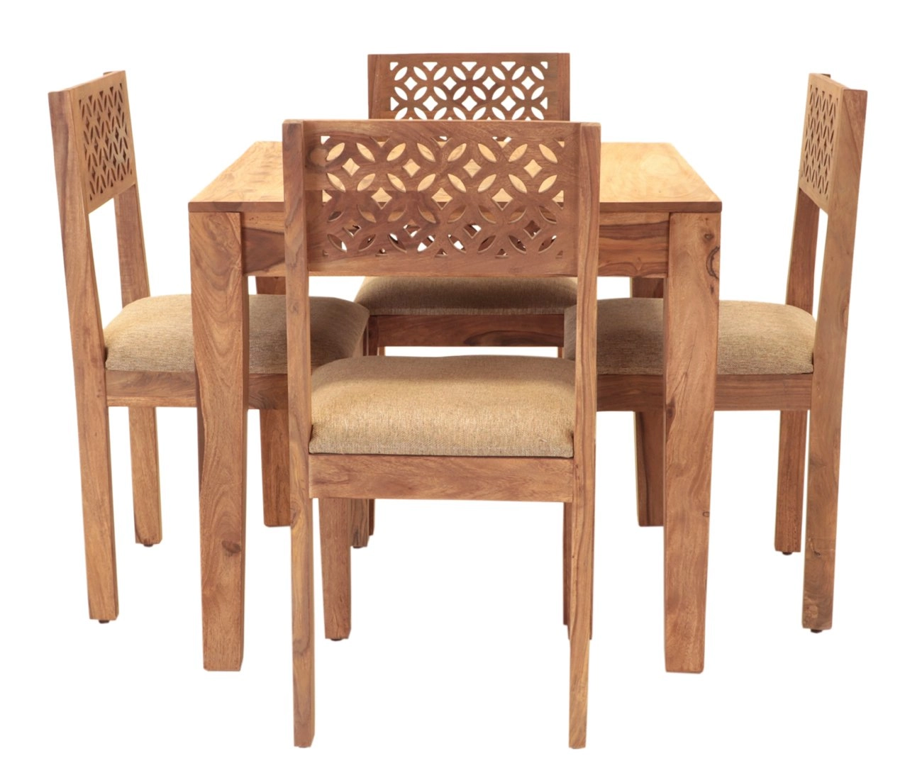 Dřevěný jídelní set pro 4 osoby z masivu palisandru je perfektním doplňkem do každé moderní či tradiční jídelny. Tento elegantní jídelní set, který je součástí kolekce MIRA, přináší do vašeho domova kousek Indie. Vyrobený z vysoce kvalitního palisandrového dřeva, které je známé svou odolností a krásnou přírodní kresbou, dřevěný jídelní set je ideální volbou pro ty, kteří hledají stylový a trvanlivý nábytek. Jídelní stůl o rozměrech 80 x 80 x 76 cm skvěle poslouží jak pro rodinné večeře, tak i pro setkání s přáteli. Doprovázený čtyřmi pohodlnými dřevěnými židlemi o rozměrech 45 x 90 x 45 cm, tento jídelní set do vašeho prostoru přináší harmonii designu a funkčnosti. Každý kousek je důkladně opracovaný, což zajišťuje nejen esteticky příjemný vzhled, ale také dlouhou životnost. Díky použití masivního dřeva si můžete být jisti, že dřevěný nábytek vydrží i ty nejnáročnější podmínky každodenního používání.