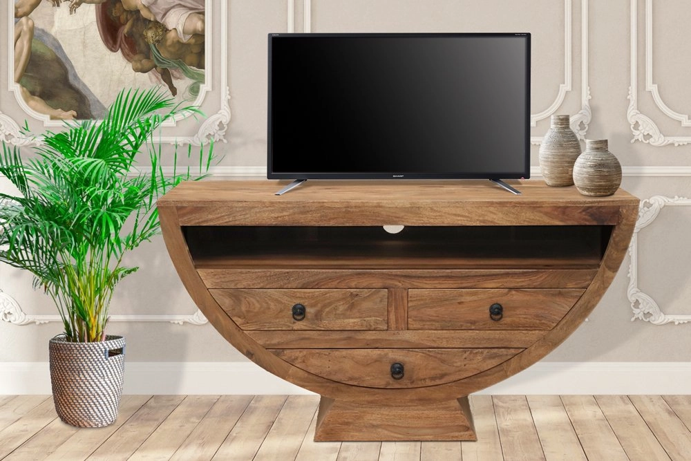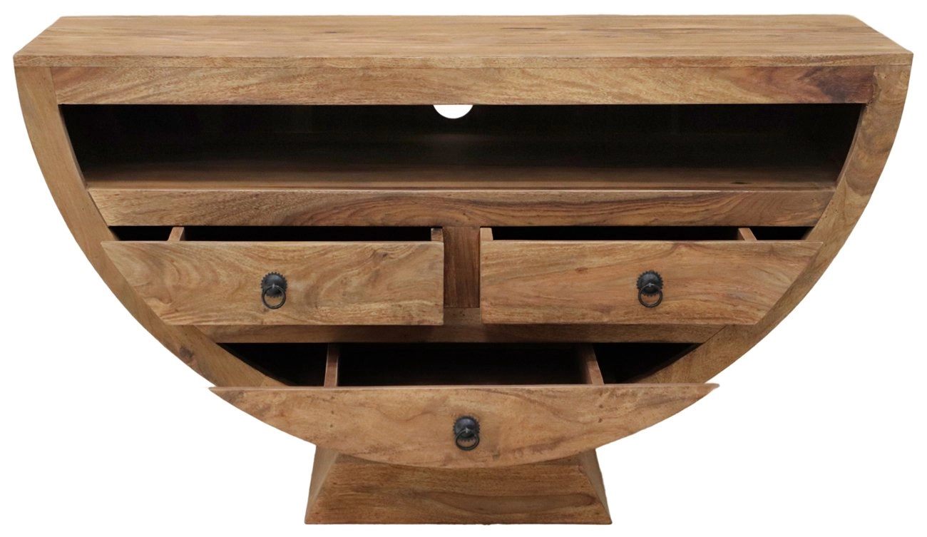 Tento televizní stolek masiv je vybaven třemi prostornými šuplíky s elegantními kovovými úchyty, které poskytují dostatek úložného prostoru pro vaše multimediální příslušenství, jako jsou dálkové ovladače, kabely či DVD disky. Jeho rozměry 120 cm na šířku, 45 cm na hloubku a 66 cm na výšku jsou ideální pro umístění i větší televize a zároveň nabízí praktické řešení pro uložení dalších doplňků.