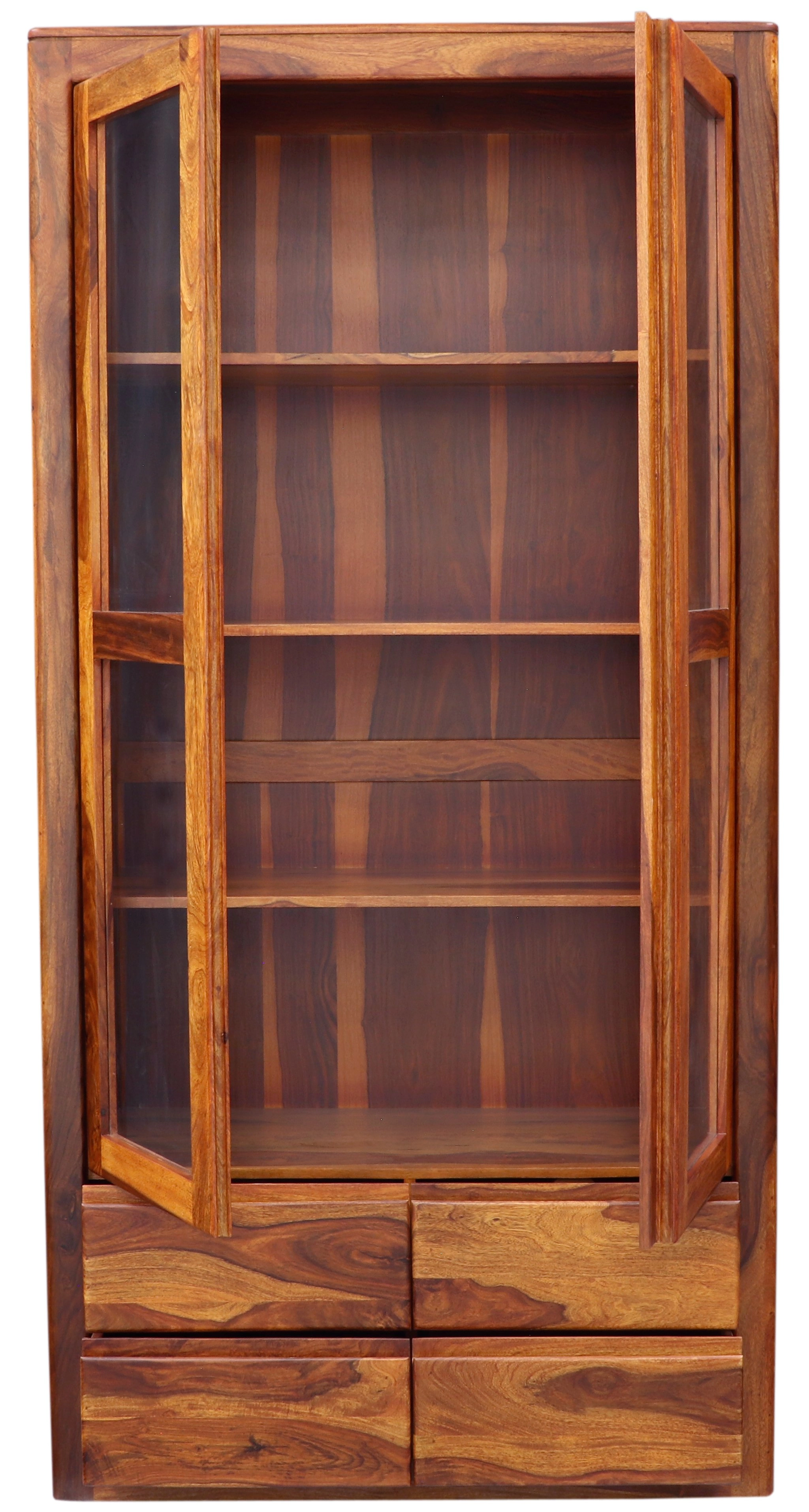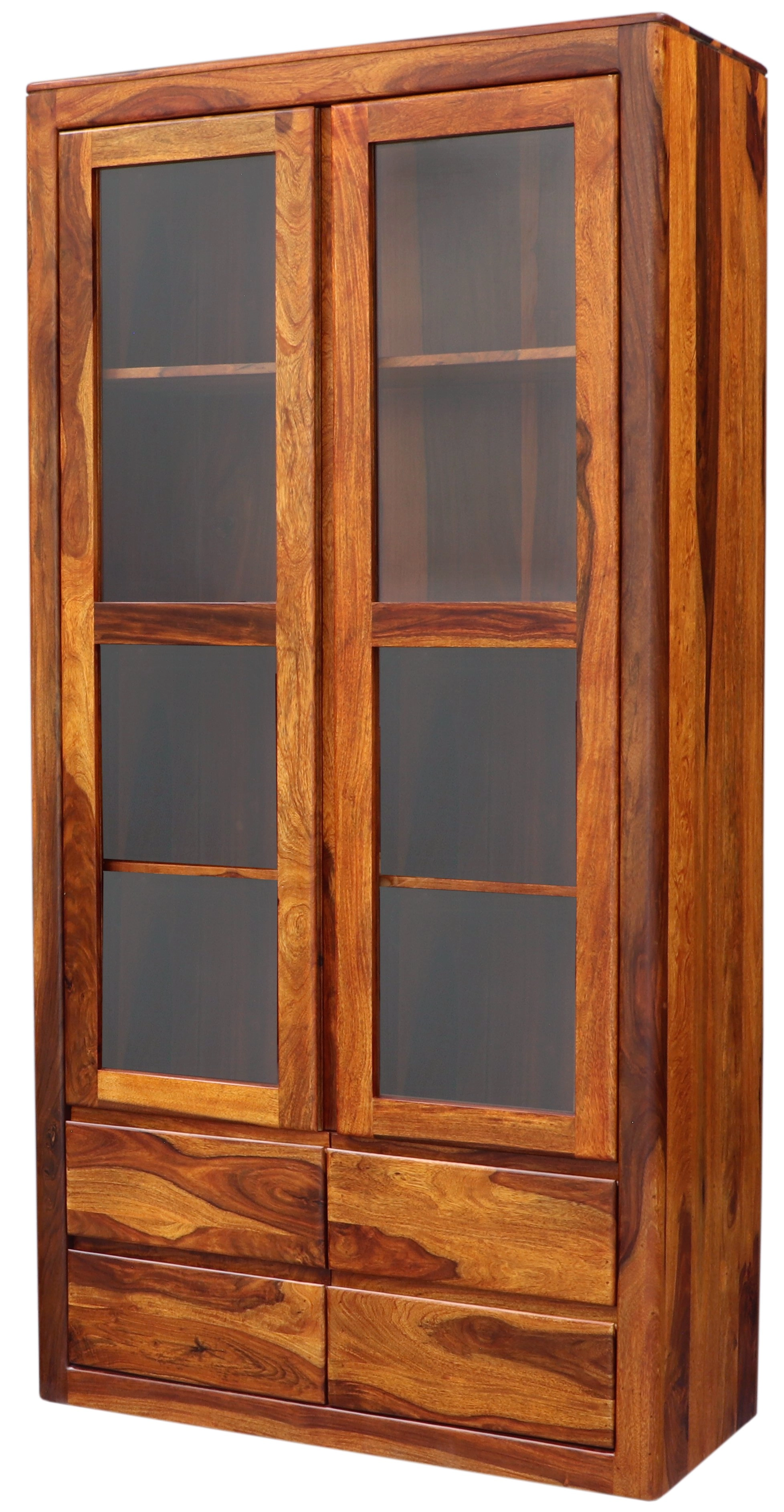 Vitrína prosklená disponuje kombinací čtyřech šuplíků, třech polic a dvěma skříňkami s prosklenými dvířky, což zajišťuje dostatek úložného prostoru pro všechny vaše cennosti, knihy, dekorace nebo porcelán. Skleněné části dodávají vitríně lehkost a umožňují vystavit vaše nejmilejší kousky tak, aby na ně bylo dokonale vidět. Masivní palisandrové dřevo, známé svou odolností a estetickou hodnotou, dává nábytku neotřelý vzhled, který dodá každému interiéru punc luxusu.