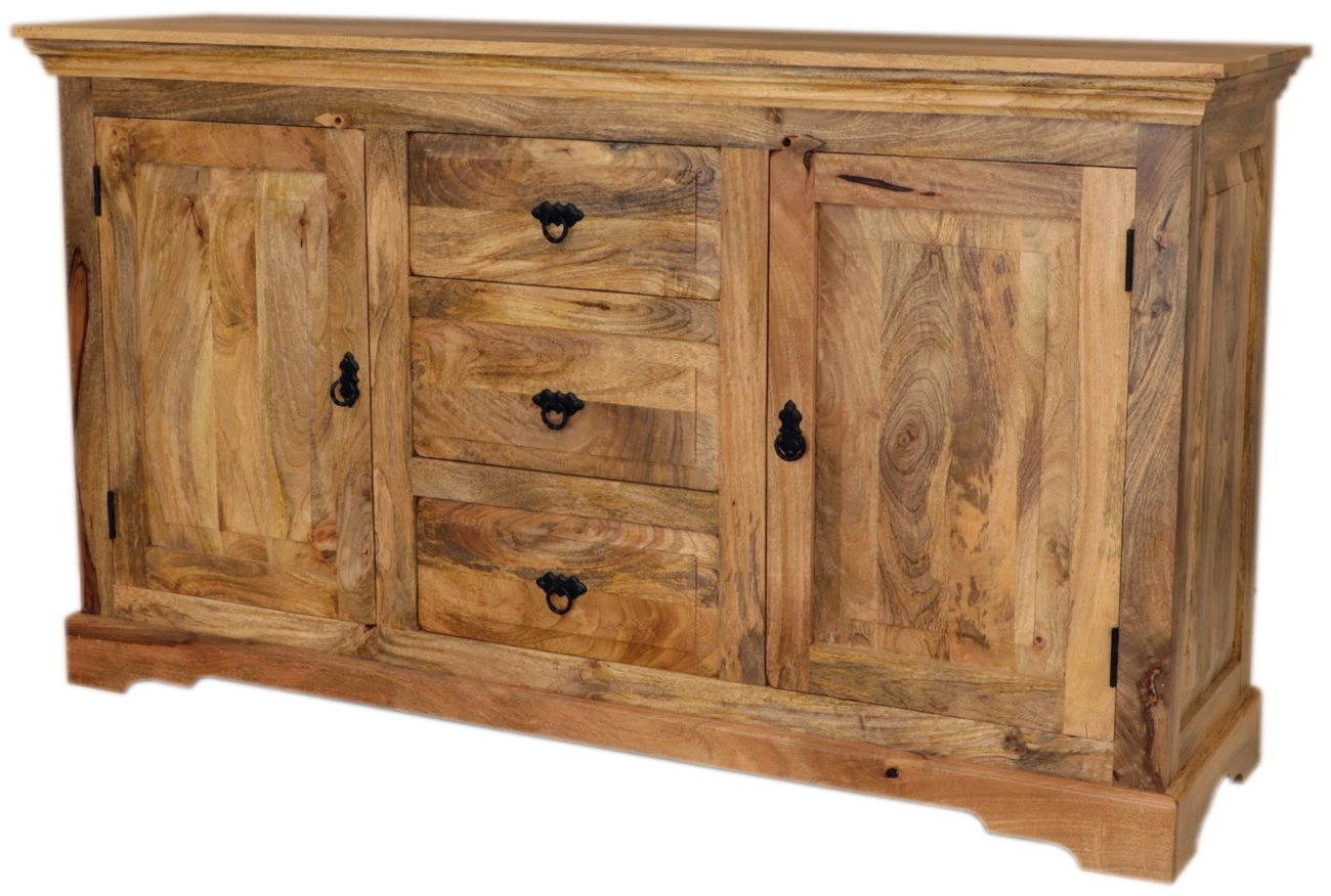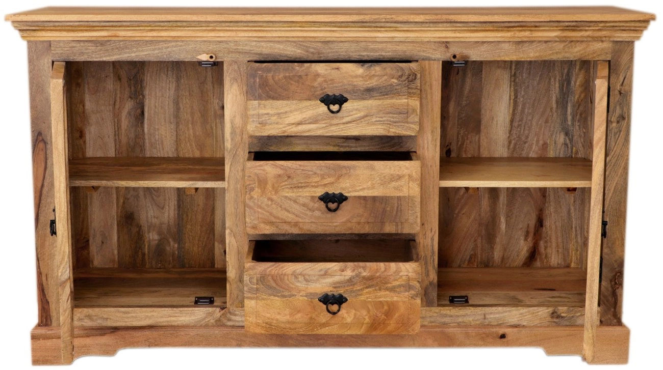 Tato masivní komoda má impozantní rozměry se šířkou 160 cm, hloubkou 45 cm a výškou 90 cm, což poskytuje dostatek úložného prostoru pro různé potřeby. S třemi prostornými zásuvkami a dvěma dvířky, které skrývají dvě police, nabízí komoda dostatek místa pro vaše osobní věci, textilie či dekorace. Její robustní konstrukce a detailní zpracování zaručují, že se stane trvalým a hodnotným doplňkem vašeho interiéru.