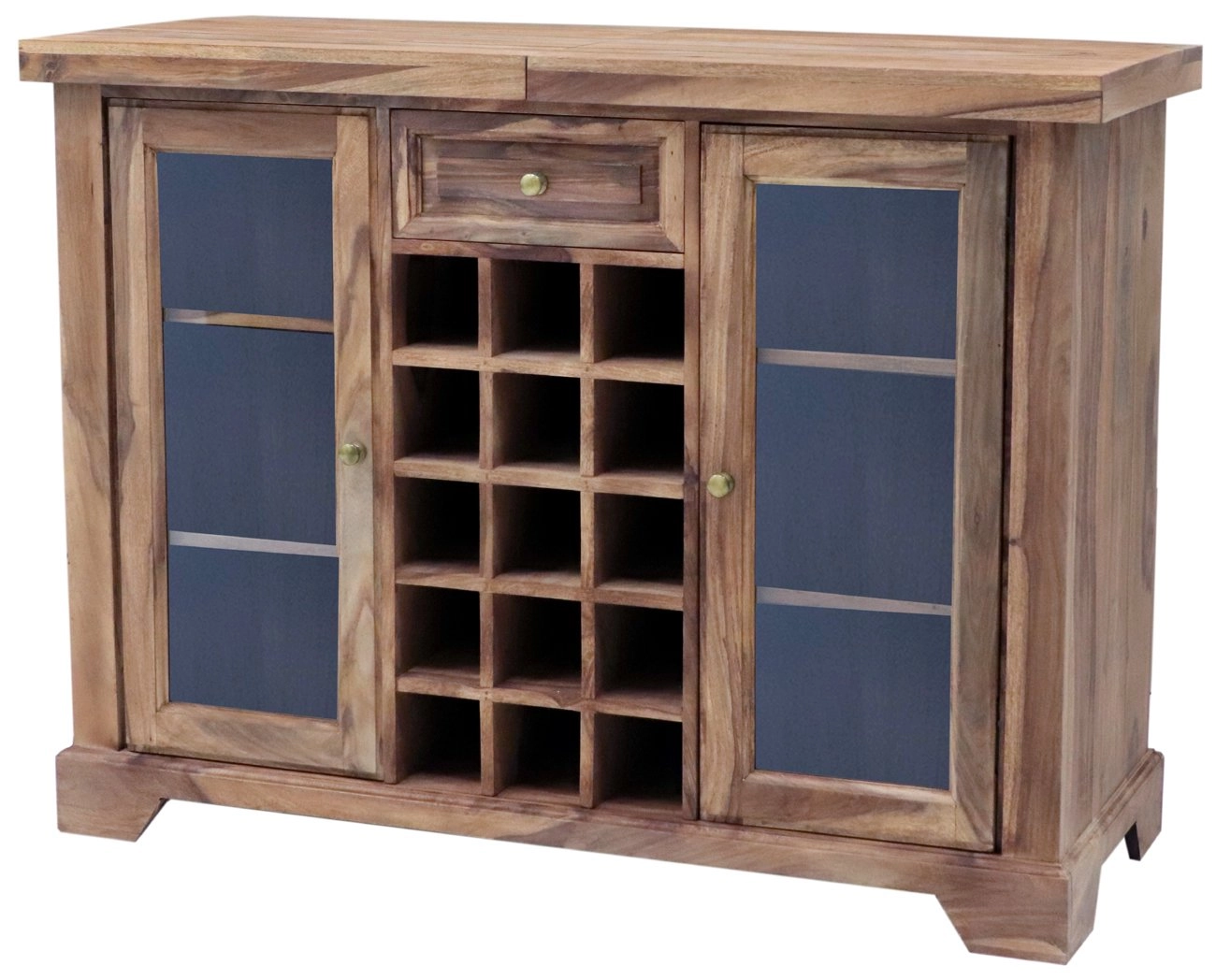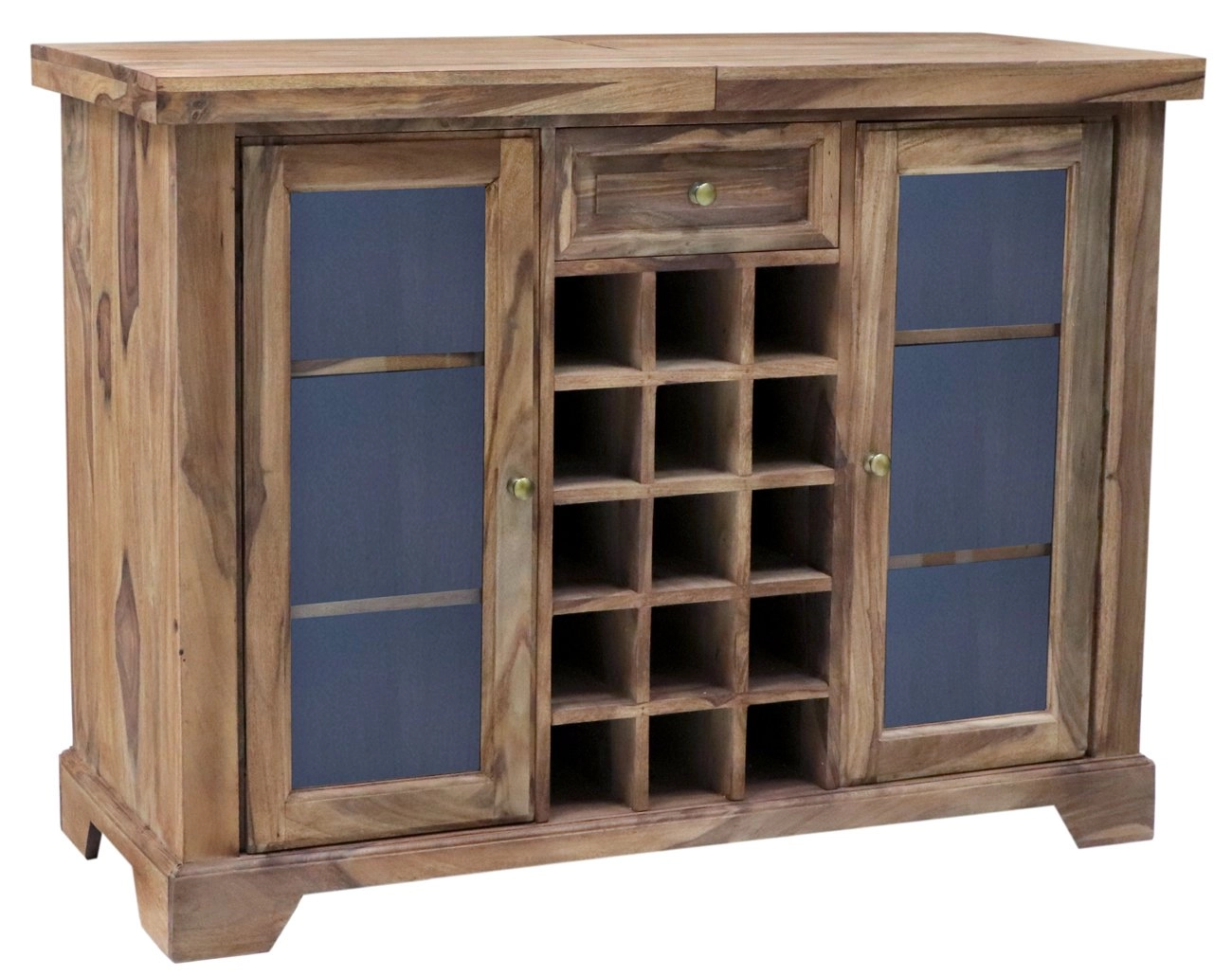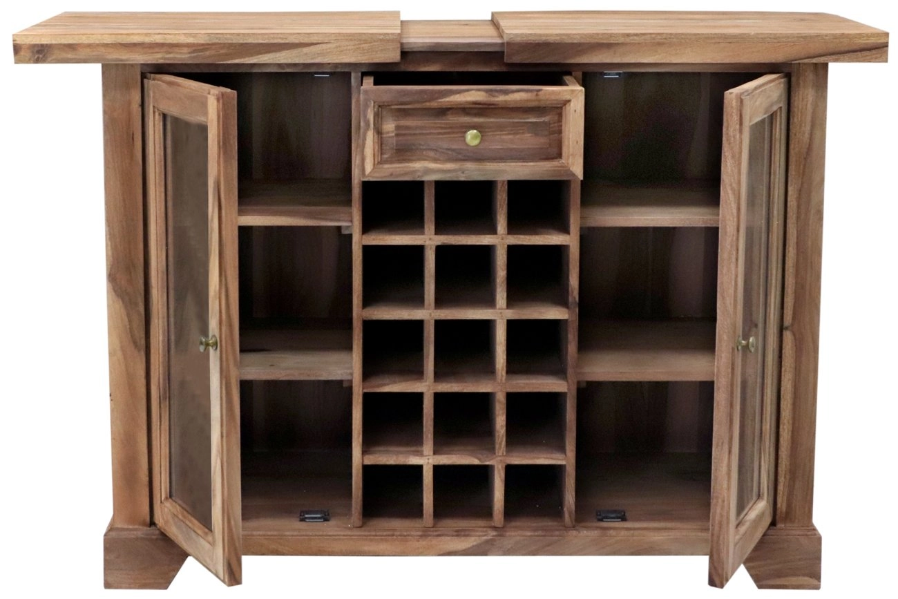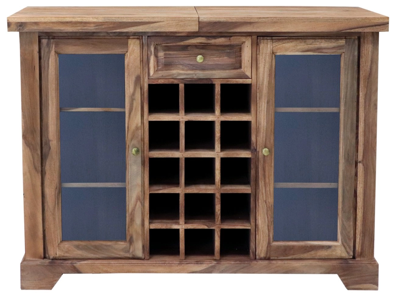 Barová skříň je navržena tak, aby poskytovala dostatek úložného prostoru pro vaše oblíbené lahve a sklenice díky integrovaným regálům a praktickým stojanům na víno. Je ideální nejen pro milovníky nápojů, ale i pro ty, kteří ocení kombinaci krásy a funkčnosti masivního nábytku. Tento domácí bar může být středobodem konverzací při setkáních s přáteli a rodinou.