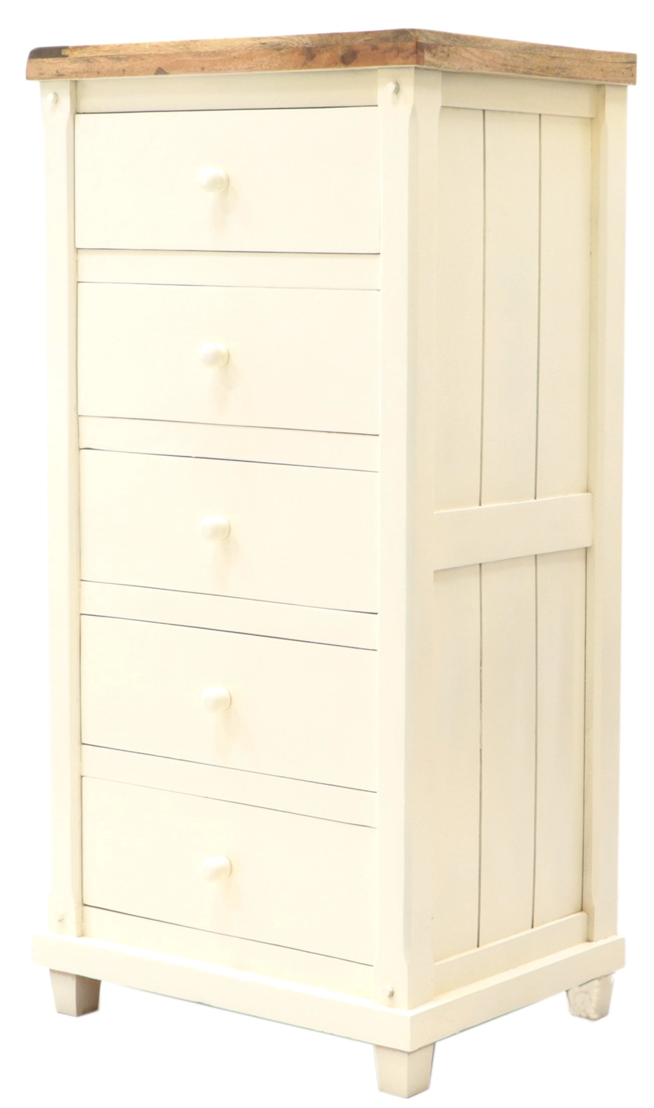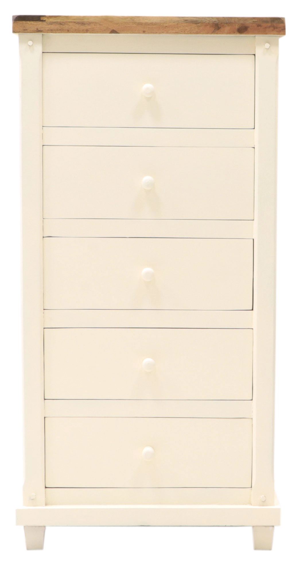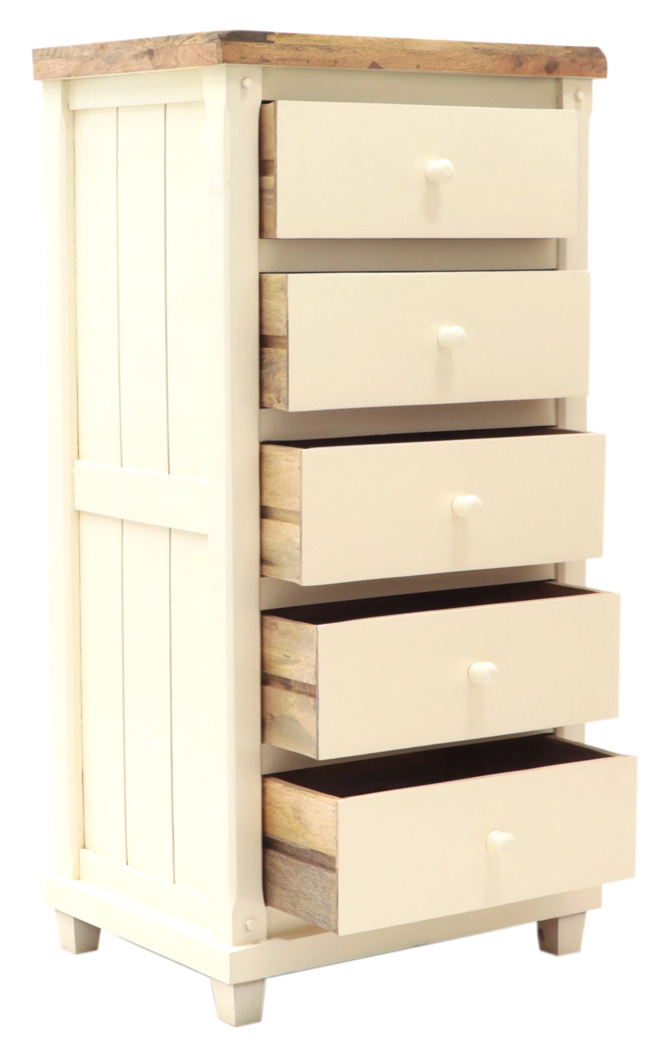 Mit fünf geräumigen Schubladen bietet die hohe Massivkommode ausreichend Platz für die Aufbewahrung von Kleidung, Dokumenten oder Haushaltsgegenständen. Die Maße 60 cm in der Breite, 45 cm in der Tiefe und 120 cm in der Höhe sorgen dafür, dass sie auch in kleinere Räume passt, ohne wuchtig zu wirken.
