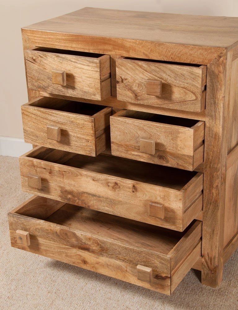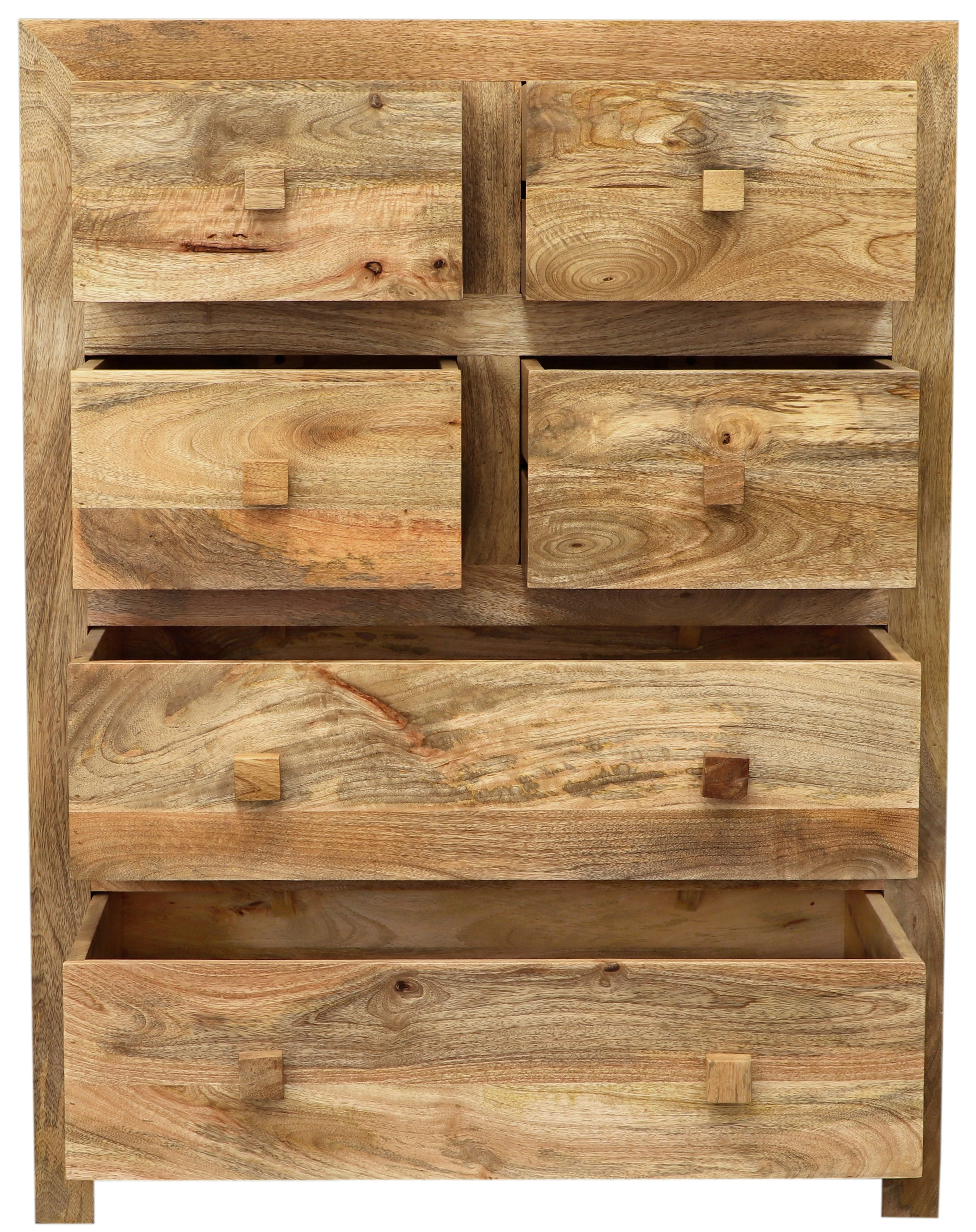 S rozměry 90 cm na šířku, 45 cm na hloubku a 120 cm na výšku se tato komoda perfektně hodí do různě velkých prostorů. Je ideální volbou pro každého, kdo hledá nábytek do ložnice, který se spojuje s estetikou a praktickým využitím. Šest prostorných zásuvek umožňuje snadné uspořádání oblečení, ložního prádla, nebo jiných osobních věcí. Povrchová úprava z masivního dřeva dodává komodě přírodní a teplý vzhled, který se snadno kombinuje s dalšími kousky nábytku.