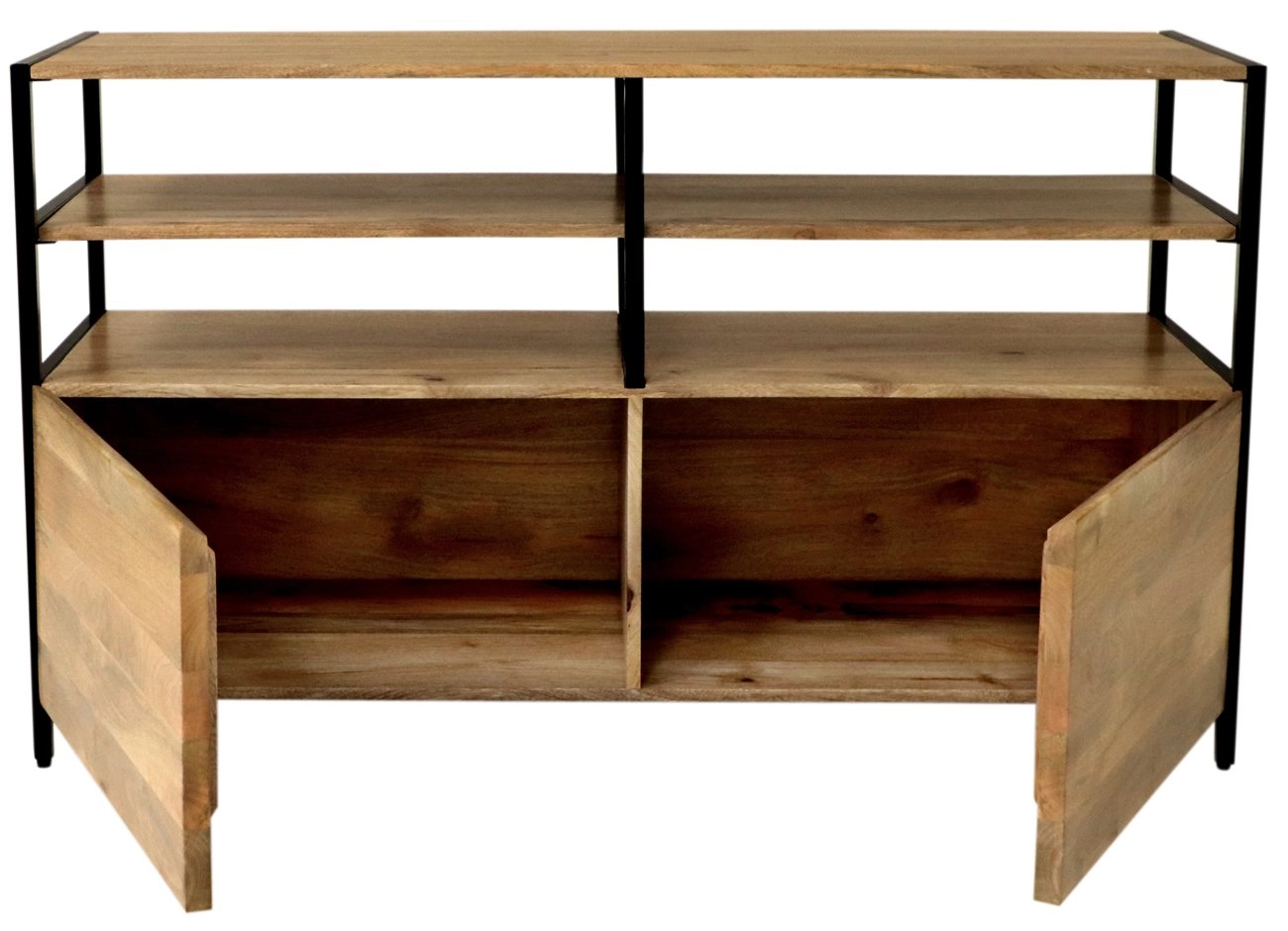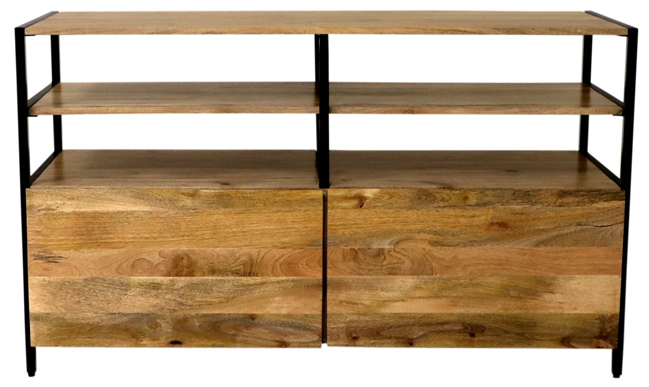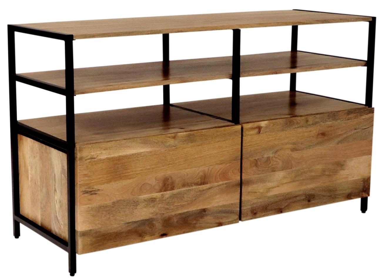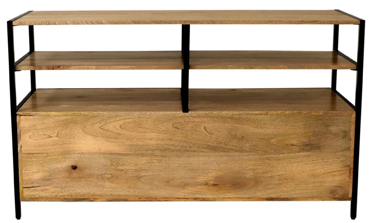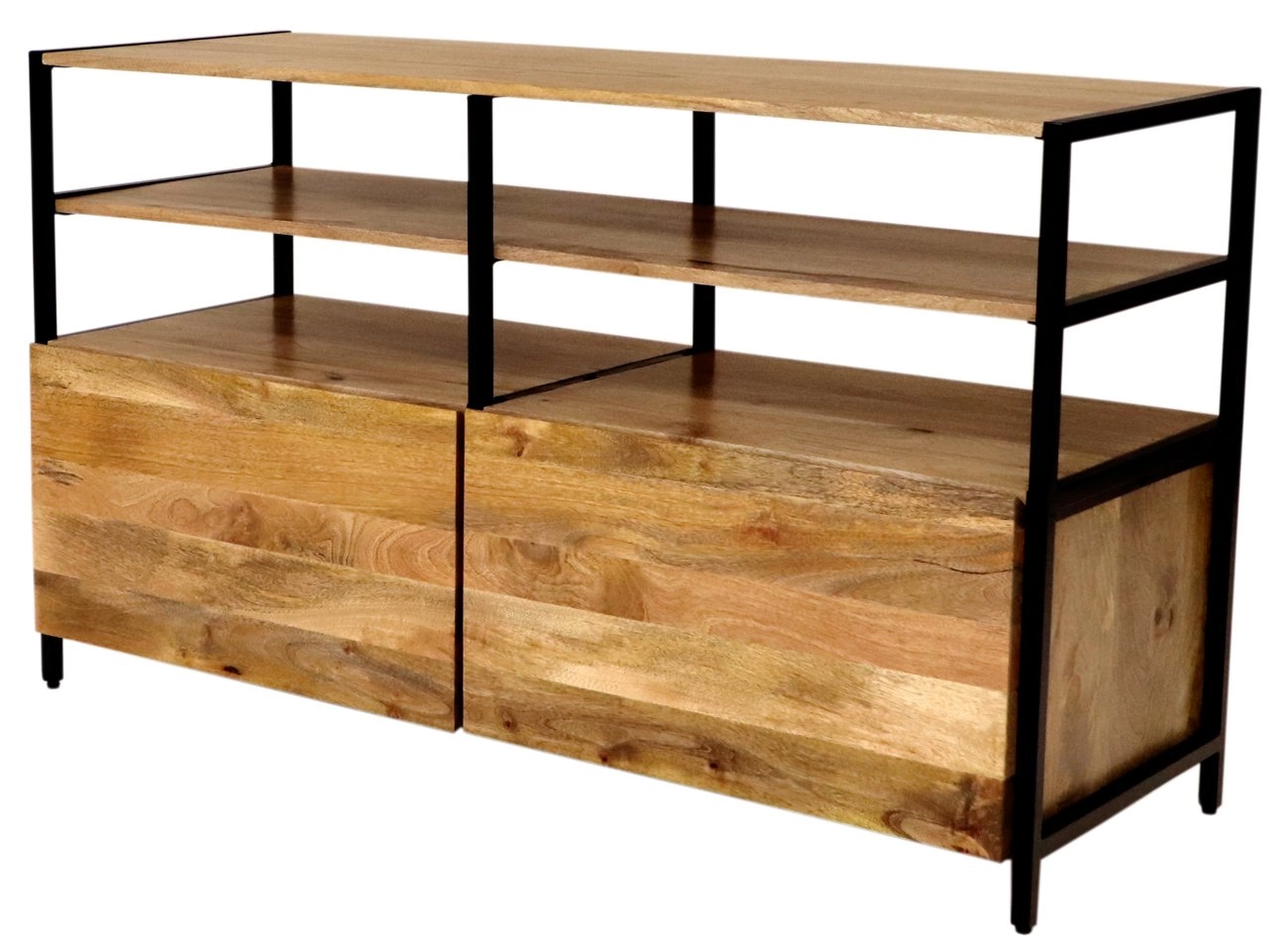 Dřevěný TV stolek s kovovou konstrukcí 130x75x45 cm z kolekce GITA je nádherným příkladem spojení elegance s průmyslovým designem. Tento dřevěný TV stolek, pečlivě vyrobený z kvalitního mango dřeva pocházejícího z Indie, kombinuje moderní prvky s přirozenou krásou masivního dřeva. Robustní kovová konstrukce poskytuje potřebnou stabilitu a dodává nábytku industriální vzhled, který okamžitě zaujme.