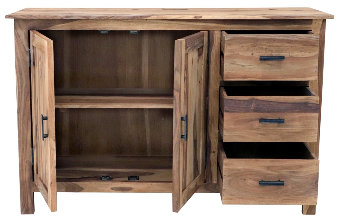 S šířkou 120 cm, hloubkou 45 cm a výškou 90 cm nabízí dostatek úložného prostoru v podobě tří prostorných zásuvek a dvou dvířek. Její účelnost oceníte jak v předsíni pro uskladnění obuvi a doplňků, tak v obývacím pokoji pro uložení knih, dokumentů či jiných cenností. Svým exotickým vzhledem dřevěná komoda z masivního palisandru přinese do vašeho domova kousek indické elegance.