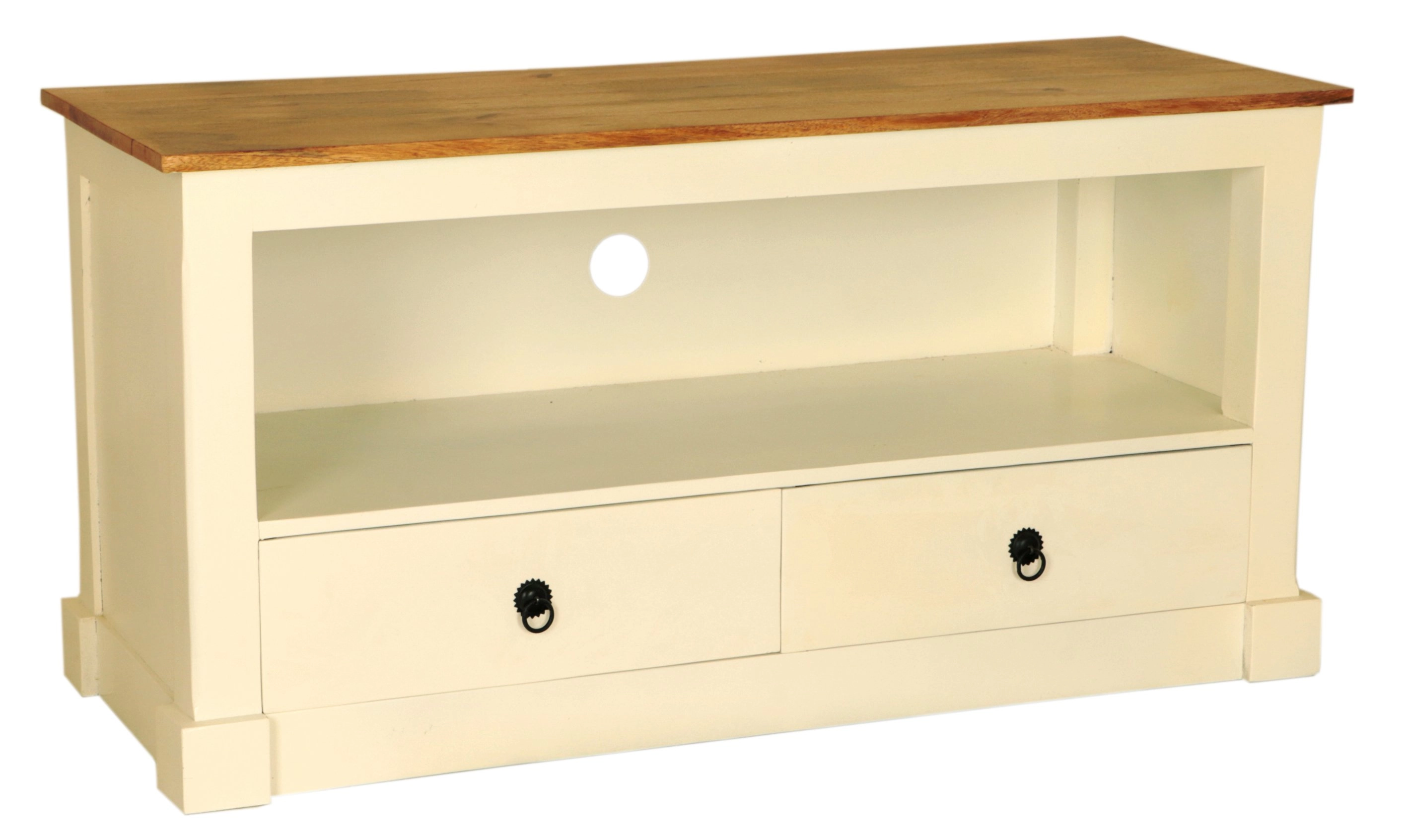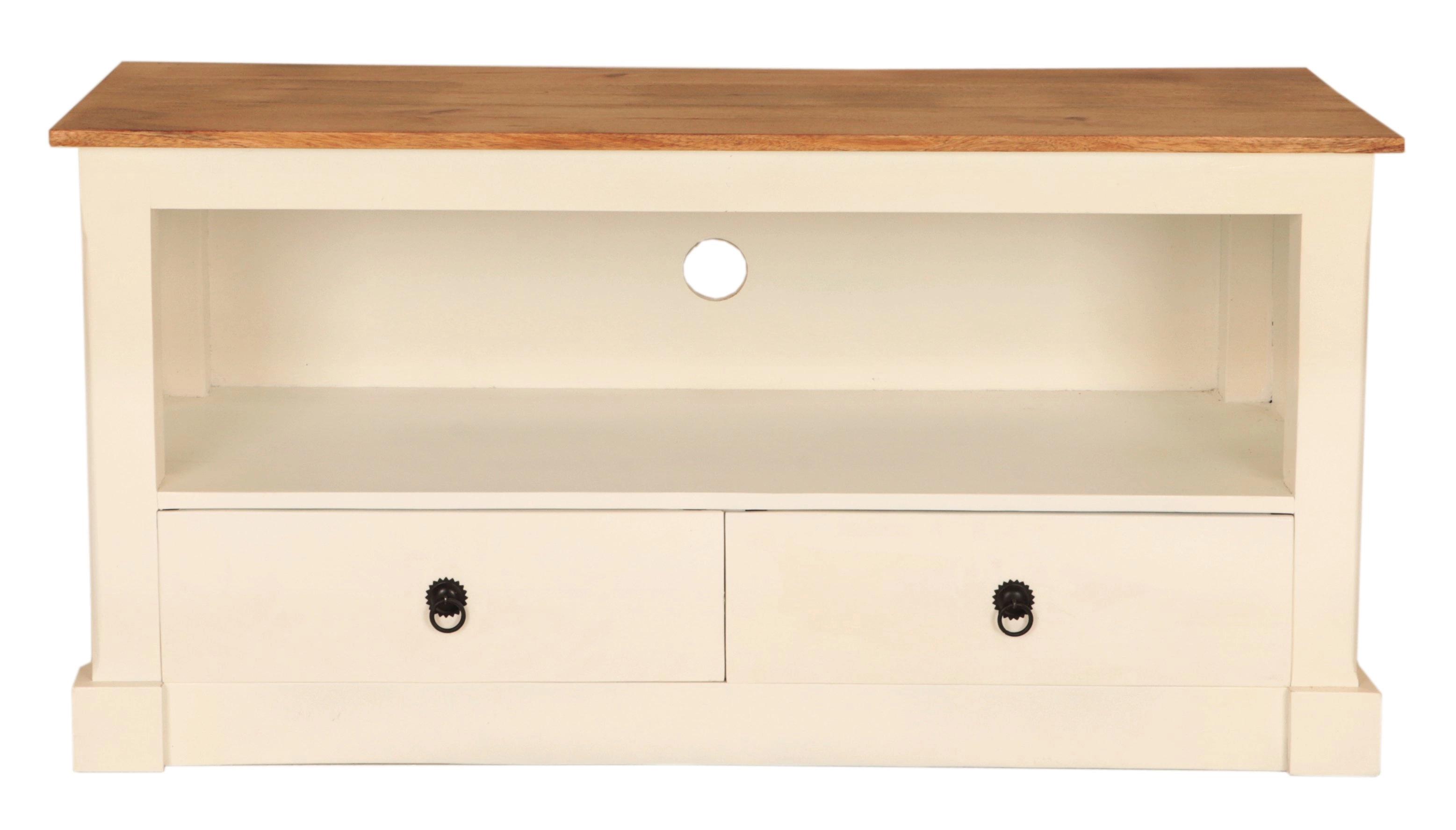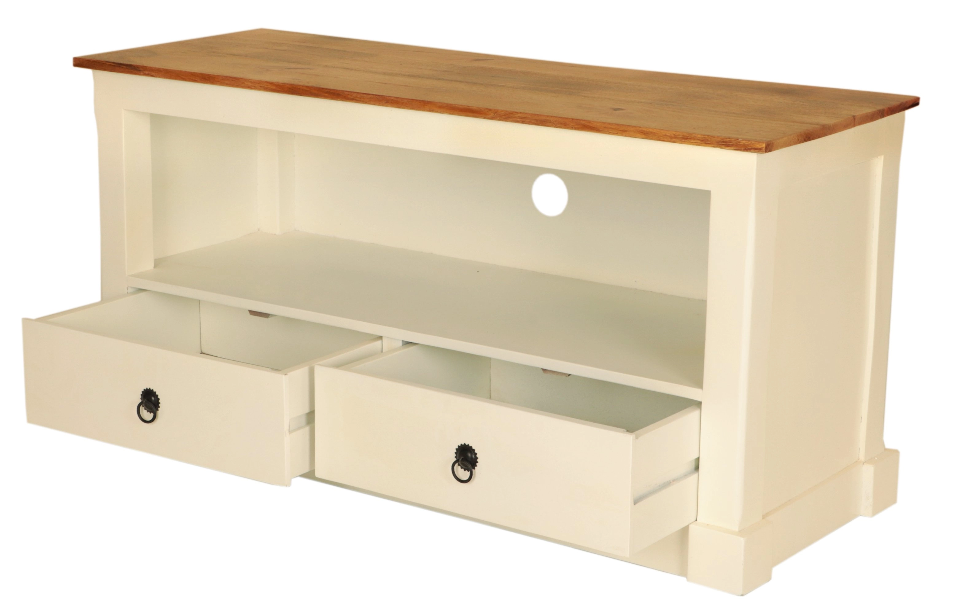 Dřevěný TV stolek z masivu mango je nejen o eleganci, ale také o funkčnosti. Disponuje dvěma prostornými šuplíky, kde můžete uložit dálkové ovladače, DVD, hry nebo jiné drobnosti, které chcete mít po ruce, ale nechcete je mít stále na očích. Navíc nabízí velkorysý odkládací prostor pod šuplíky, kde lze umístit DVD přehrávač, herní konzoli nebo reproduktory.