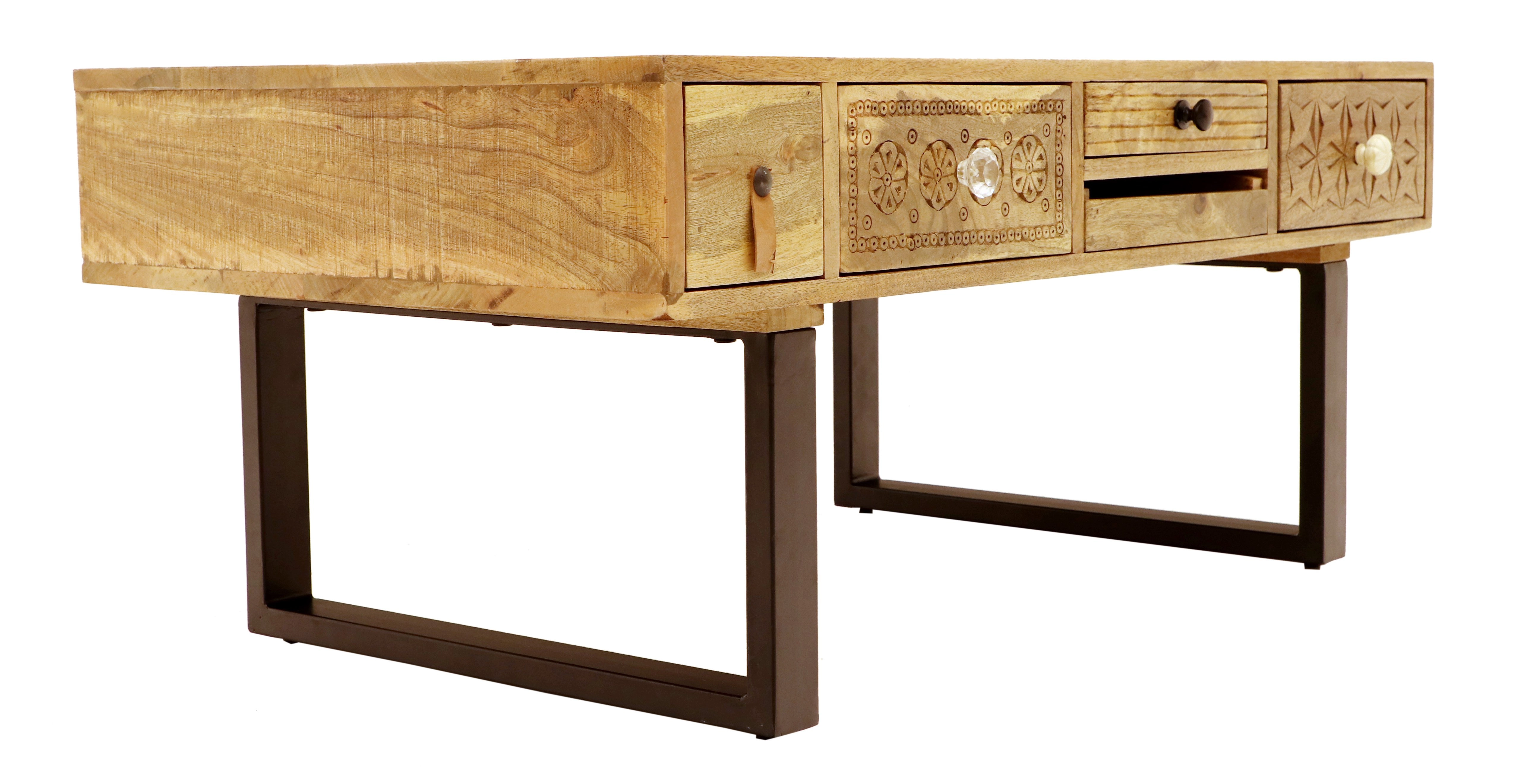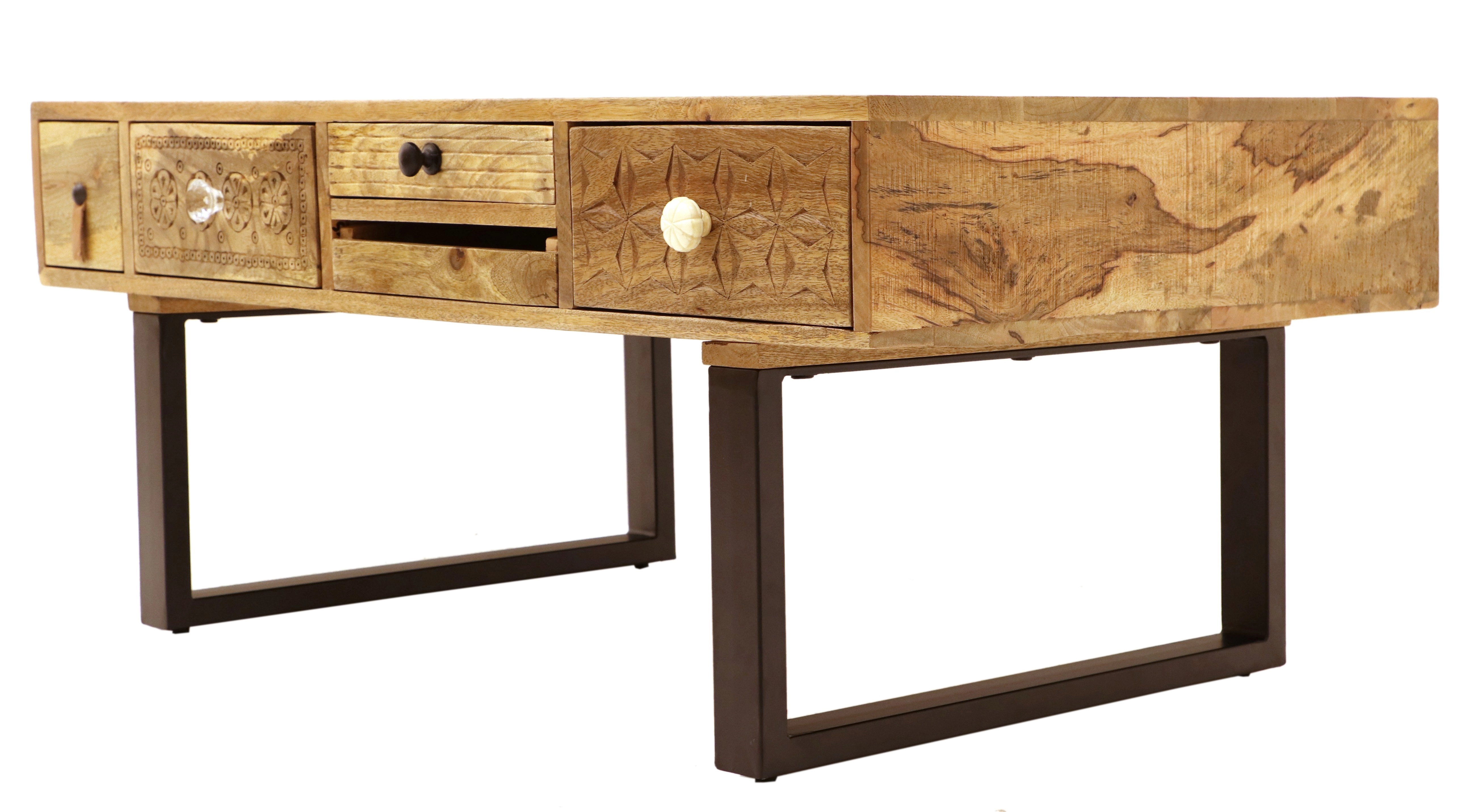 Stolek je vybaven pěti prostornými zásuvkami, které poskytují dostatek úložného prostoru pro dokumenty, časopisy nebo další kancelářské pomůcky. Kovové nohy dodávají tomuto kusu nábytku nejen stabilitu, ale i průmyslový vzhled, který skvěle doplňuje teplý tón mangového dřeva. Konferenční stolky z masivu jsou oblíbenou volbou pro ty, kdo hledají spojení elegance a praktického využití.