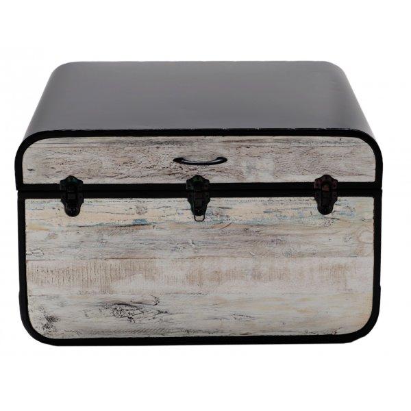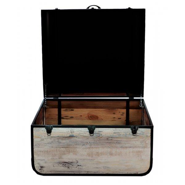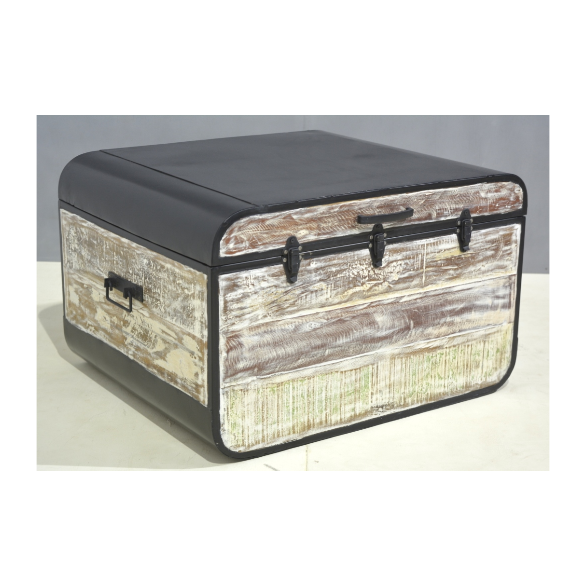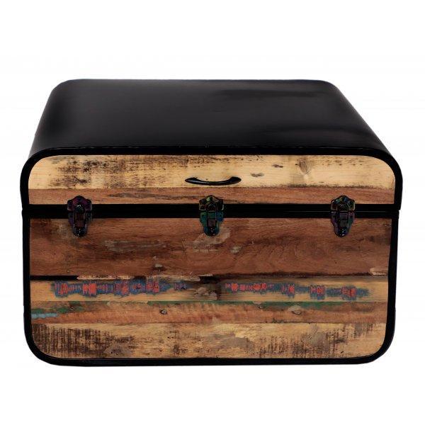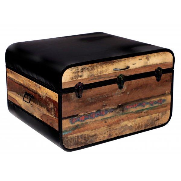 Ein Couchtisch oder Truhe, hergestellt aus recyceltem massivem Mangoholz und Metall. Die farblichen Oberflächen sind individuell für jedes Produkt, da jedes Möbelstück einzigartig ist. Die Couchtische oder Truhen aus Massivholz, die wir auf Lager haben, können Sie persönlich besichtigen oder in einem unserer angebotenen Farbtöne nach Maß bestellen! Indische koloniale Möbel aus massivem Mangoholz.