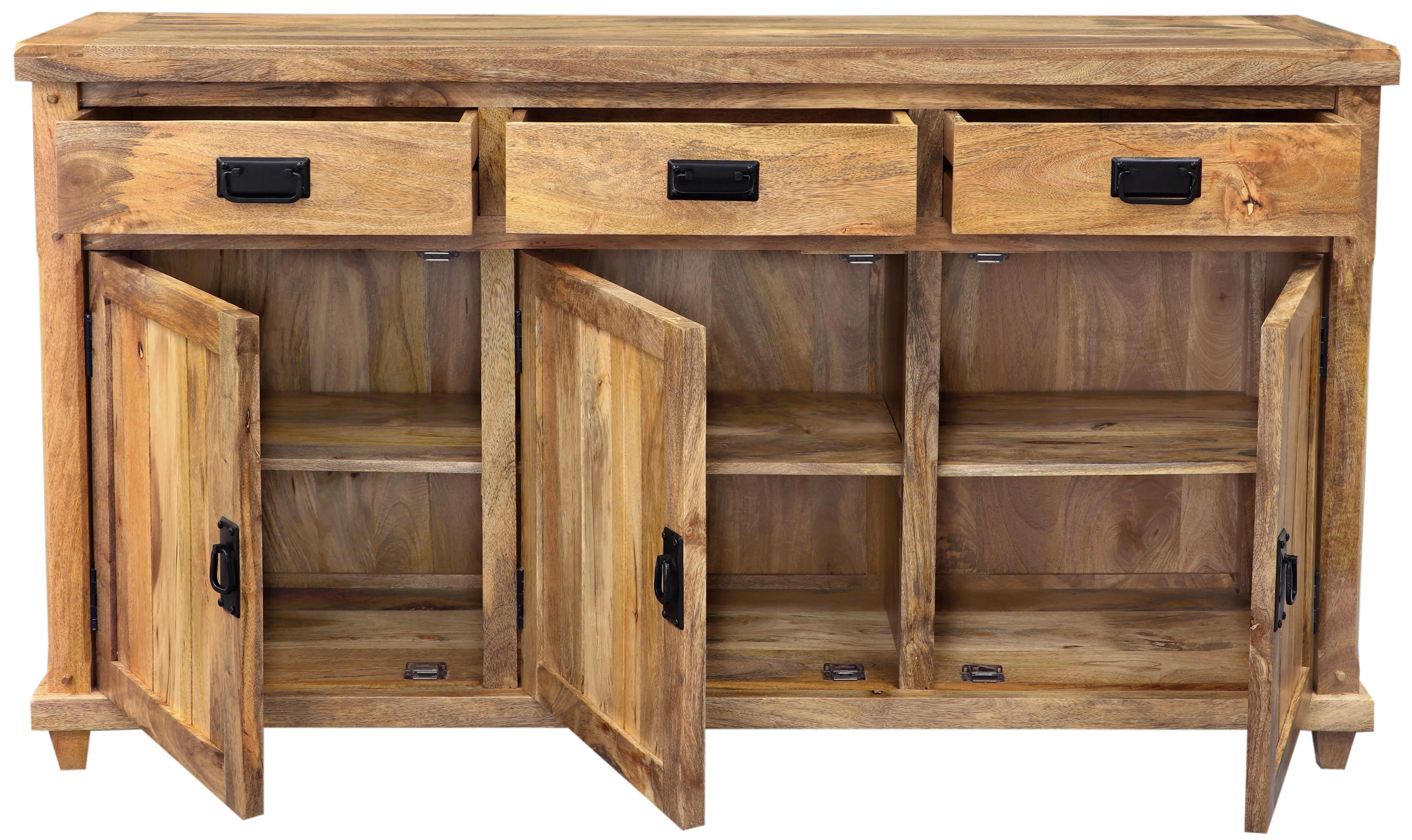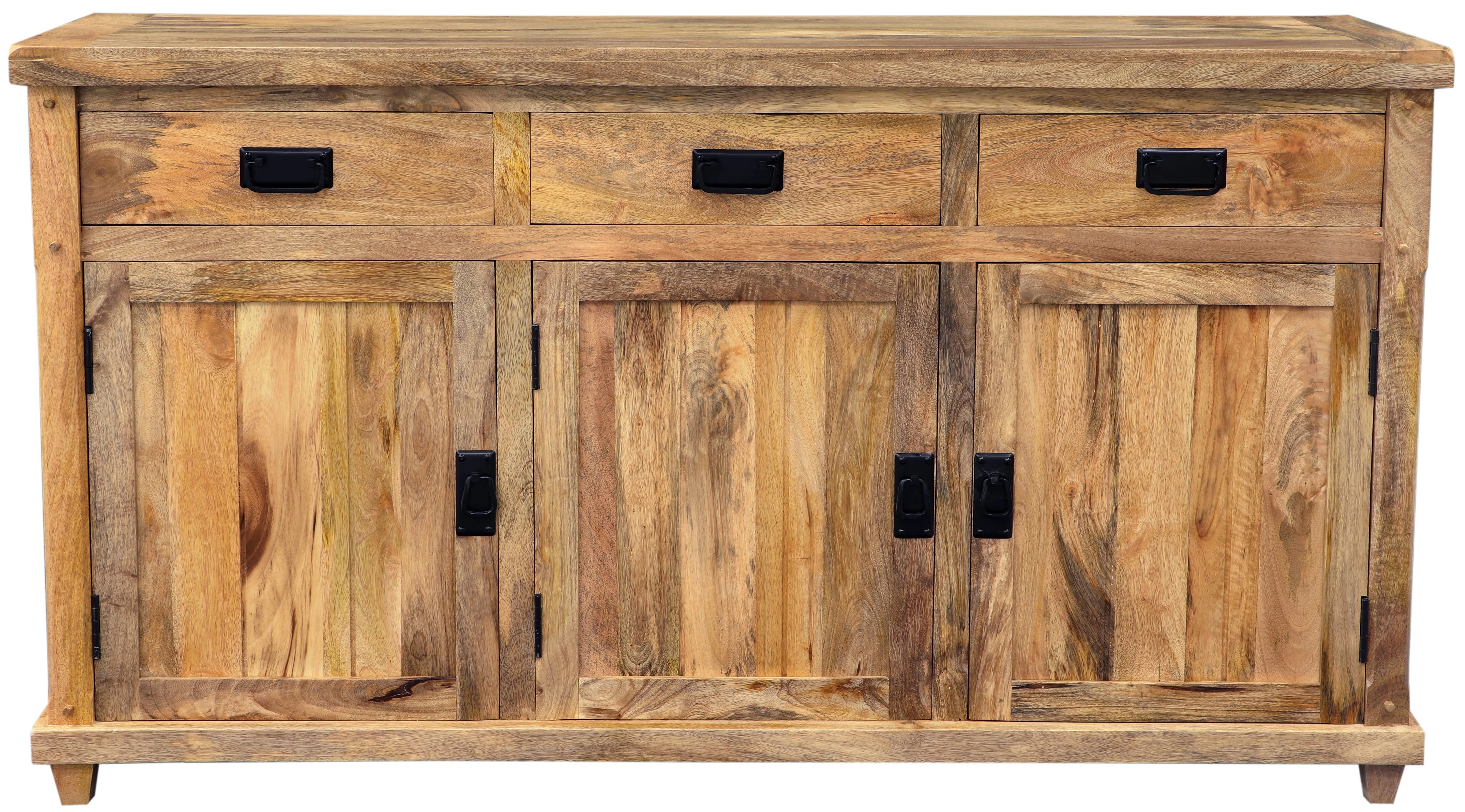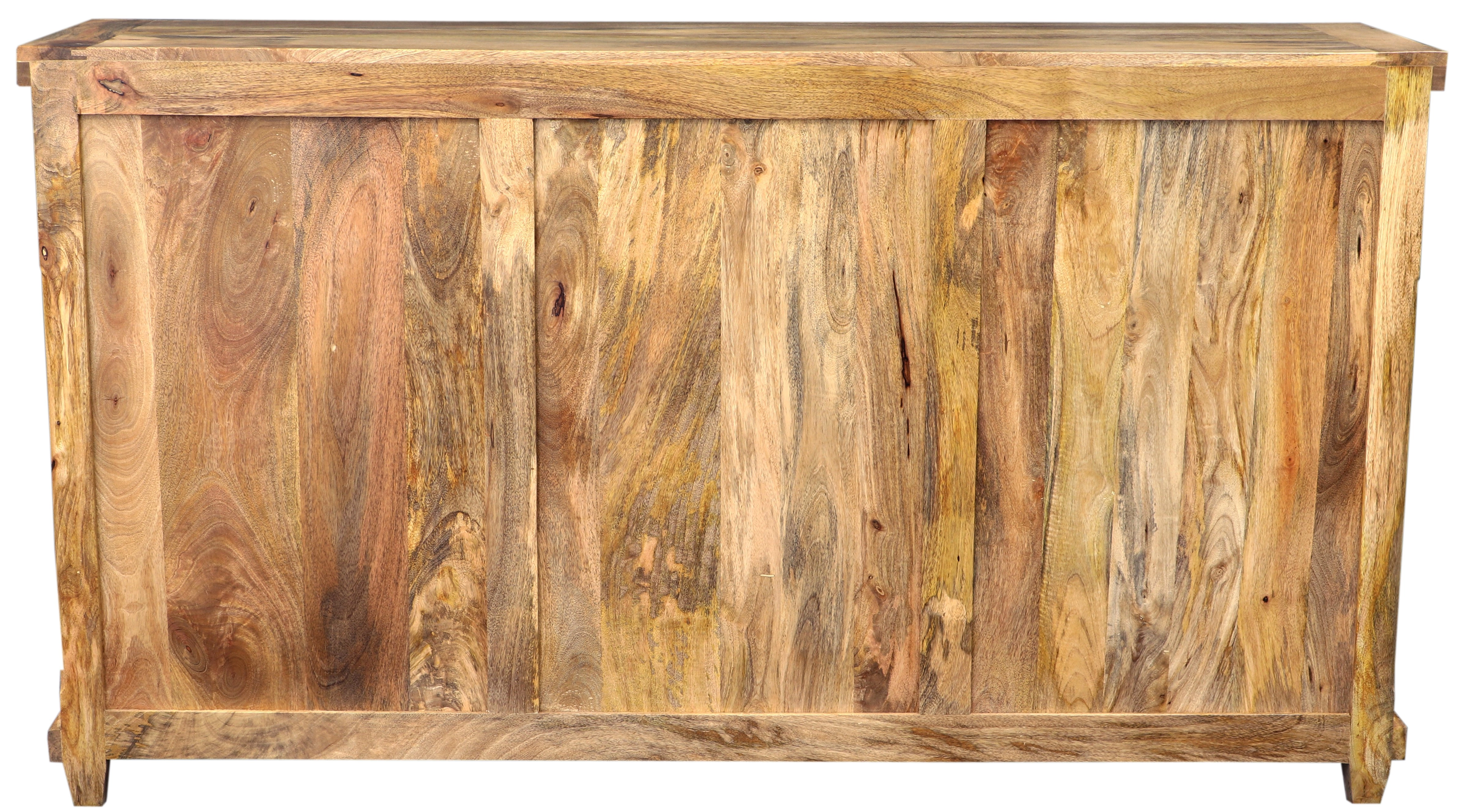 Přineste do svého domova nádech exotiky a elegance s naší Komodou z masivu mango o rozměrech 160x45x85. Tato úchvatná komoda, ručně vyrobená v Indii, je skvělým příkladem kvality a designu, které mohou obohatit váš interiér. Masivní mango dřevo dodává komodě jedinečný vzhled a přirozenou odolnost. Kombinace tří praktických zásuvek na vrchu a trojích spodních dvířek s kovovým úchytem nabízí dostatek úložného prostoru pro organizaci vašich věcí.