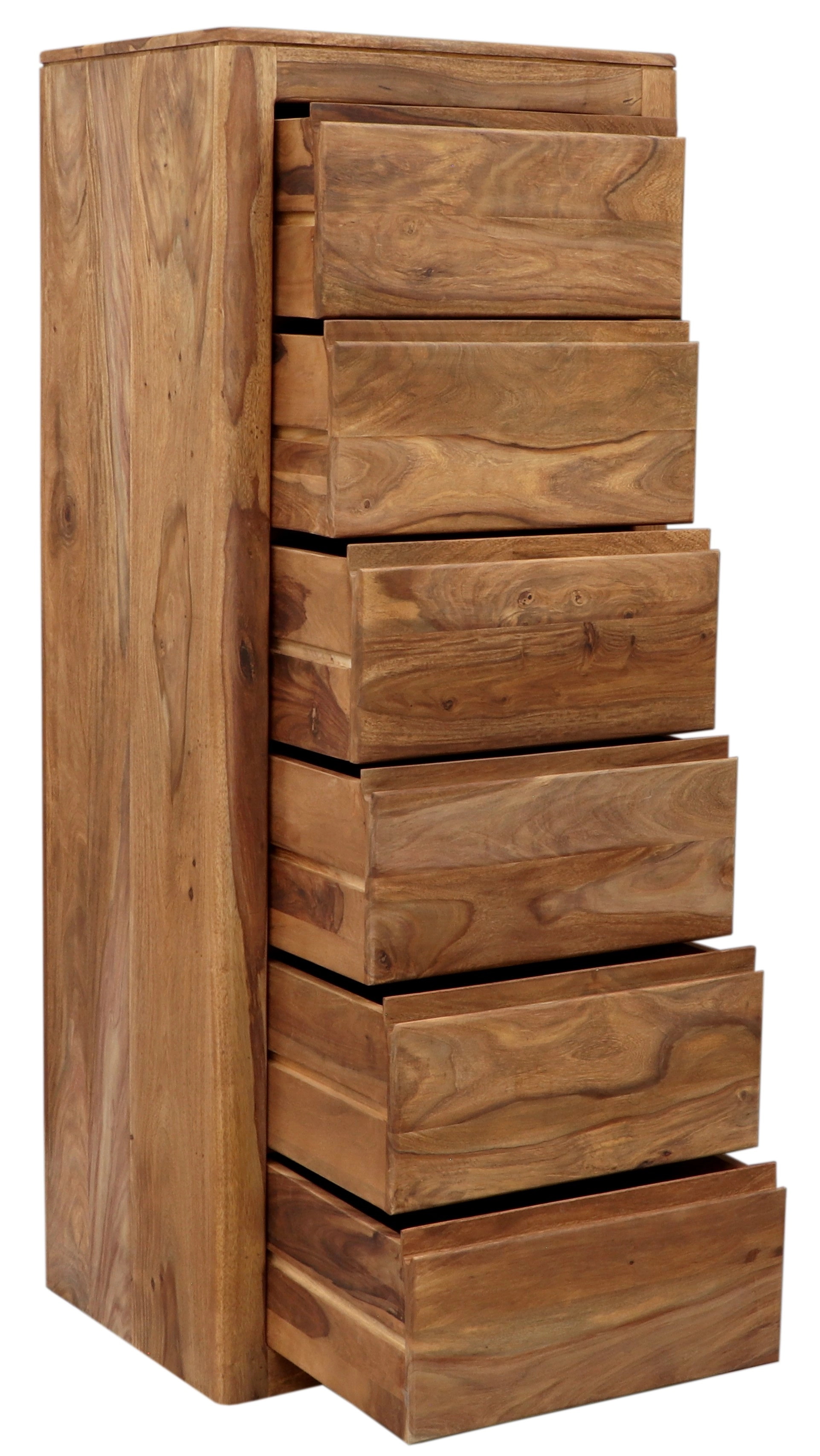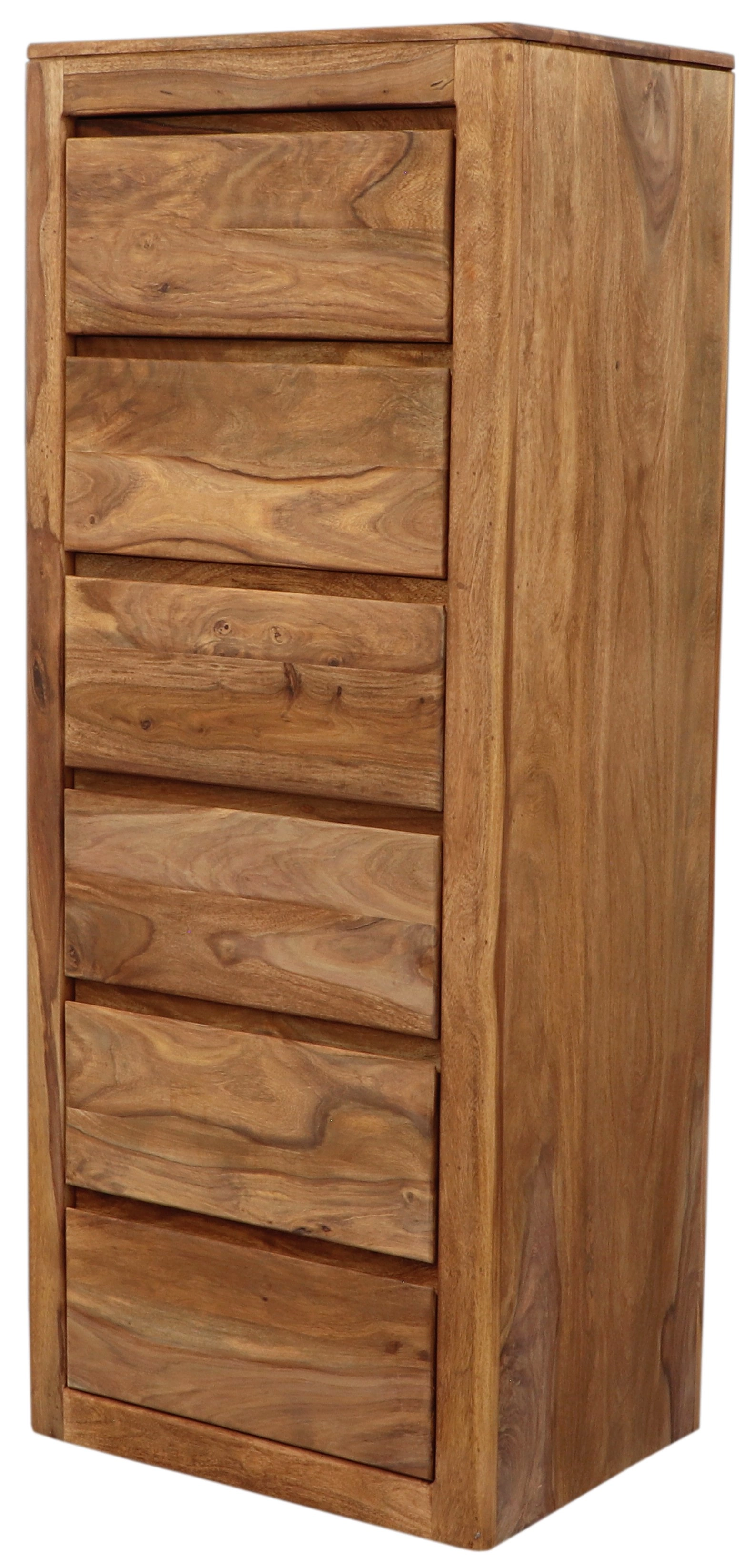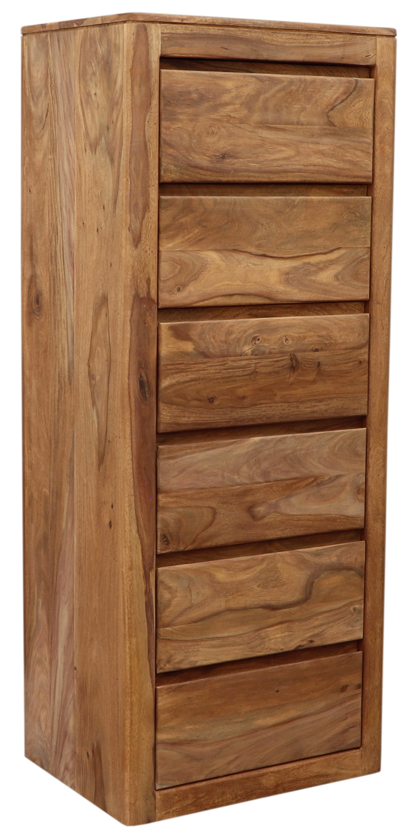 S celkovou výškou 150 cm, šířkou 60 cm a hloubkou 45 cm, tato vysoká komoda se šesti šuplíky nabízí dostatek úložného prostoru pro vaše oblečení, ložní prádlo nebo jiné nezbytné předměty. Masivní konstrukce zajišťuje dlouhou životnost, takže se můžete těšit z její krásy po mnoho let. Dřevo palisandru se vyznačuje svou tvrdostí, což znamená, že komoda odolává každodennímu opotřebení a zachovává si svůj původní vzhled.