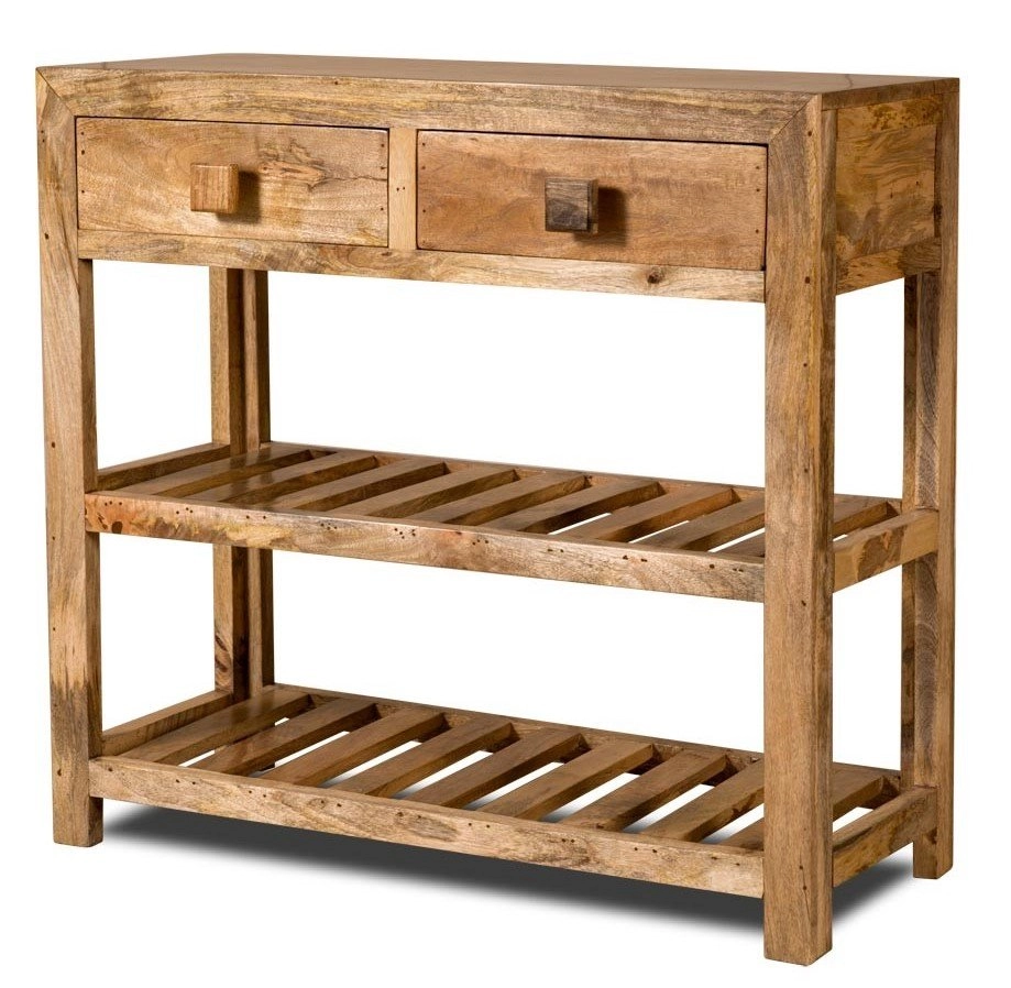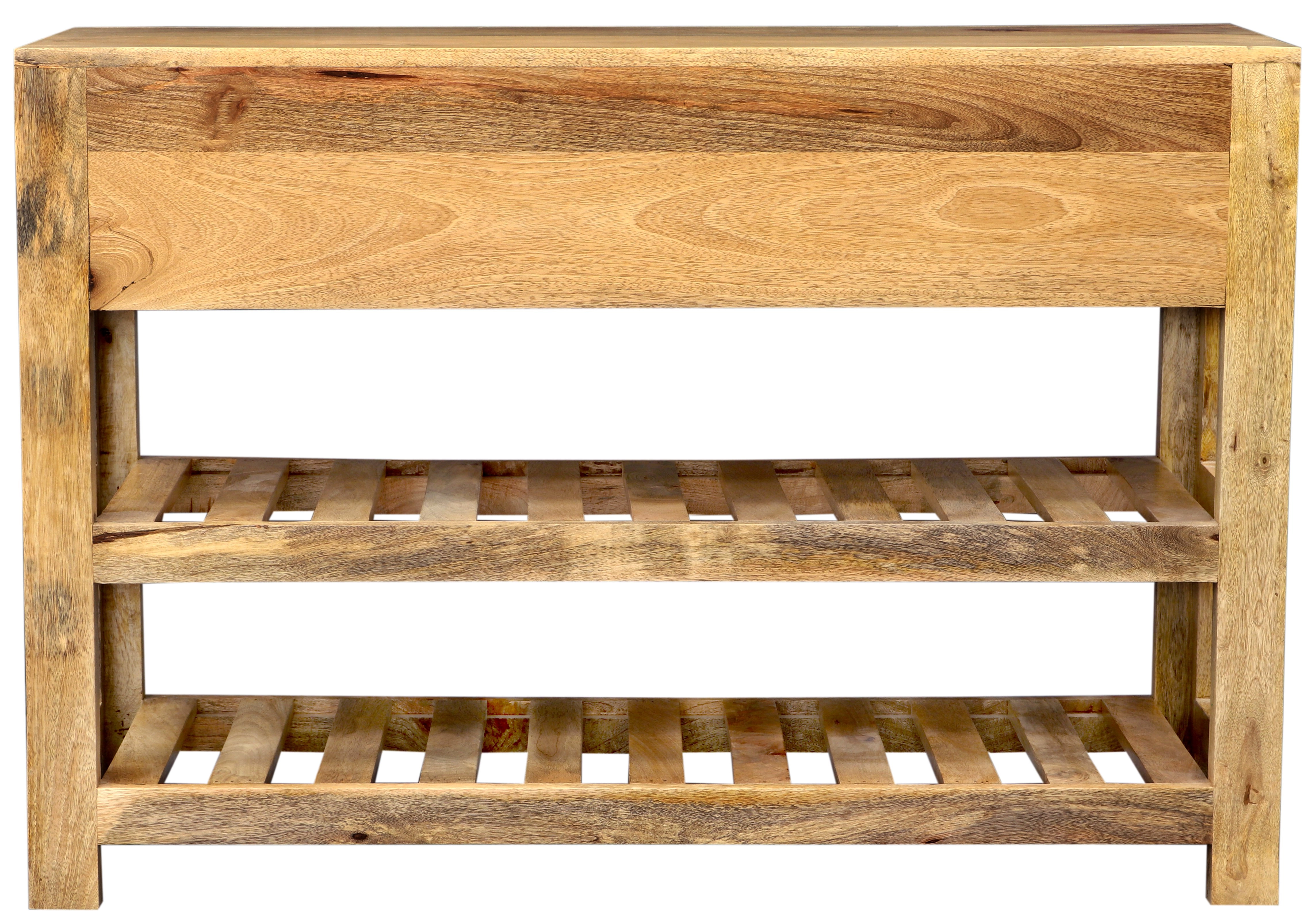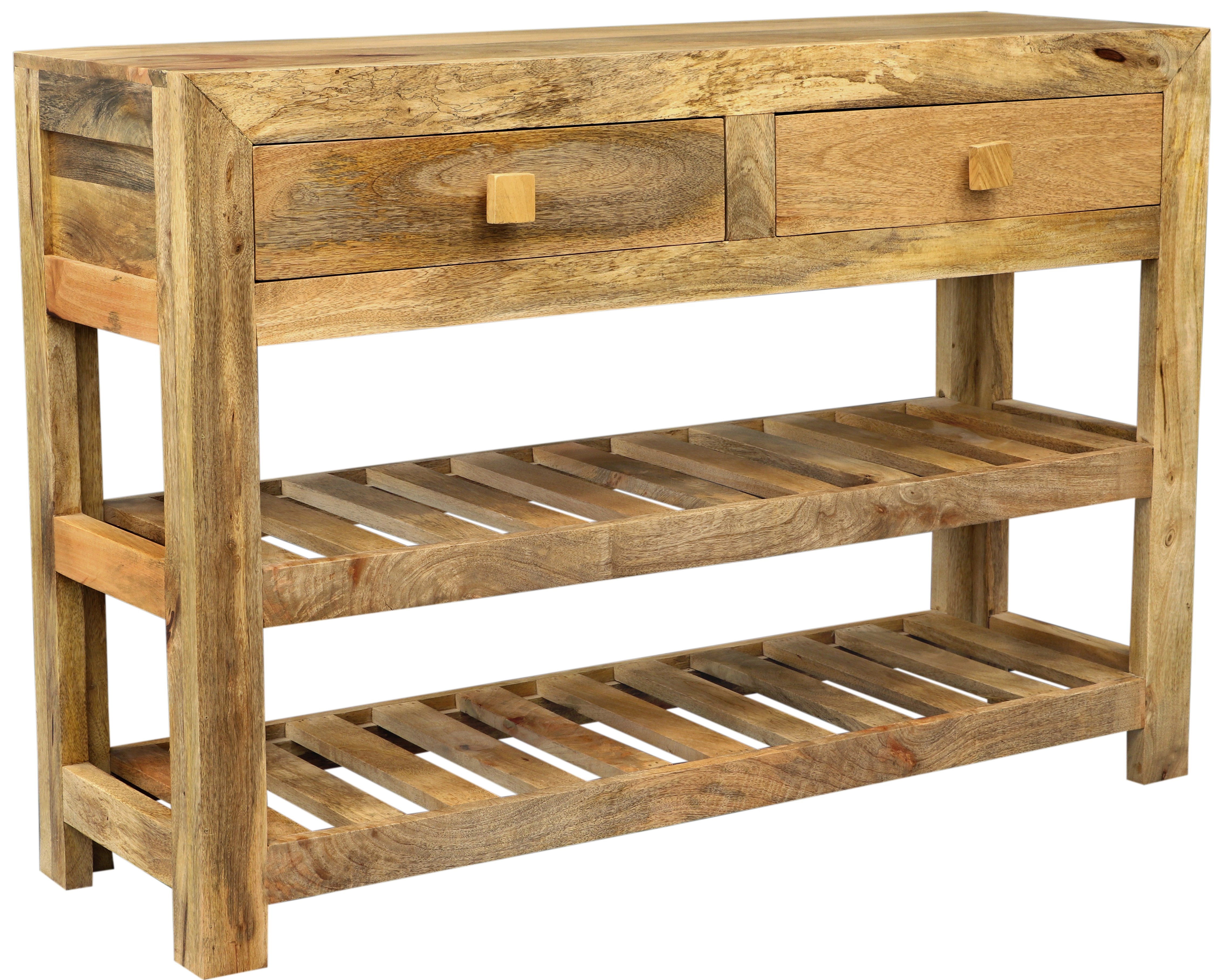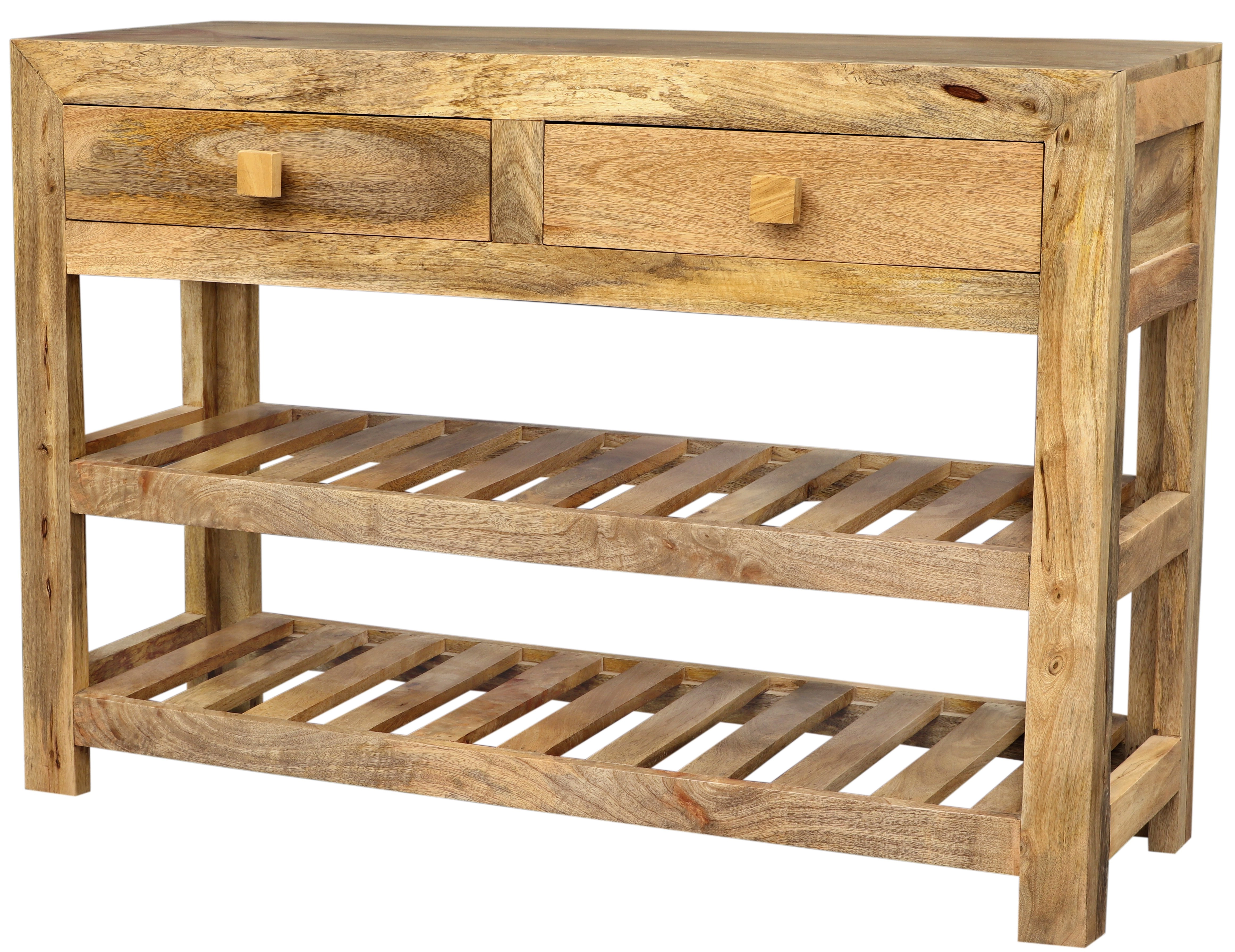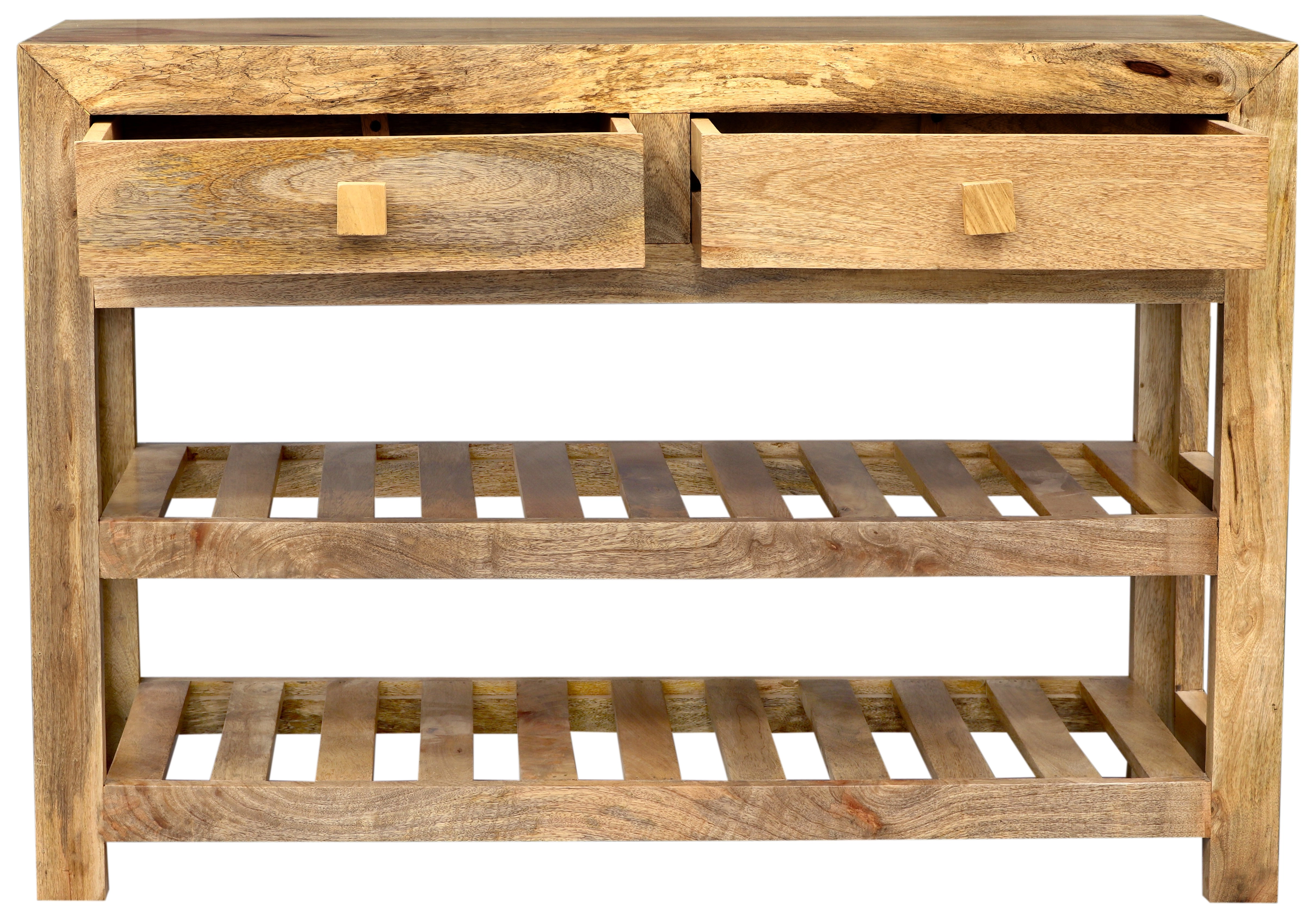 Díky dvěma prostorným šuplíkům a dvěma odkládacím plochám poskytuje tento konzolový stolek dostatek úložného prostoru pro vaše potřeby. Šuplíky jsou ideální pro uložení drobností, jako jsou klíče, dopisy nebo nejrůznější dekorace. Odkládací plochy zase nabízejí prostor pro vystavení vašich oblíbených dekorativních předmětů, jako jsou rámečky s fotografiemi, vázy nebo rostliny. Konzolový stolek je nejen praktický, ale díky svému elegantnímu designu a přírodnímu materiálu z masivu mango přidává do vašeho interiéru nádech exotiky a luxusu.