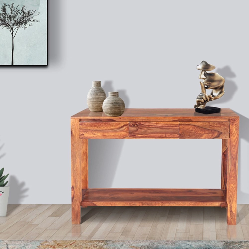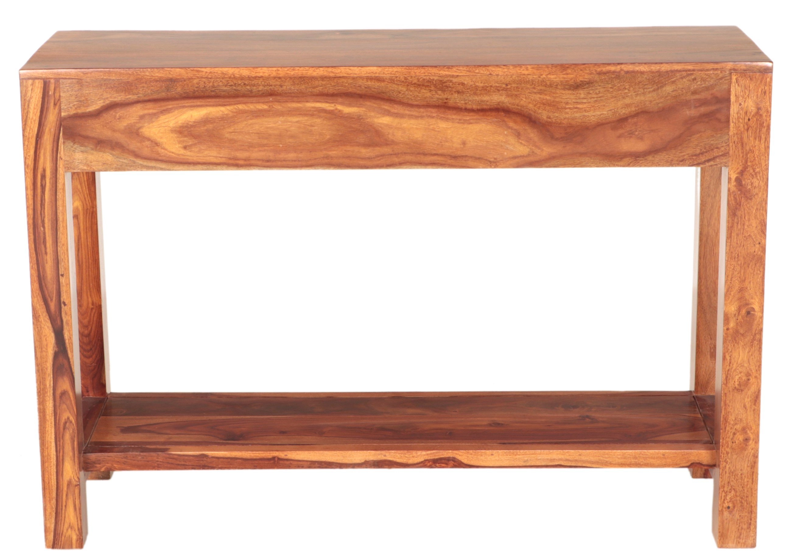 Tento konzolový stolek z masivu indického palisandru je nejen funkční, ale zároveň vytváří útulnou atmosféru a přirozený vzhled. Hodí se také jako odkládací stolek v obývacím pokoji nebo jako elegantní doplněk k vaší toaletě. Jako skvělý doplněk k tomuto druhu nábytku si lidé často pořizují konferenční stolek z palisandru, police z masivu, komodu ve stejném stylu a jídelní stůl z odpovídajícího dřeva.