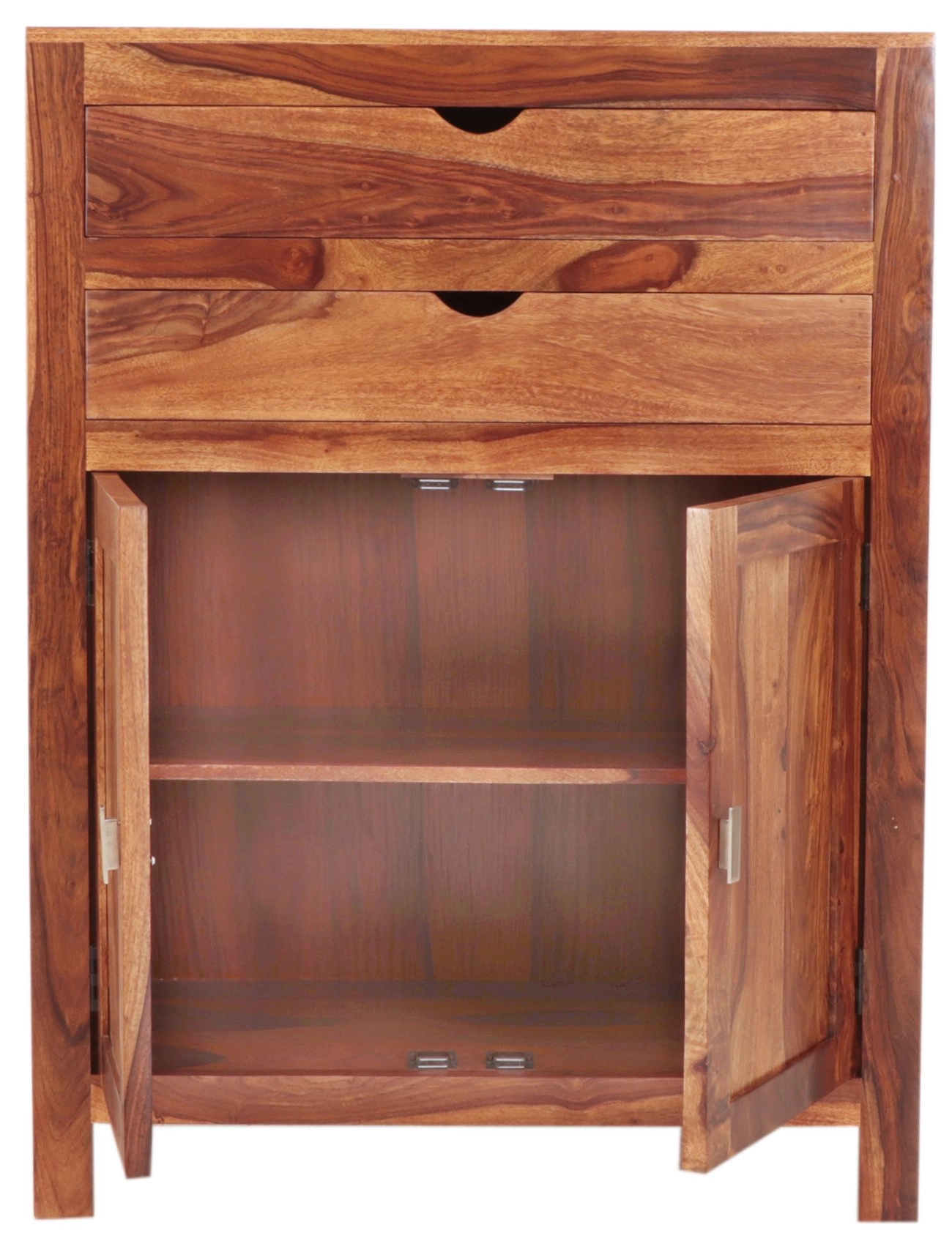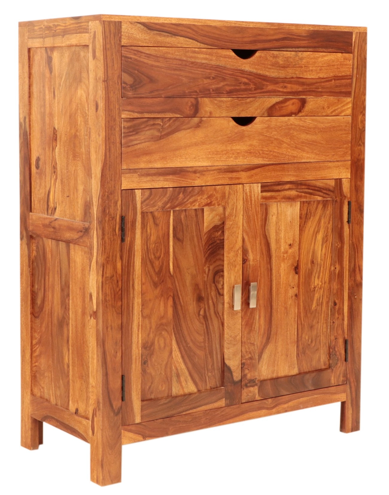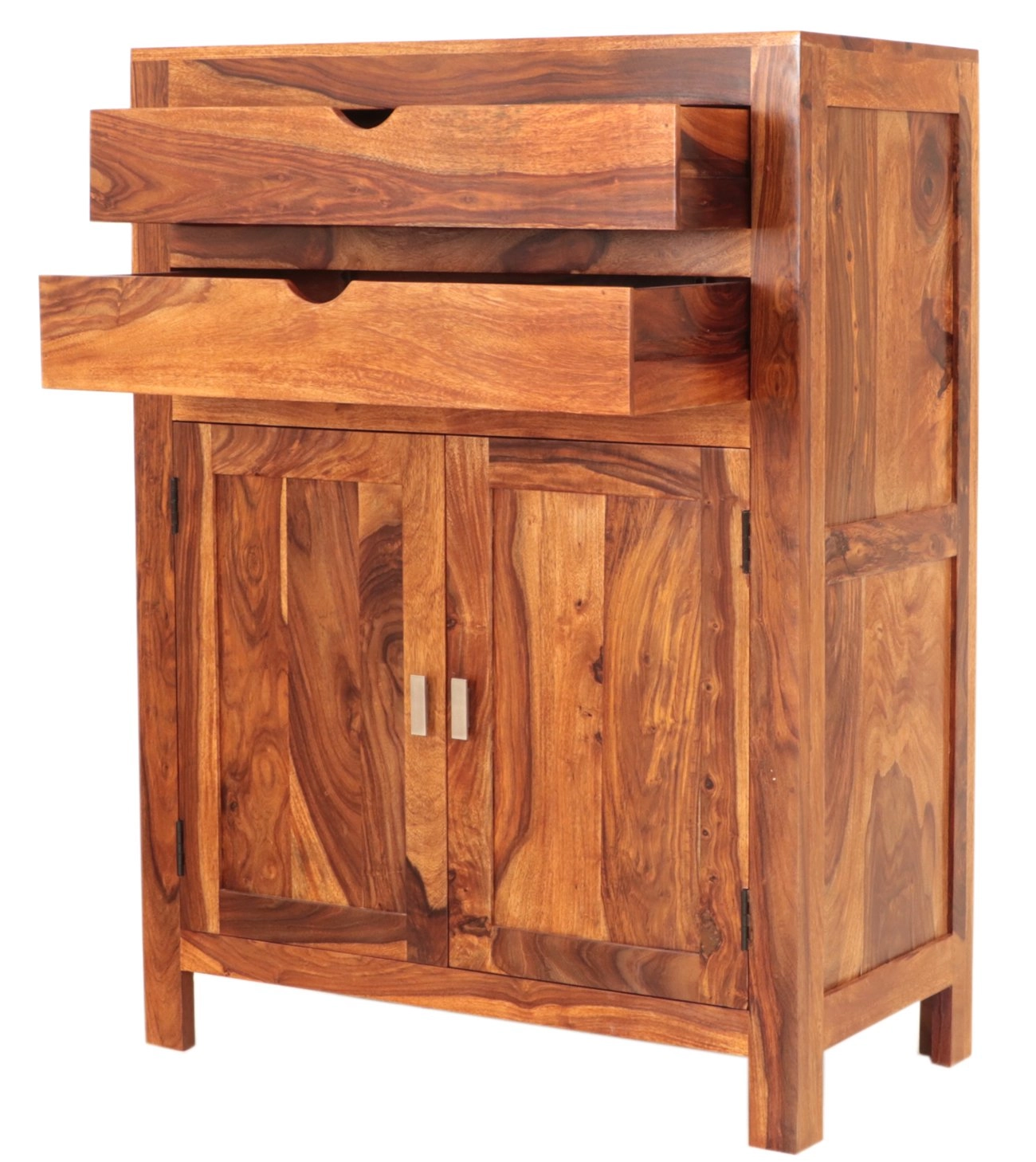 Luxusní komoda z masivního dřeva palisandr 90x120x45 cm je skvělým doplňkem pro každý obývací pokoj, který kombinuje eleganci a funkčnost. Ručně vyráběná v Indii, tato komoda zaujme svým exkluzivním designem a přírodním materiálem, který přináší kousek exotiky a noblesy přímo do vašeho domova. Palisandr, známý svou pevností a nádhernou kresbou dřeva, vytváří jedinečný a neopakovatelný design, který uchvátí každého milovníka luxusního nábytku.