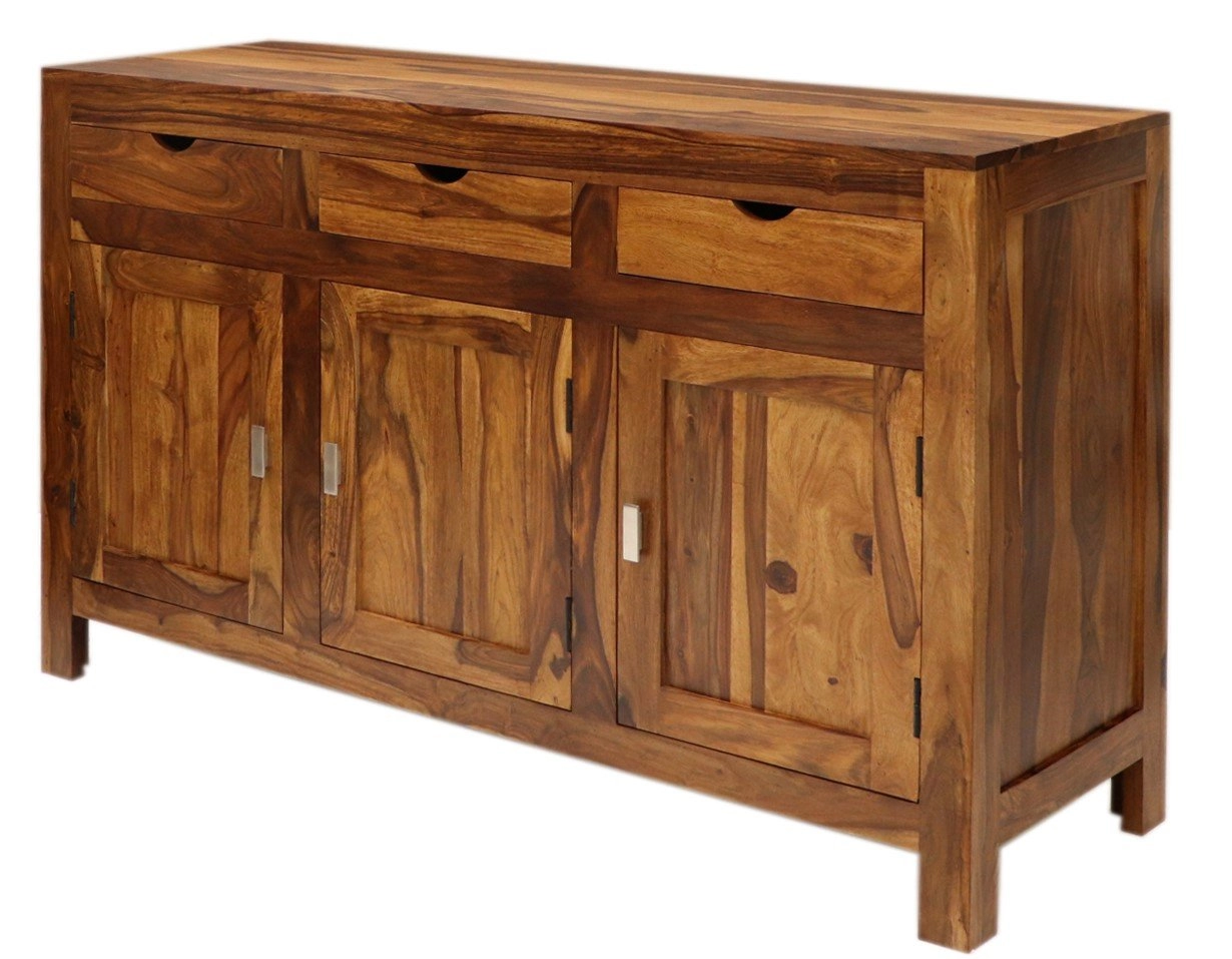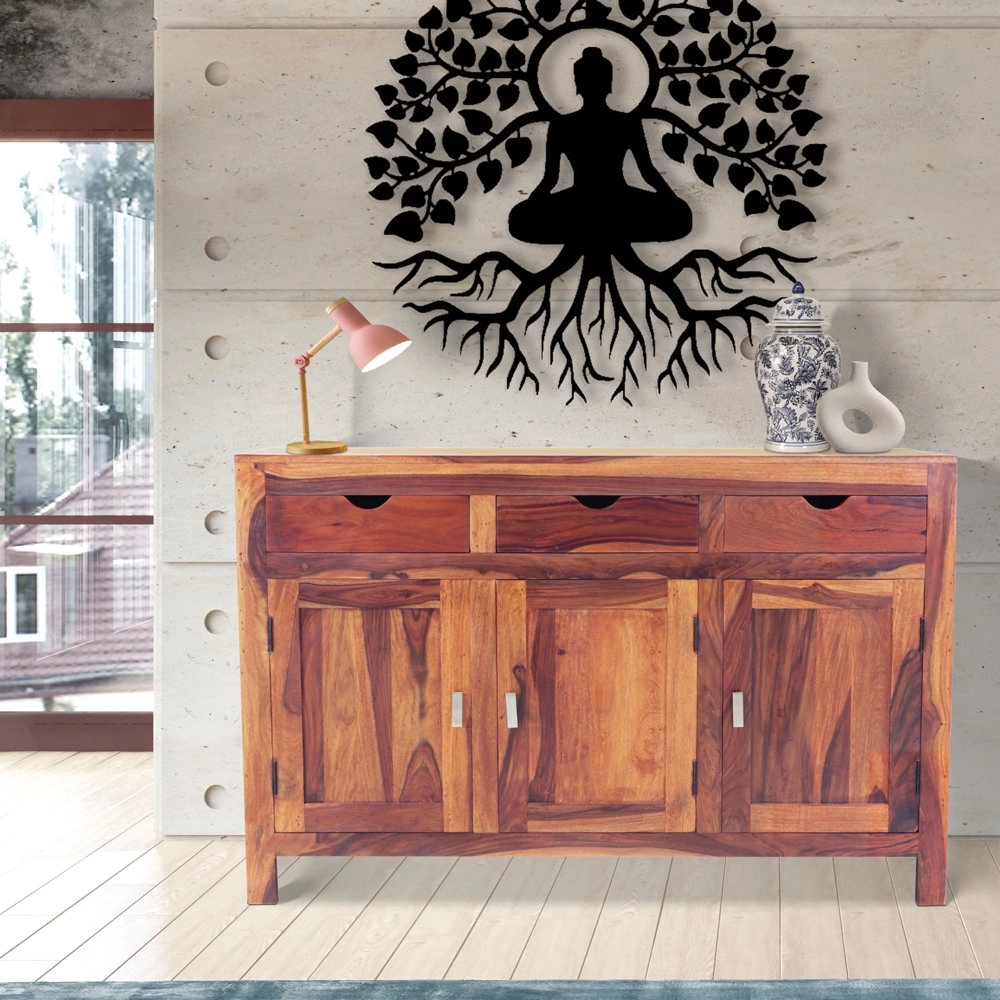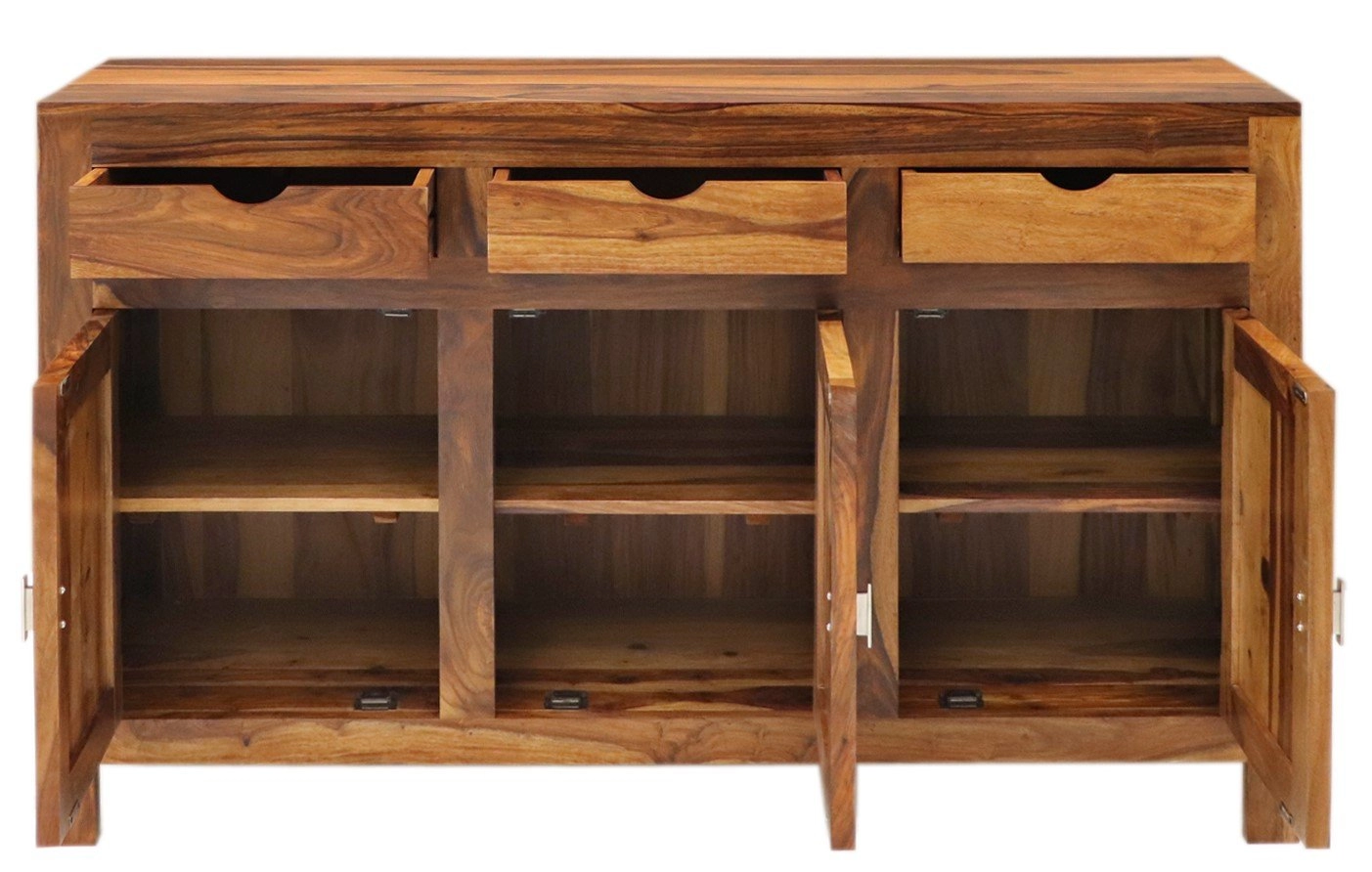 Luxuriöse Kommode aus massivem Palisanderholz, ursprünglich aus Indien, bietet drei Schubladen und drei Türen für maximalen Stauraum. Mit den Abmessungen 140x90x45 cm ist sie die ideale Ergänzung für Ihren Eingangsbereich.