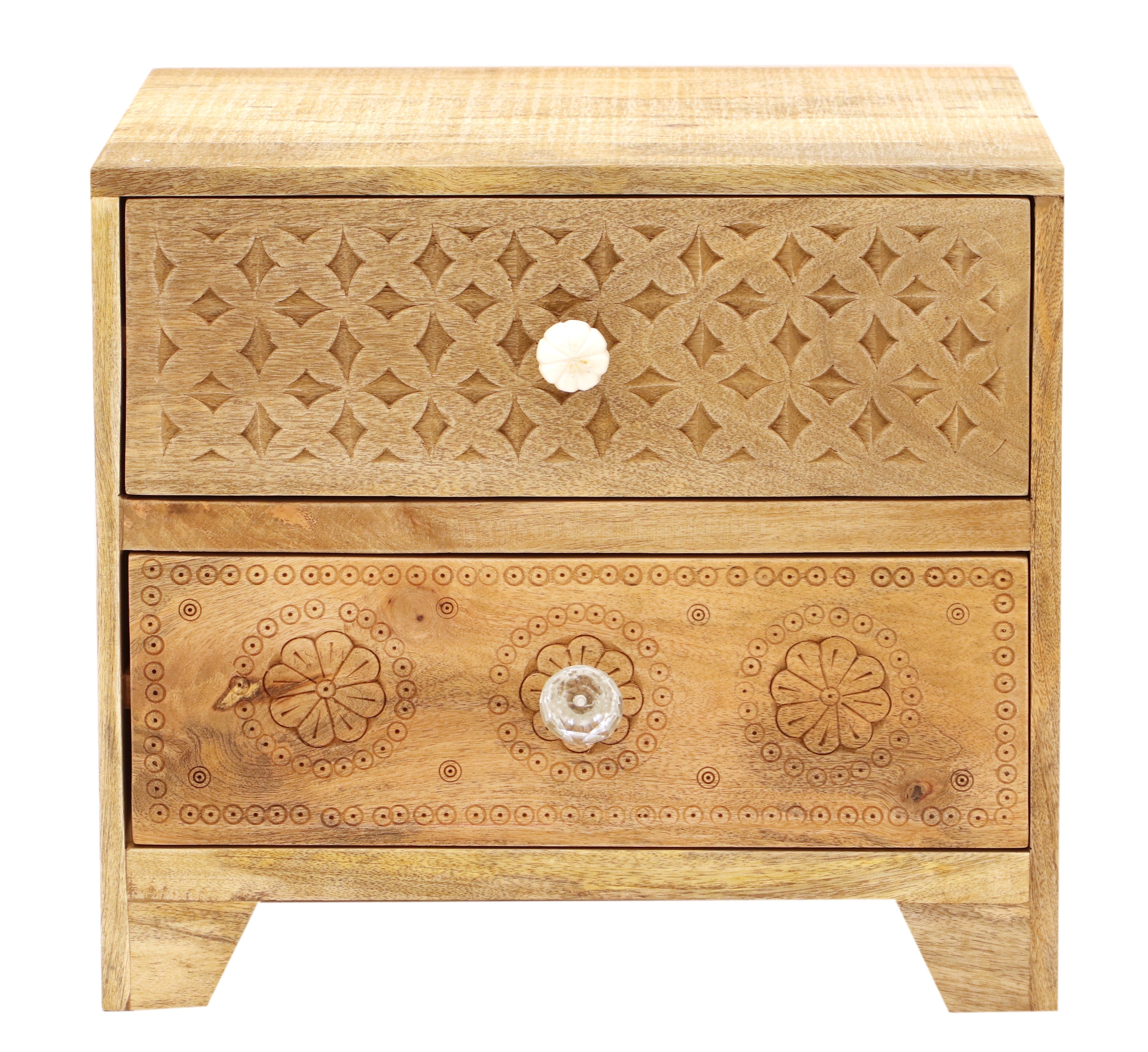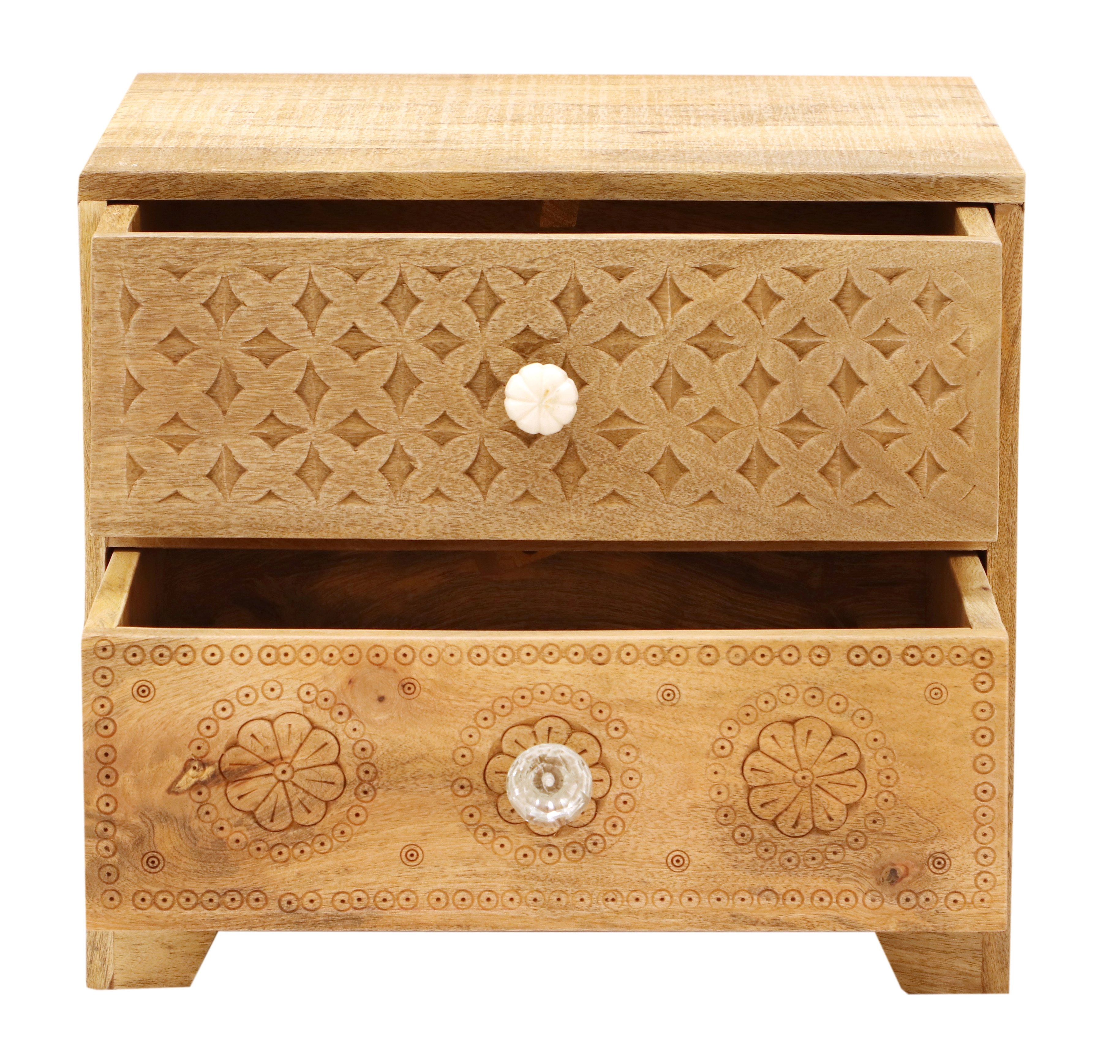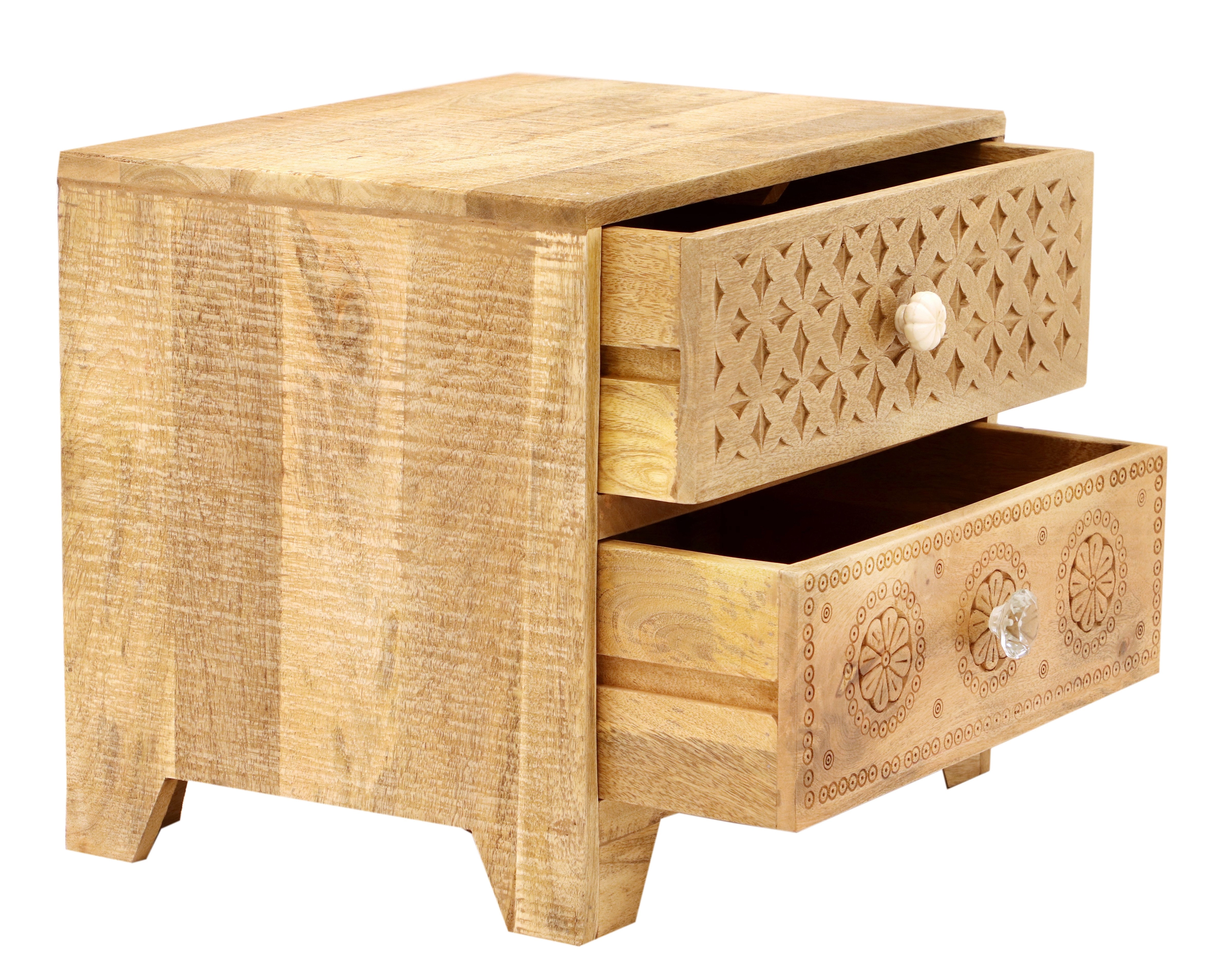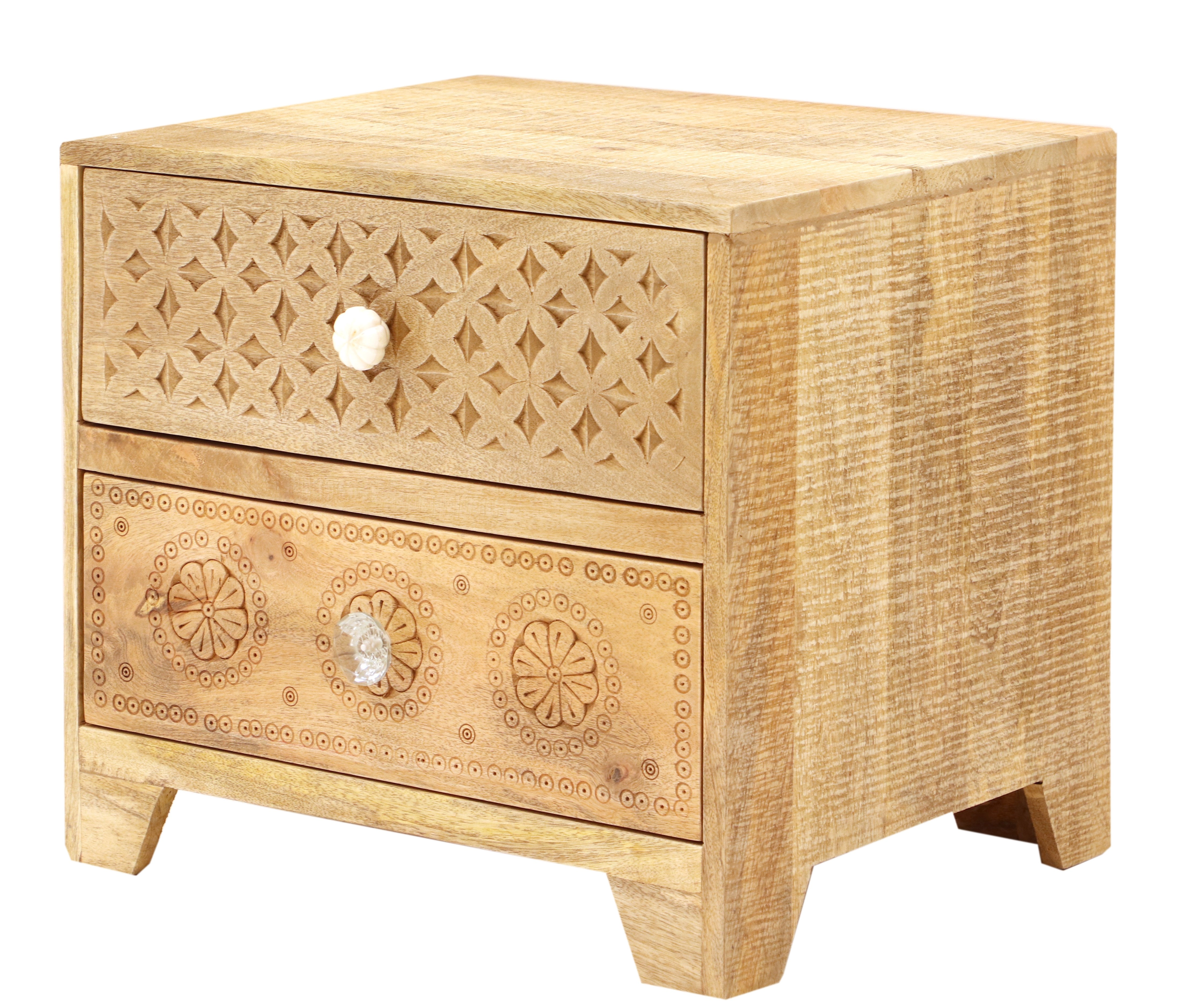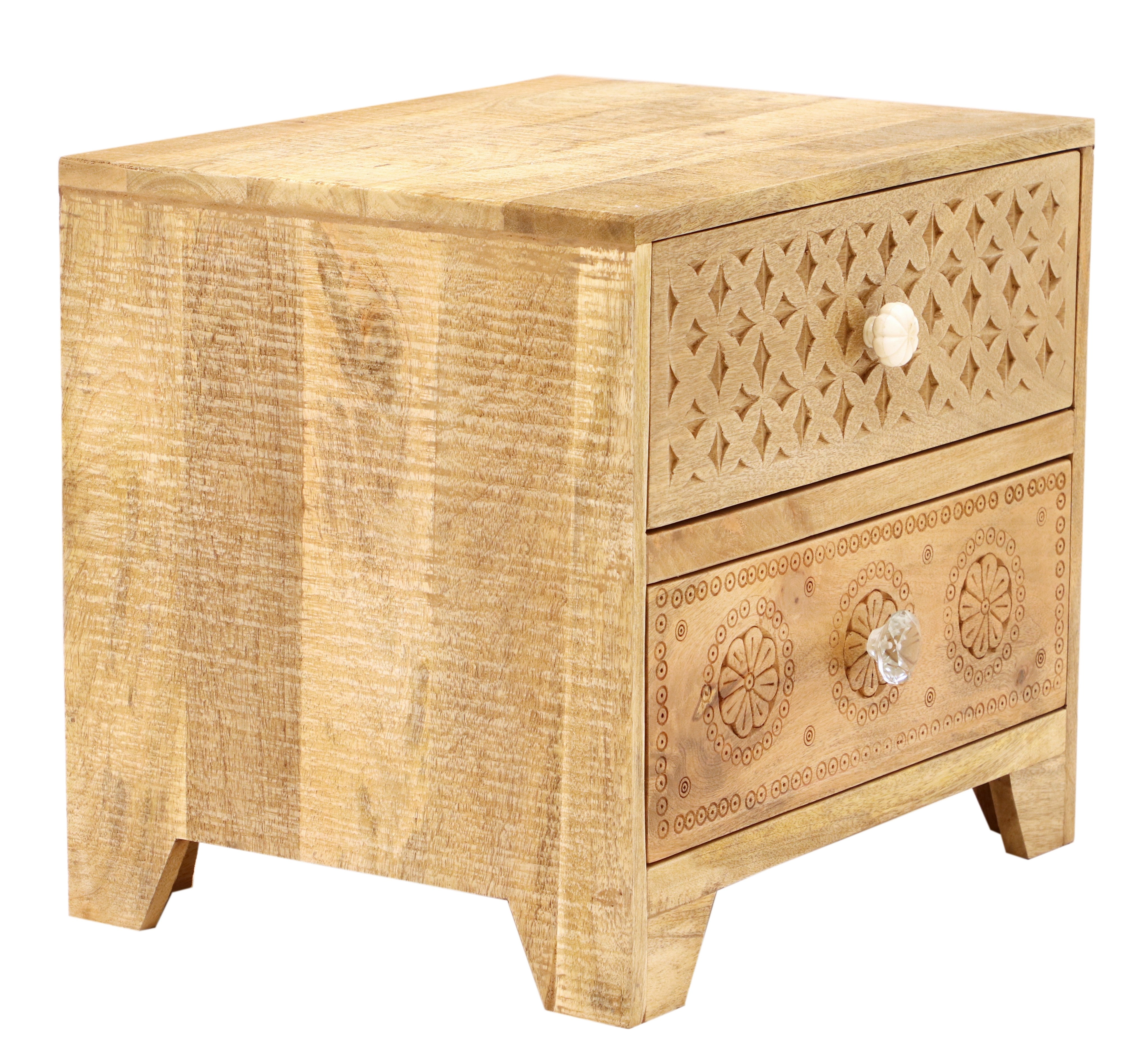 S dvěma prostornými zásuvkami nabízí dostatek úložného prostoru pro všechny vaše nezbytnosti, jako jsou knihy, lampičky nebo drobnosti, které potřebujete mít po ruce. Každý dřevěný noční stolek z masivu je unikátní díky přirozené kresbě manga, která dodává na autentičnosti a originalitě. Tento kus dřevěného nábytku je pečlivě zpracován, aby vydržel roky užívání a zároveň přinesl teplo a styl do vaší ložnice.