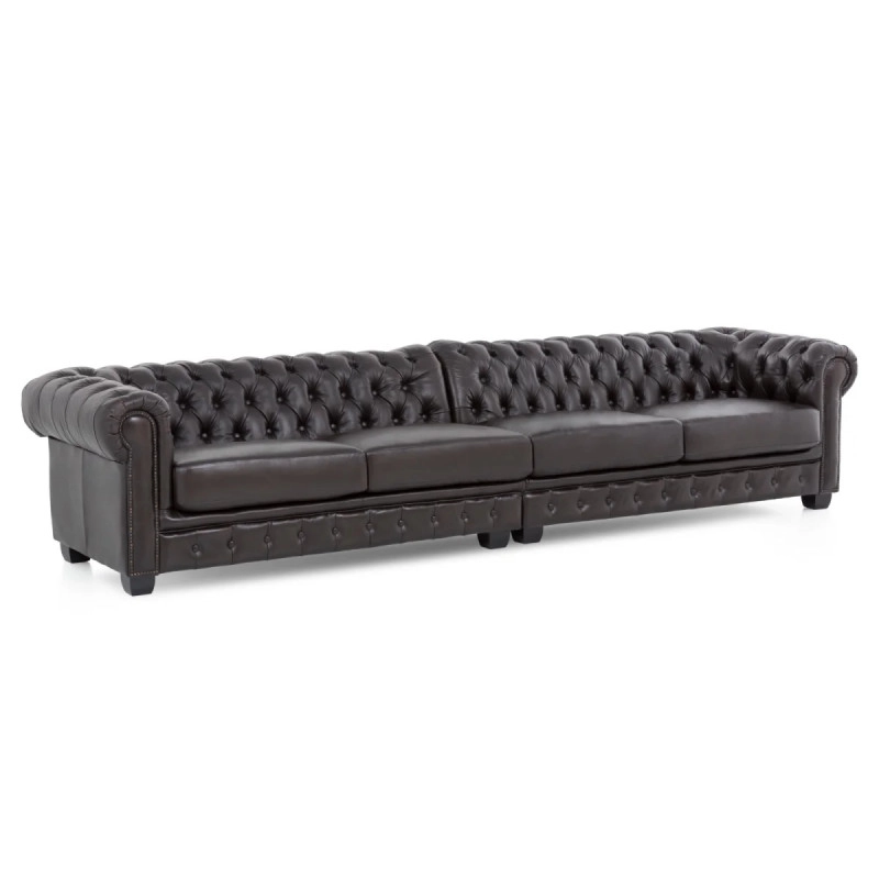 Pohovka Chesterfield je ikonou elegance a tradice, a naše masivní 6místná verze v hnědé pravé kůži je dokonalým příkladem spojení klasického stylu s moderním komfortem. S rozměry 352 cm na délku, 100 cm na šířku a 72 cm na výšku se stane ústředním bodem vašeho obývacího pokoje, kde můžete trávit čas s rodinou a přáteli. Hnědá barva kůže dodává prostoru teplý a útulný pocit, zatímco prošívání a ikonické knoflíkové detaily vyzdvihují tradiční Chesterfield vzhled. Pohovka je ideální pro širokou škálu interiérů, od moderních minimalismů po klasické anglické salony, a její nadčasový design zajistí, že nikdy nevyjde z módy.