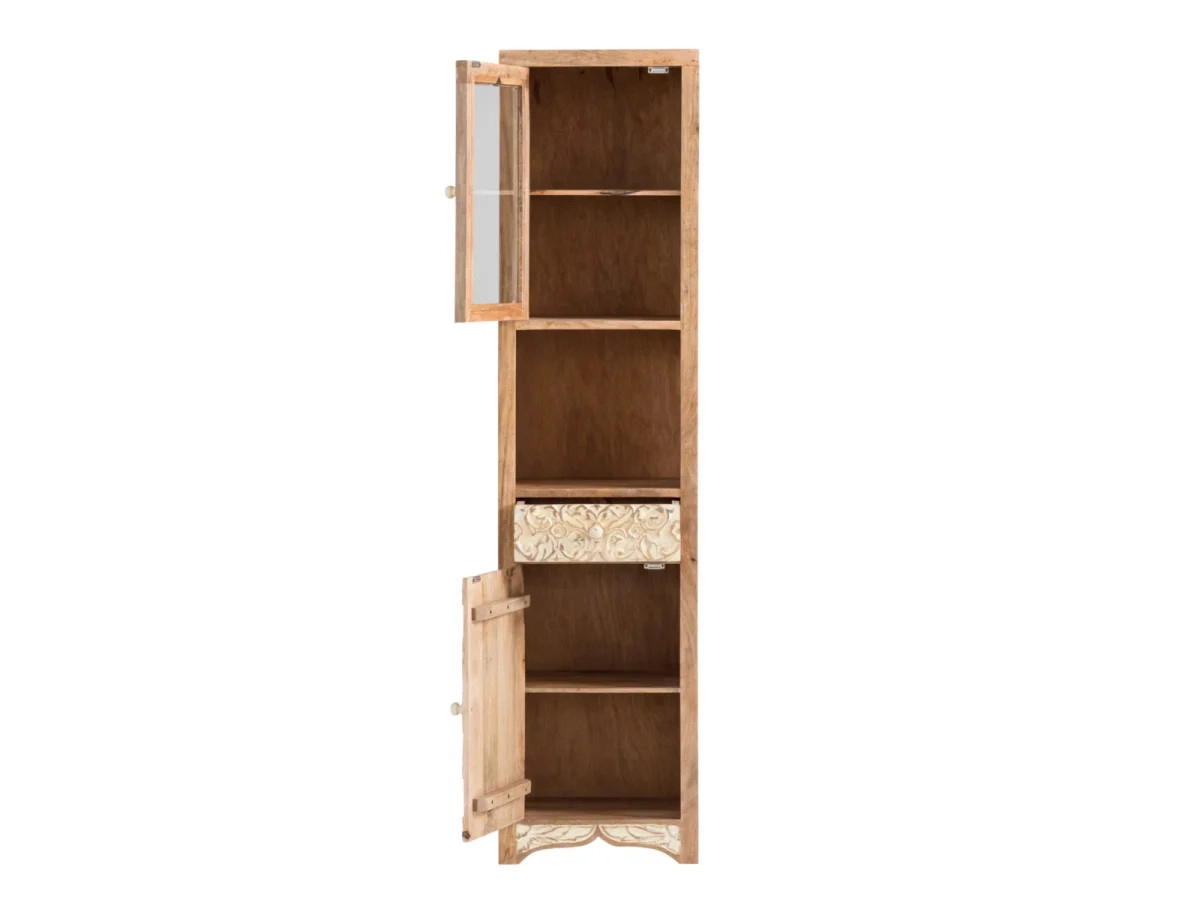 Masivní vysoká skříň Dehli z mangového dřeva je dokonalým kouskem pro ty, kteří chtějí do svého interiéru vnést přírodní eleganci a funkčnost. Její hnědá lakovaná povrchová úprava podtrhuje krásu struktury mangového dřeva a dodává prostoru teplý a útulný nádech. S rozměry 45×35×185 cm se skříň skvěle hodí do koupelny, kde můžete efektivně využít každý centimetr prostoru. Vysoký design skříně navíc vytváří dojem vzdušnosti, a přesto poskytuje dostatečný úložný prostor pro všechny vaše nezbytnosti, od ručníků po kosmetiku.