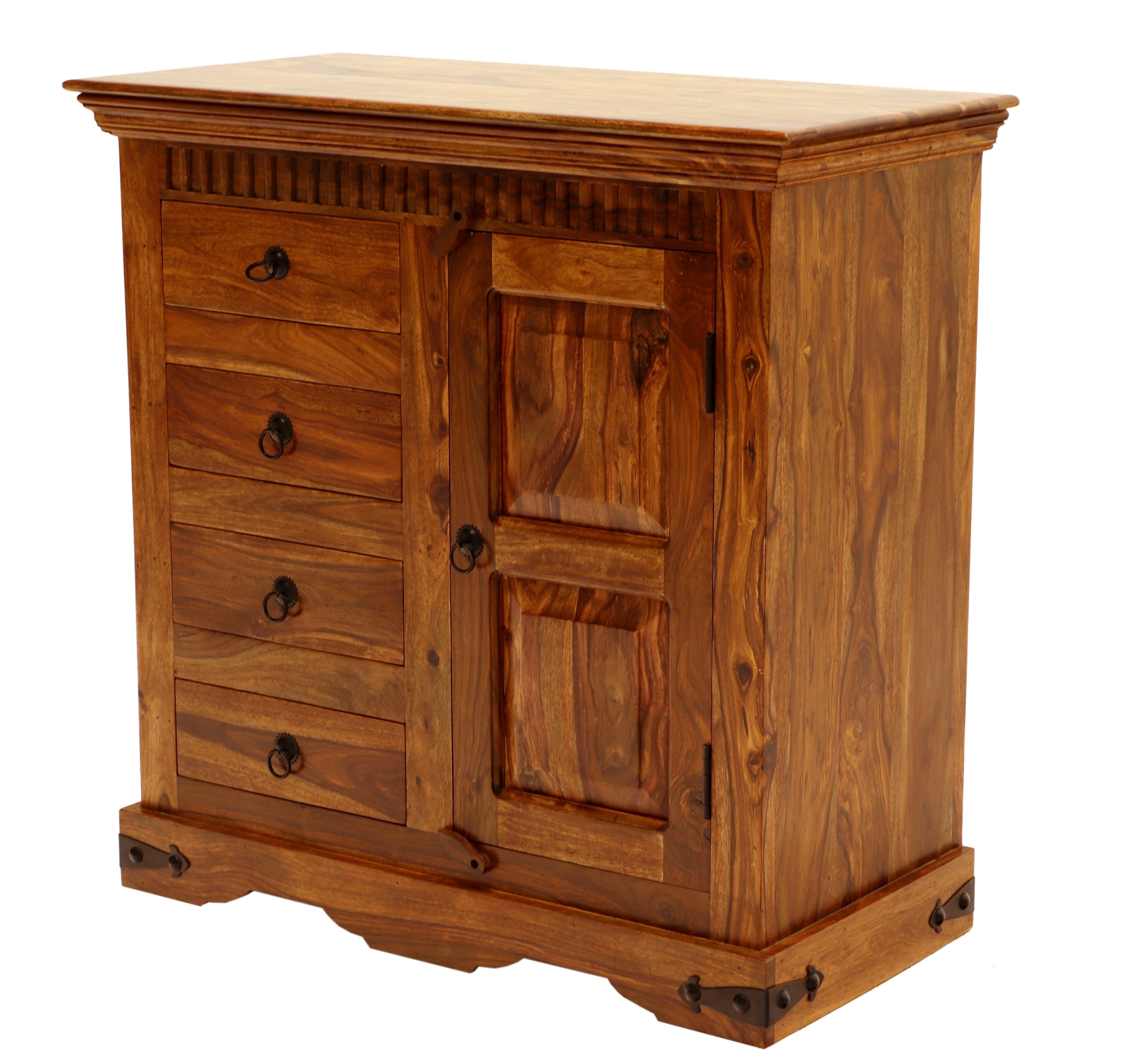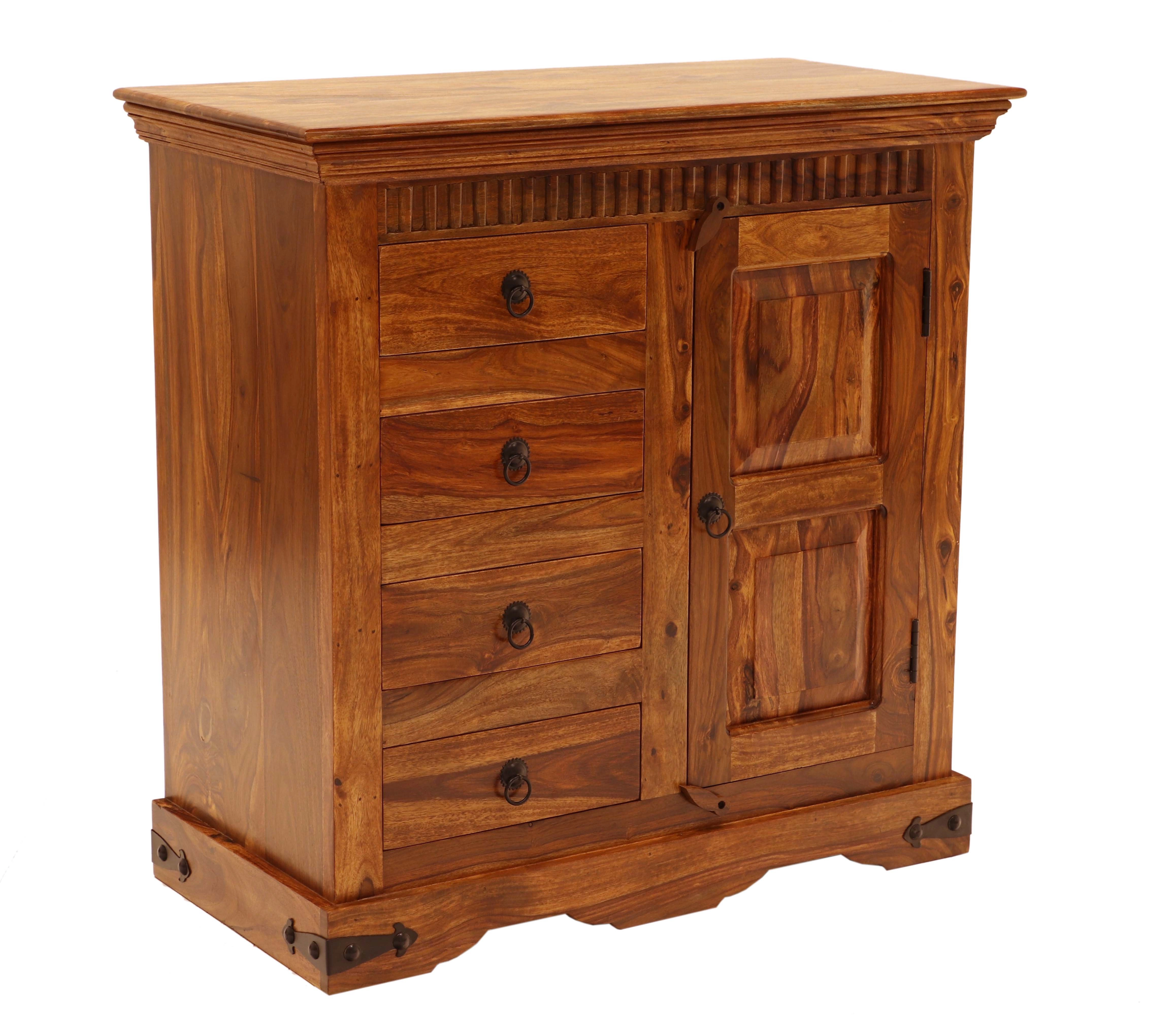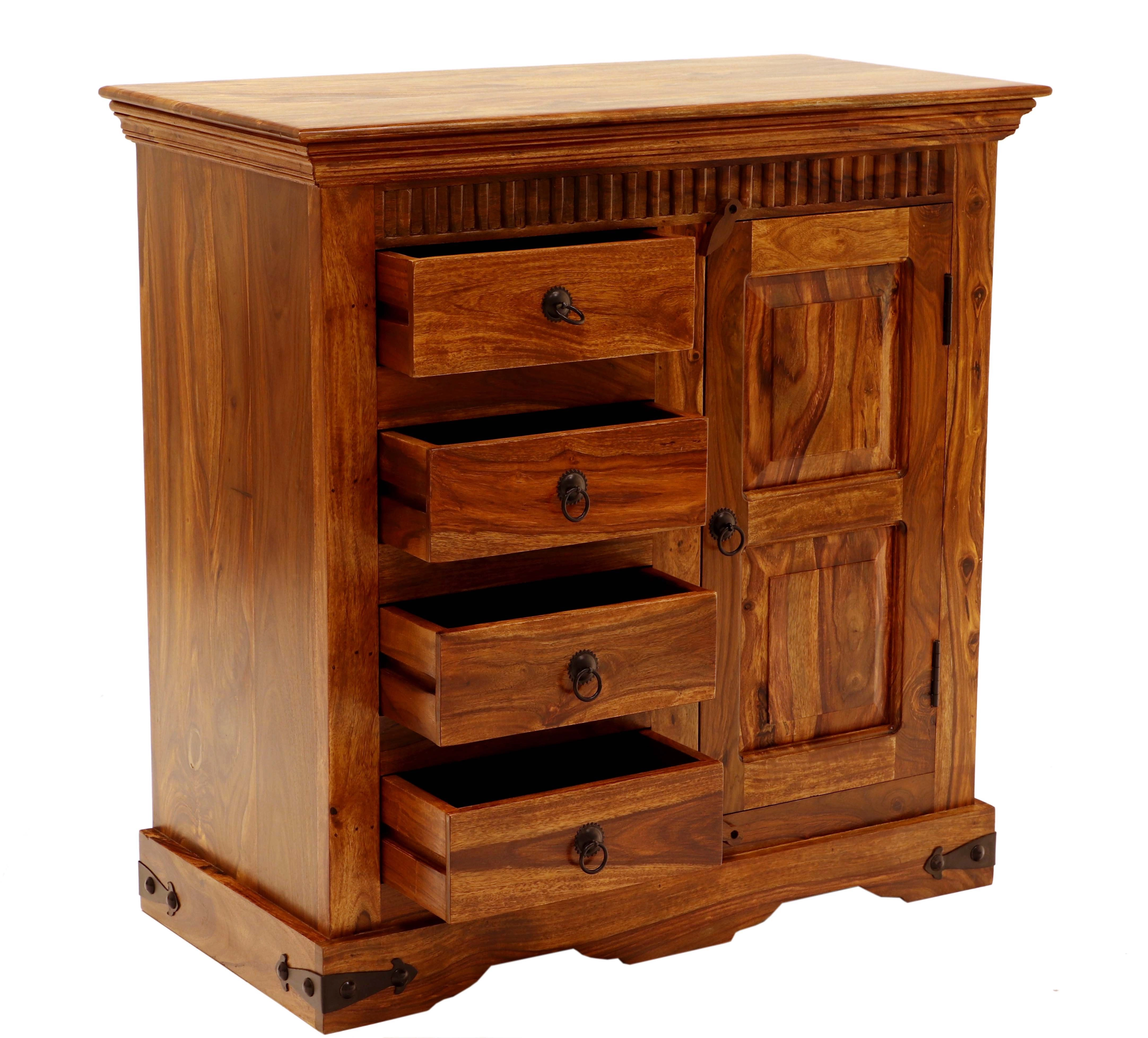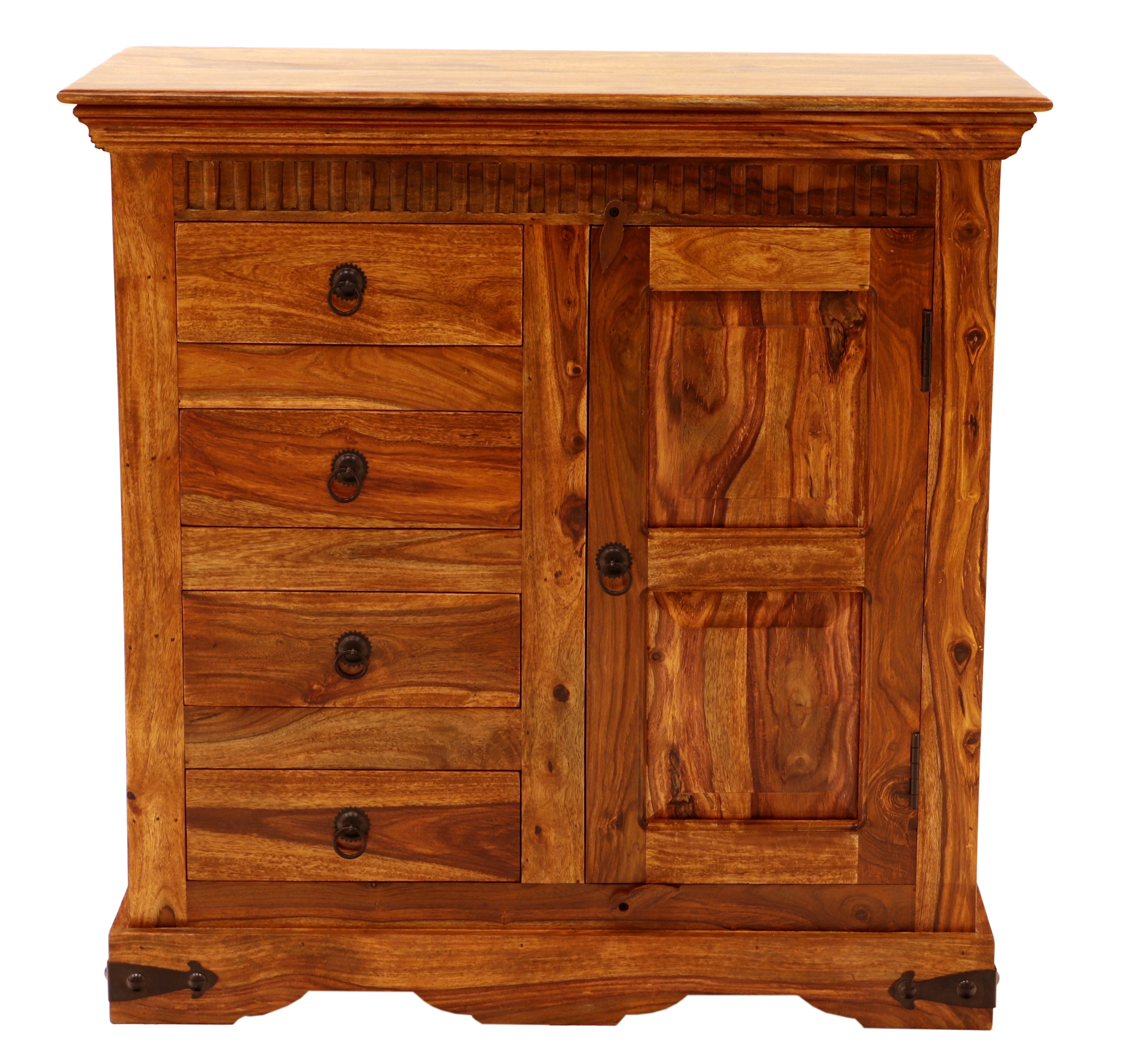 Komoda nabízí čtyři prostorné zásuvky, které jsou perfektní pro ukrytí drobností či dokumentů, a jedny vyřezávané dvířka, které dodávají komodě nádech exotiky a originality. Kované úchyty pak dotváří její rustikální vzhled a přidávají na odolnosti. Rohy a plochy z masivního palisandru dávají naší komodě jedinečný vzhled a přirozenou krásu dřeva, zdůrazňující jeho trvanlivost a kvalitu.