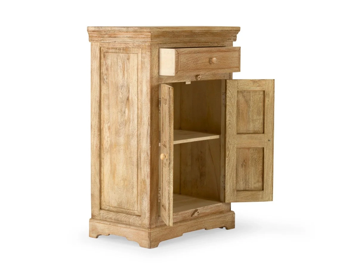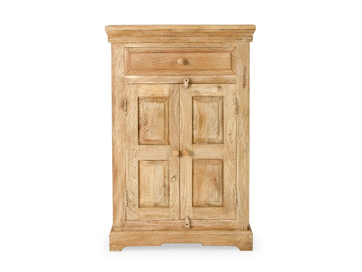 Die Verarbeitungsqualität dieser Kommode ist unübertroffen – sie besteht aus robustem Mango-Holz, das für seine hervorragenden Eigenschaften und Langlebigkeit bekannt ist. Die lackierte Oberfläche sorgt für einfache Pflege und Schutz des Holzes, sodass Sie sicher sein können, dass die Kommode Patina Ihnen viele Jahre dienen wird. Die natürliche Holzfarbe kombiniert sich harmonisch mit weiteren Elementen Ihres Interieurs und verleiht ihm einen Hauch von Eleganz und Authentizität. Die Form der Kommode wurde mit Fokus auf moderne Ästhetik entworfen, die sowohl mit minimalistischen Stilen als auch mit traditionellerer Einrichtung harmoniert.