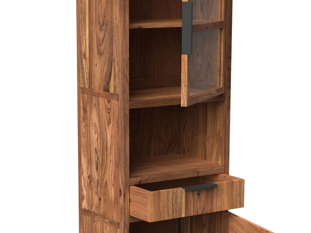Vitrína Sydney vyniká nadčasovým designem, který kombinuje tradiční masivní materiál s moderním lakovaným povrchem, což ji činí vhodnou nejen do klasických, ale i do současných interiérů. Každý detail byl pečlivě promyšlený – od robustních dřevěných desek po jemné úchyty a precizní spojení. Akáciové dřevo je nejen krásné na pohled, ale také odolné vůči běžnému opotřebení, což zaručuje, že vitrína zůstane ozdobou vašeho obývacího pokoje po mnoho let. Využijte možnost zpříjemnit si domov kusem nábytku, který vás bude denně těšit svojí kvalitou i vzhledem. Prohlédněte si detaily a dopřejte svému prostoru jedinečný charakter.