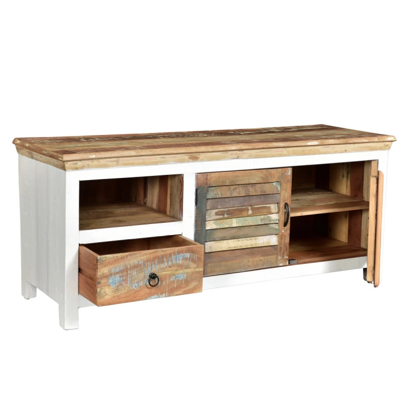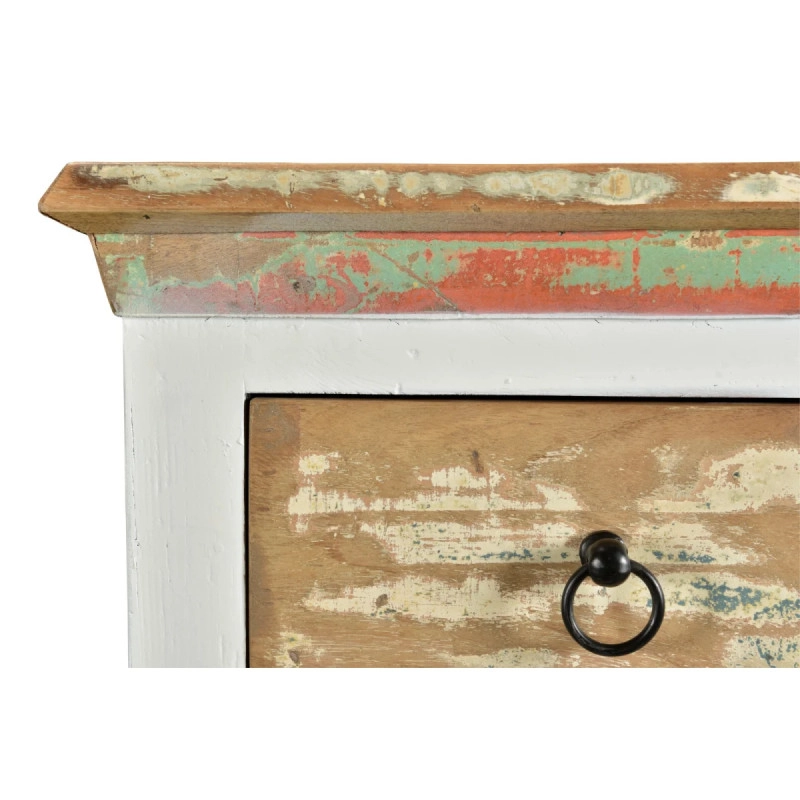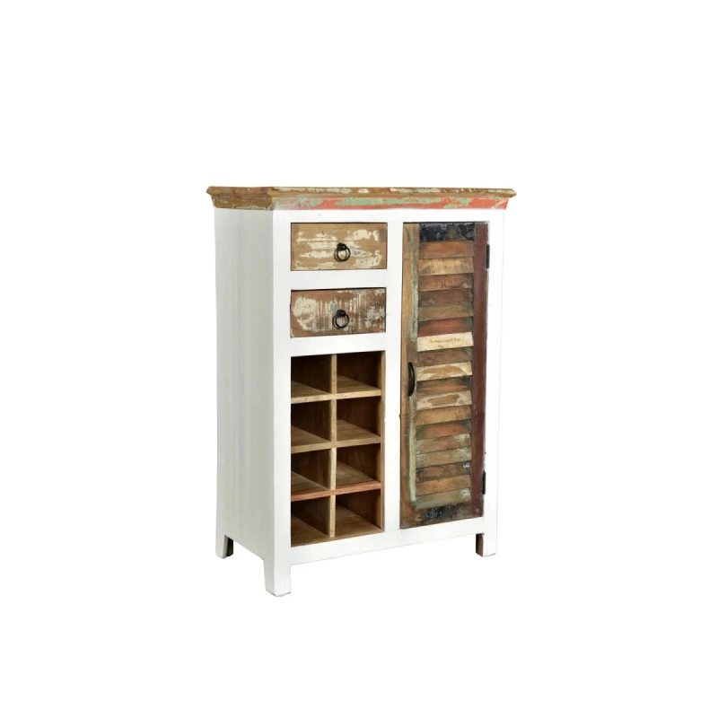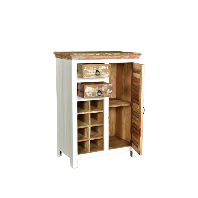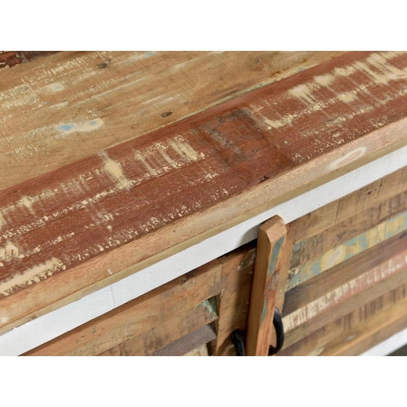 Masivní nástěnná skříň Perth z recyklovaného dřeva přináší do každého obývacího pokoje šmrnc a funkčnost. Bílý lak s barevnými akcenty dodává této skříni moderní vzhled, zatímco robustní konstrukce zajišťuje dlouhou životnost a dostatek úložného prostoru.