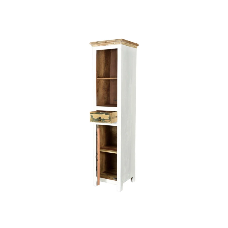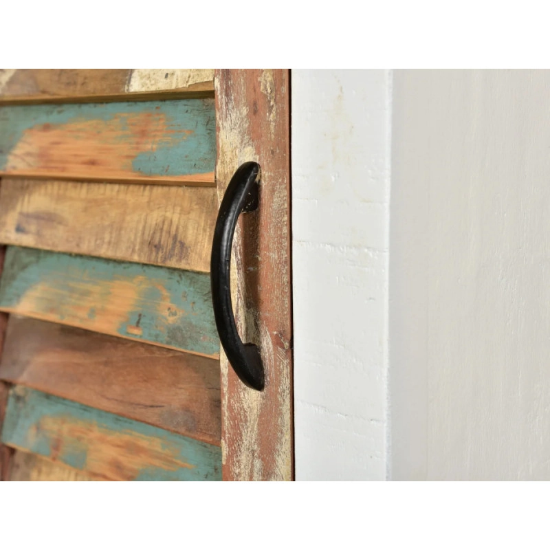 Hledáte nejen úložný prostor, ale i originální kousek nábytku, který oživí váš obývací pokoj? Masivní nástěnná skříň Perth z recyklovaného dřeva je více než jen praktickým prvkem. Každý kus je unikátní díky použití lakovaného recyklovaného tvrdého dřeva, které s sebou nese příběh a charakter minulých let. Tato skříň zaujme na první pohled svou bílou barvou doplněnou o barevné detaily, které dodávají celkovému designu svěží a veselý vzhled.