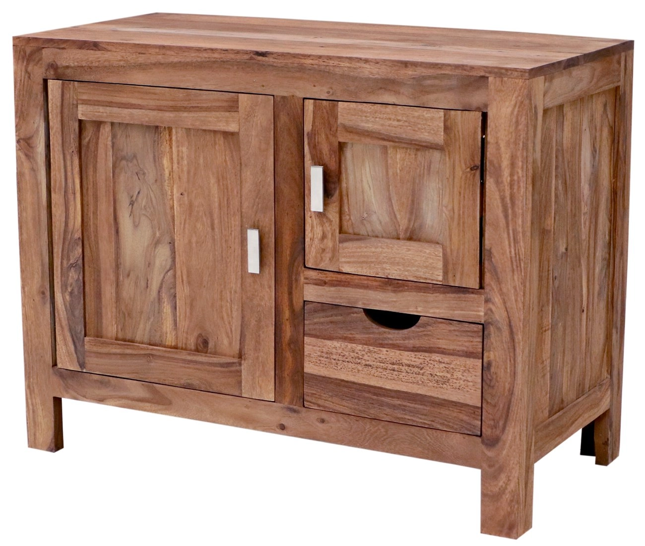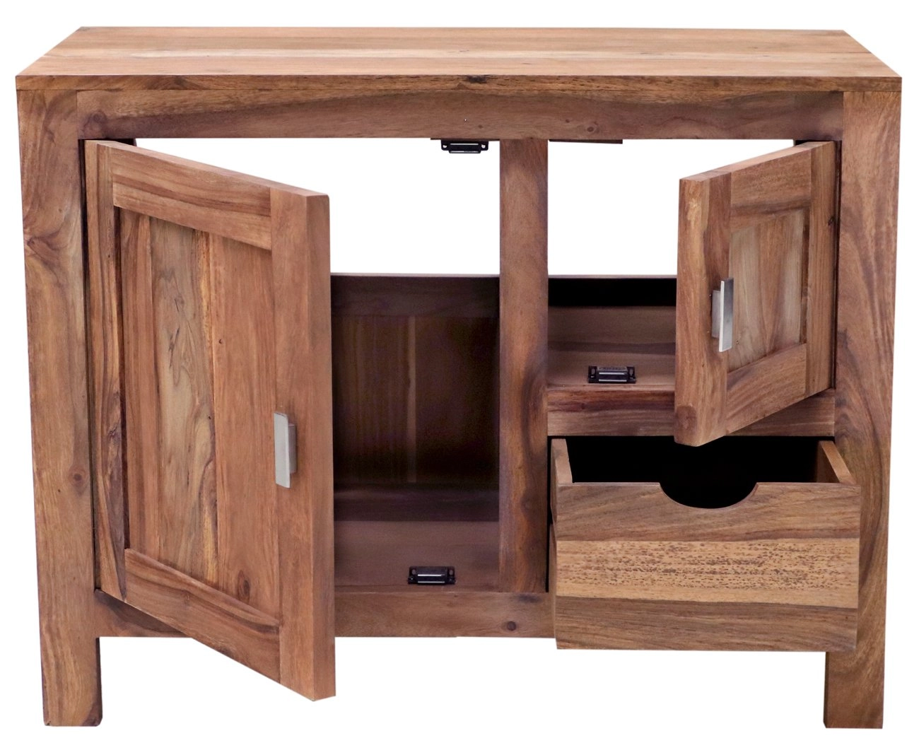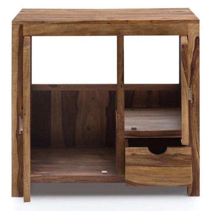 Indický palisandr je známý svou odolností a půvabnou texturou, díky čemuž se každá skříňka stává unikátním uměleckým dílem. Skříňka disponuje dvěma dvířky a jednou zásuvkou, což poskytuje dostatek úložného prostoru pro veškeré koupelnové potřeby. Je nejen praktická, ale také esteticky působivá, a to díky nádherným přírodním odstínům dřeva.
