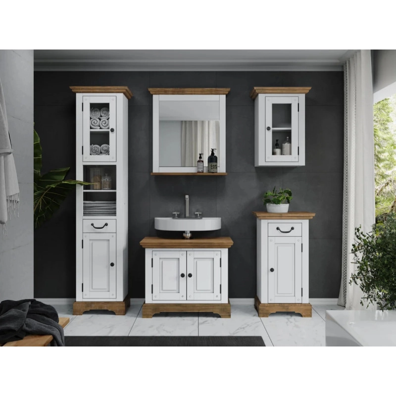 Beginnen Sie jeden Morgen mit einem Blick in den Spiegel, der nicht nur perfekt spiegelt, sondern auch Ihrem Badezimmer einen Hauch von Eleganz verleiht. Der massive Badezimmerspiegel Kenya besteht aus einer Kombination aus Kiefernholz und MDF, was seine Haltbarkeit und langfristige Lebensdauer gewährleistet. Die lackierte weiße Oberfläche verleiht dem Spiegel ein frisches und sauberes Aussehen, das jeden Raum aufhellt und ein Gefühl von mehr Raum schafft. Mit den Maßen 73×15×78 cm passt dieser Spiegel auch in kleinere Badezimmer, ohne überladen zu wirken.