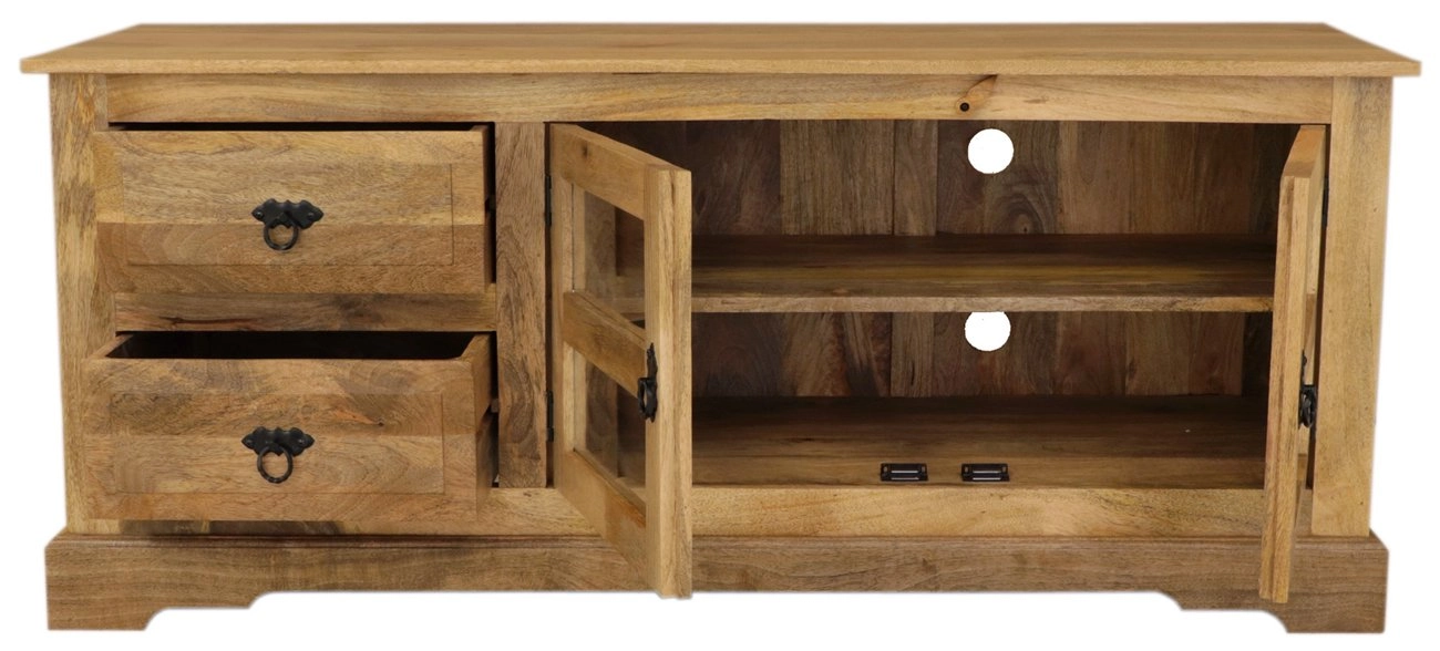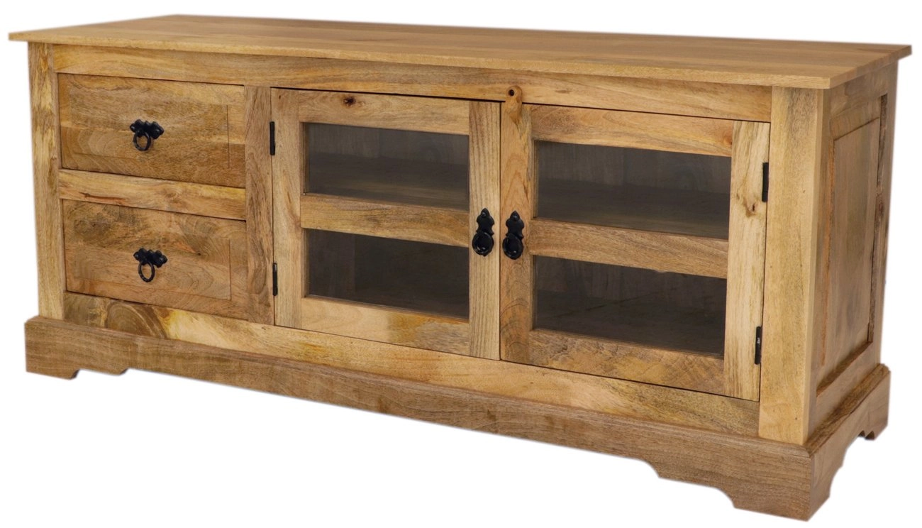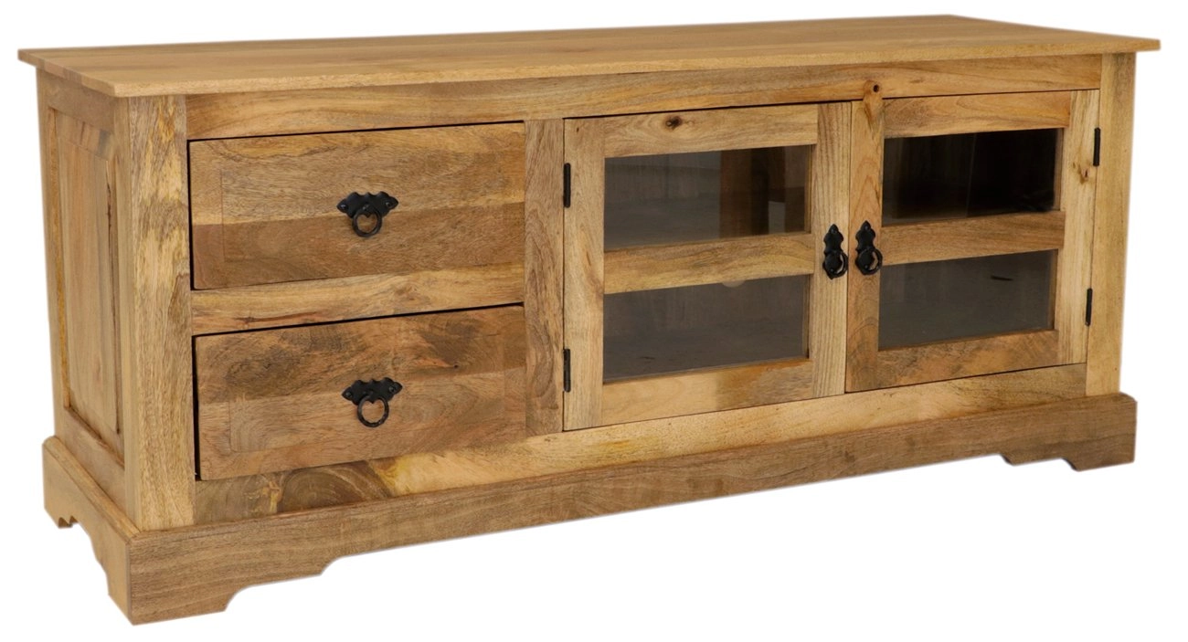 Vyrobený z kvalitního dřeva mango, tento masivní TV stolek zajišťuje dlouholetou životnost a odolnost. Působivé jsou také jeho neotřelé barevné tóny a přirozený vzhled typický pro mango. Stolek disponuje dvěma praktickými šuplíky, které poskytnou dostatek místa na uskladnění drobných předmětů. Skříňka s prosklenými dvířky a elegantním kovovým úchytem dodává celému stolku nejenom funkčnost, ale i nádech sofistikovanosti.