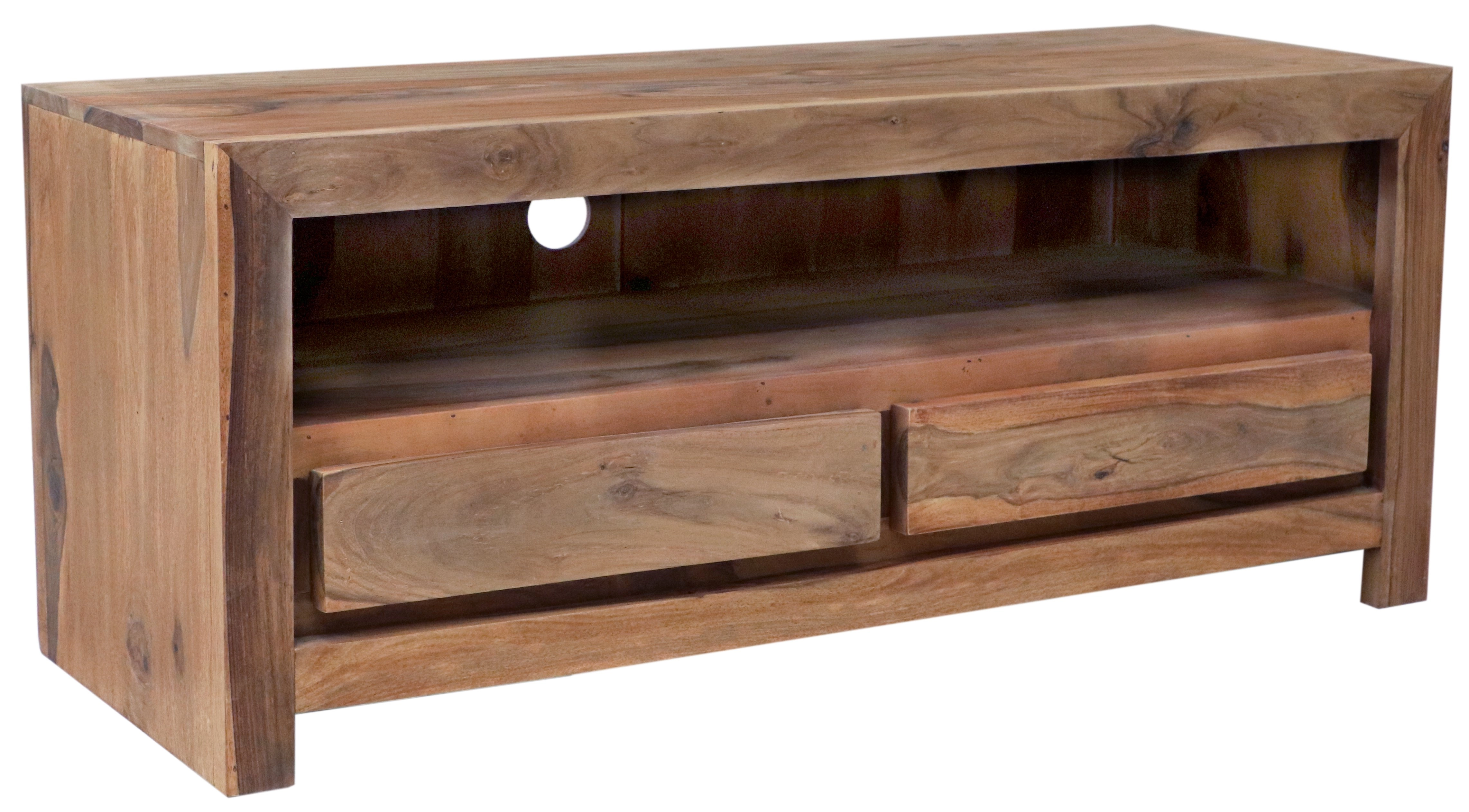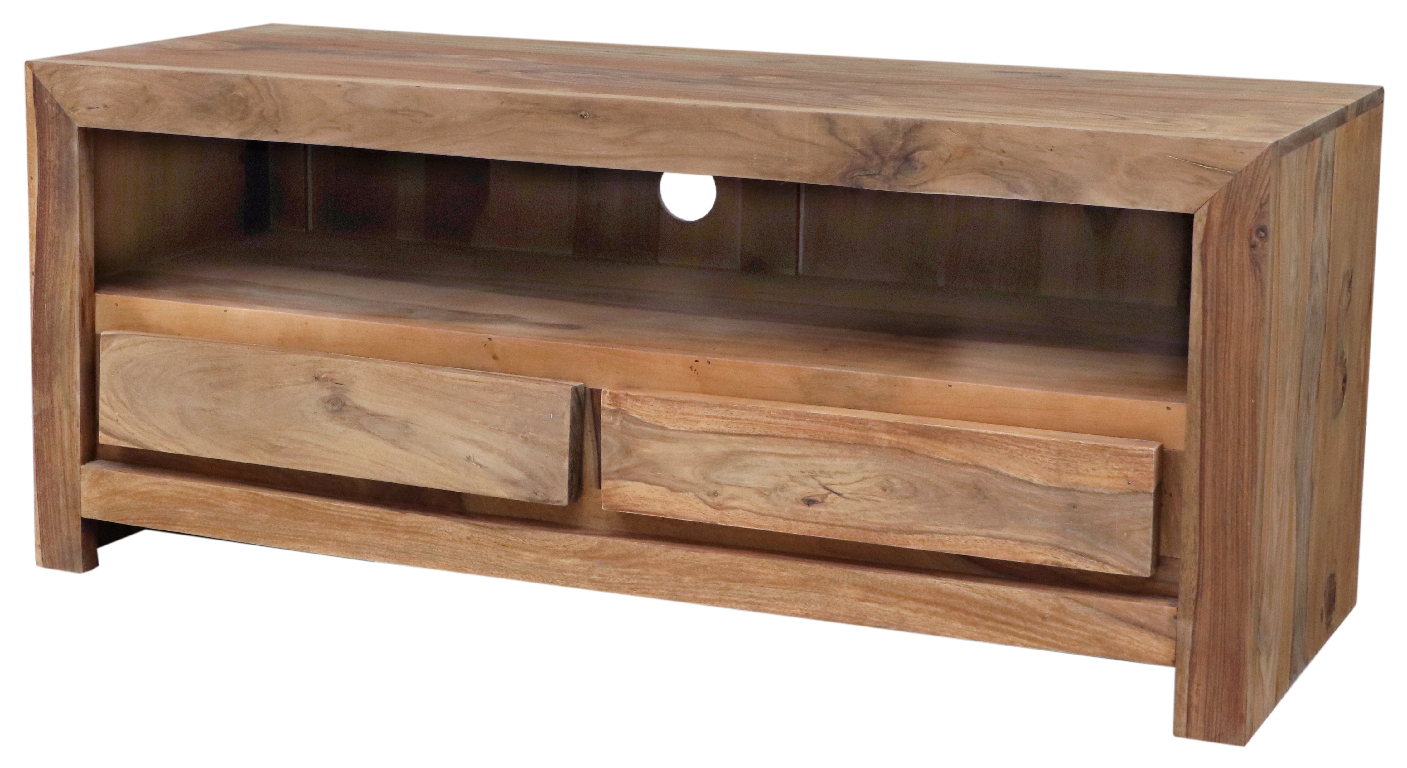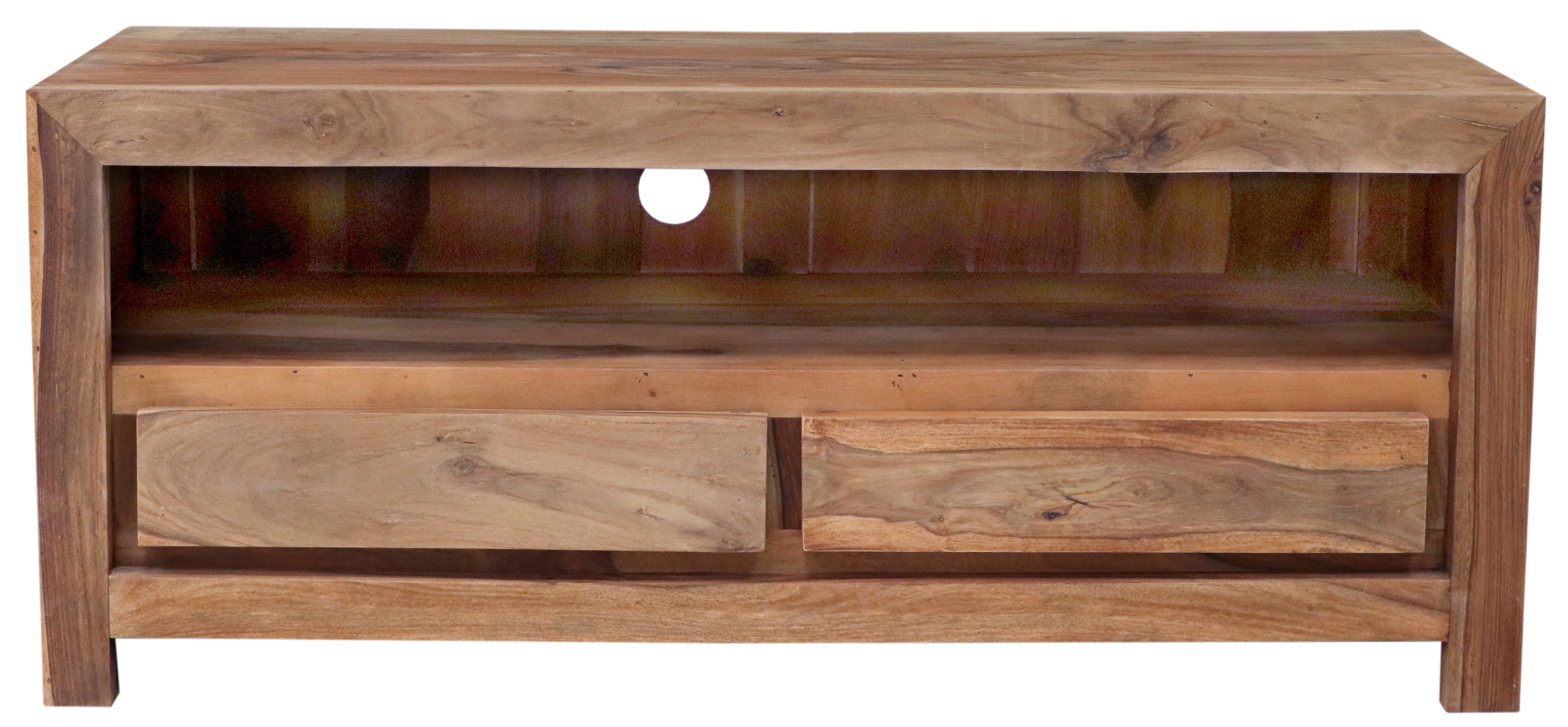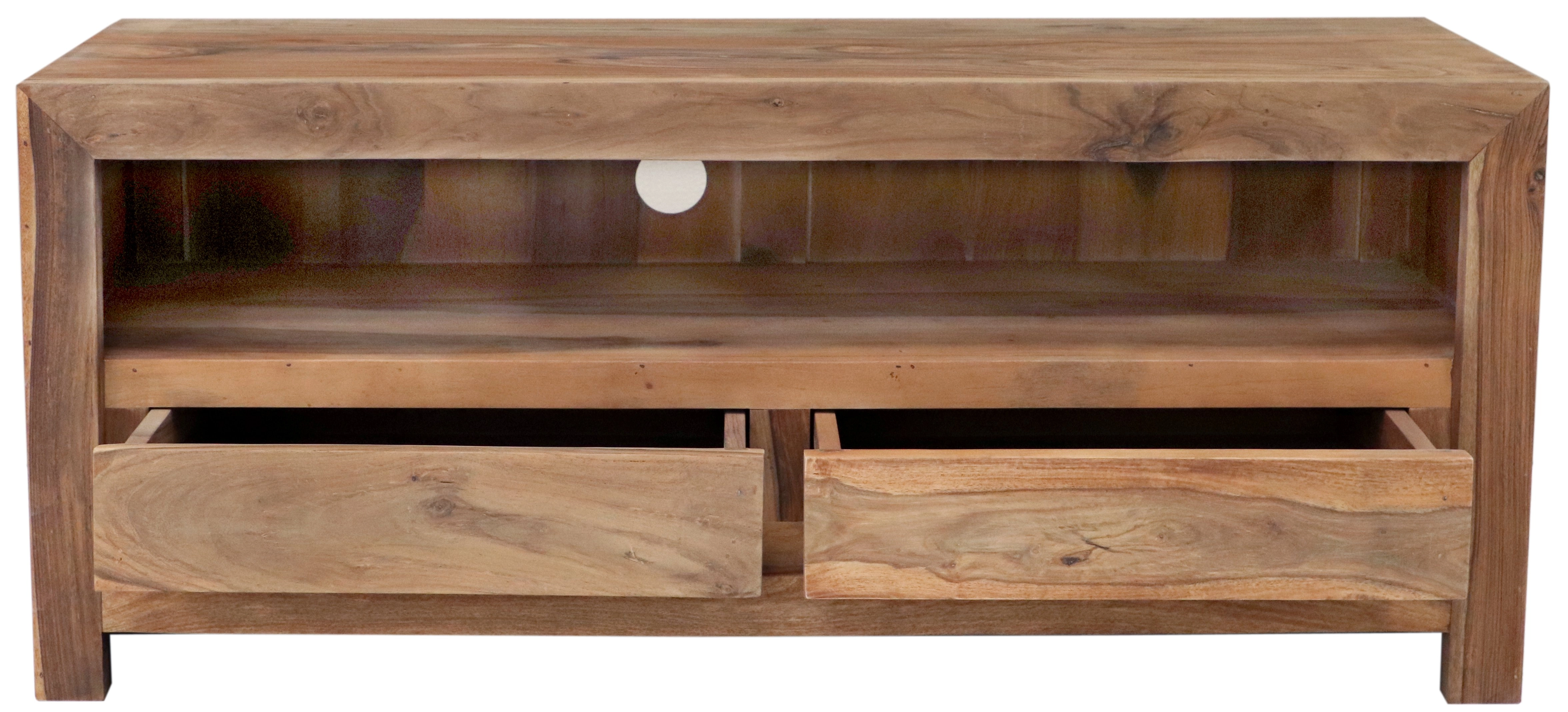 Stolek je navržen tak, aby nabídl praktické využití s dvěma prostornými zásuvkami, kde můžete uskladnit různé drobnosti nebo užitečné zásoby. Otevřená police poskytuje ideální prostor pro vaši elektroniku, jako jsou DVD přehrávače, herní konzole nebo set-top boxy. Jeho rozměry jsou přizpůsobeny tak, aby se skvěle hodil do každého obývacího pokoje a dodal mu dotek přírodní elegance.