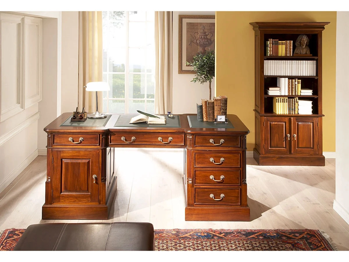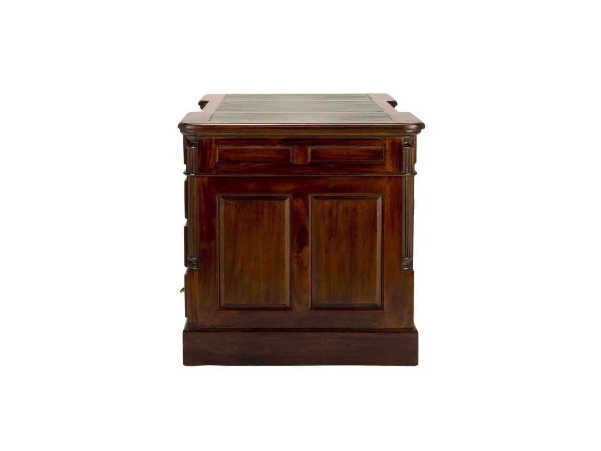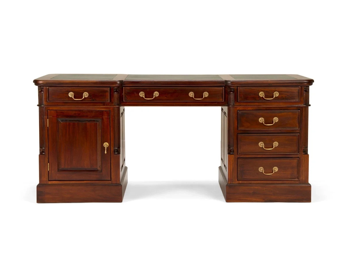 Objednejte si masivní psací stůl Cambridge z kvalitního mahagonového dřeva, který je dokonale lakovaný a doplněný o plochu z luxusní zelené kůže. Tento elegantní obdélníkový stůl o rozměrech 160×80×80 cm se stane dominantou vaší kanceláře a poskytne pohodlný prostor pro každodenní práci.