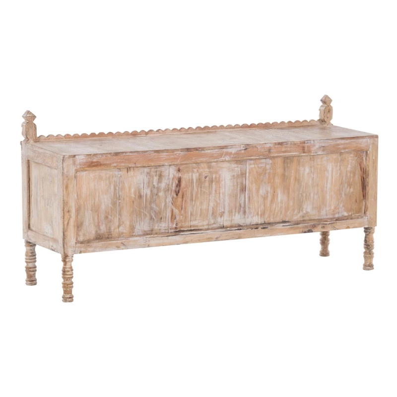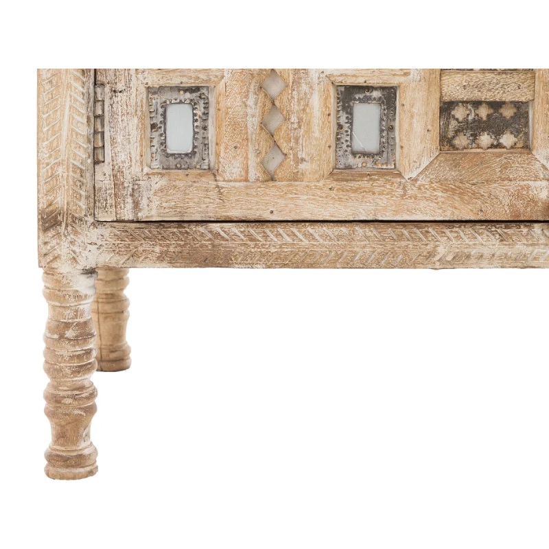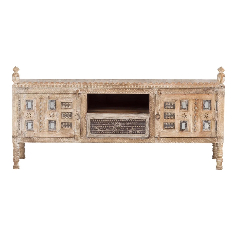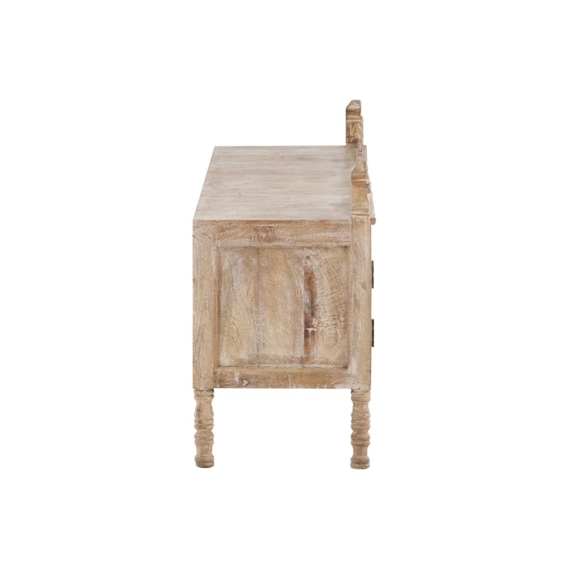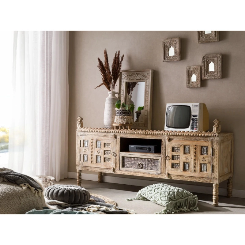 Masivní TV stolek Damchaya z mangového dřeva je dokonalým kouskem pro váš obývací pokoj, který spojuje funkčnost s jedinečným designem. Jeho lakovaný bílý povrch přináší svěží a moderní vzhled, který snadno zapadne do jakéhokoli interiéru. Tato praktická komoda o rozměrech 150×45×74 cm nabízí dostatek prostoru pro vaši televizi, multimediální zařízení a dekorace, které oživí váš domov. Přírodní krása mangového dřeva se projevuje v každém detailu, přičemž každá část je jedinečná a přináší do vašeho prostoru pocit elegance a harmonie.