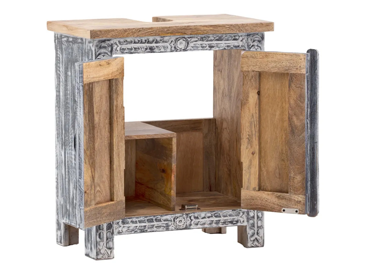 Wenn Sie die Oberflächenverarbeitung des Sets genauer betrachten, werden Sie sorgfältig ausgearbeitete Details entdecken, die die natürliche Schönheit des Mangoholzes hervorheben. Die Stücke sind so gestaltet, dass sie nicht nur praktischen Bedürfnissen gerecht werden, sondern gleichzeitig Gemütlichkeit und Charme in Ihren Raum bringen. Mit Maßen, die ideal für Standardbadezimmer sind, bietet dieses dreiteilige Set genügend Stauraum, ohne die Ästhetik aus den Augen zu verlieren. Es verleiht Ihrem Badezimmer Stil und Funktionalität, die Ihren Alltag erleichtert.