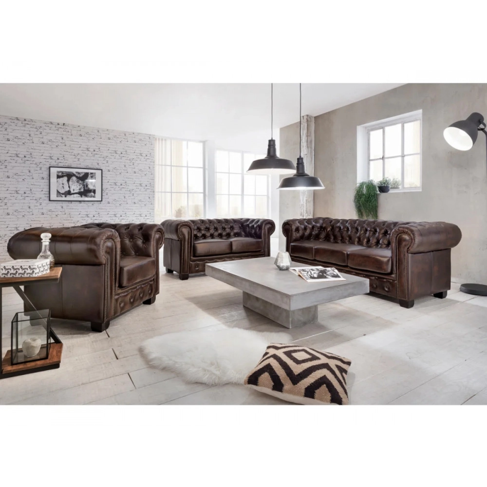 Masivní sedací souprava Chesterfield z pravé kůže v hnědé barvě je dokonalým doplňkem pro každou moderní domácnost, která touží po elegance a pohodlí. Tento ikony designu, charakterizovaný prošívaným vzorem a výraznými liniemi, přináší do vašeho interiéru nádech tradiční britské noblesy. Pravá kůže, z níž je sedací souprava vyrobena, zajišťuje nejen výjimečnou odolnost, ale také luxusní vzhled, který se s časem jen zlepší. Hnědé odstíny v kombinaci s pečlivým zpracováním vytvářejí útulnou atmosféru, která zve k odpočinku a relaxaci.