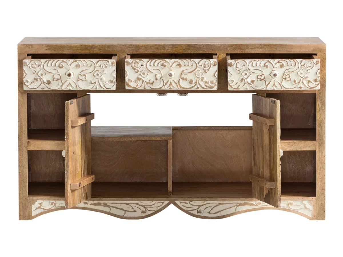 Objevte kouzlo přírodního designu s masivním umyvadlem Delhi, vyrobeným z kvalitního mangového dřeva, které dodá vaší koupelně teplý a elegantní vzhled. Tento lakovaný kousek v hnědé barvě má rozměry 130 cm x 50 cm x 75 cm a jeho robustní konstrukce bez výřezu zajišťuje snadnou instalaci a dlouhodobou odolnost.