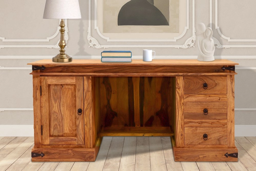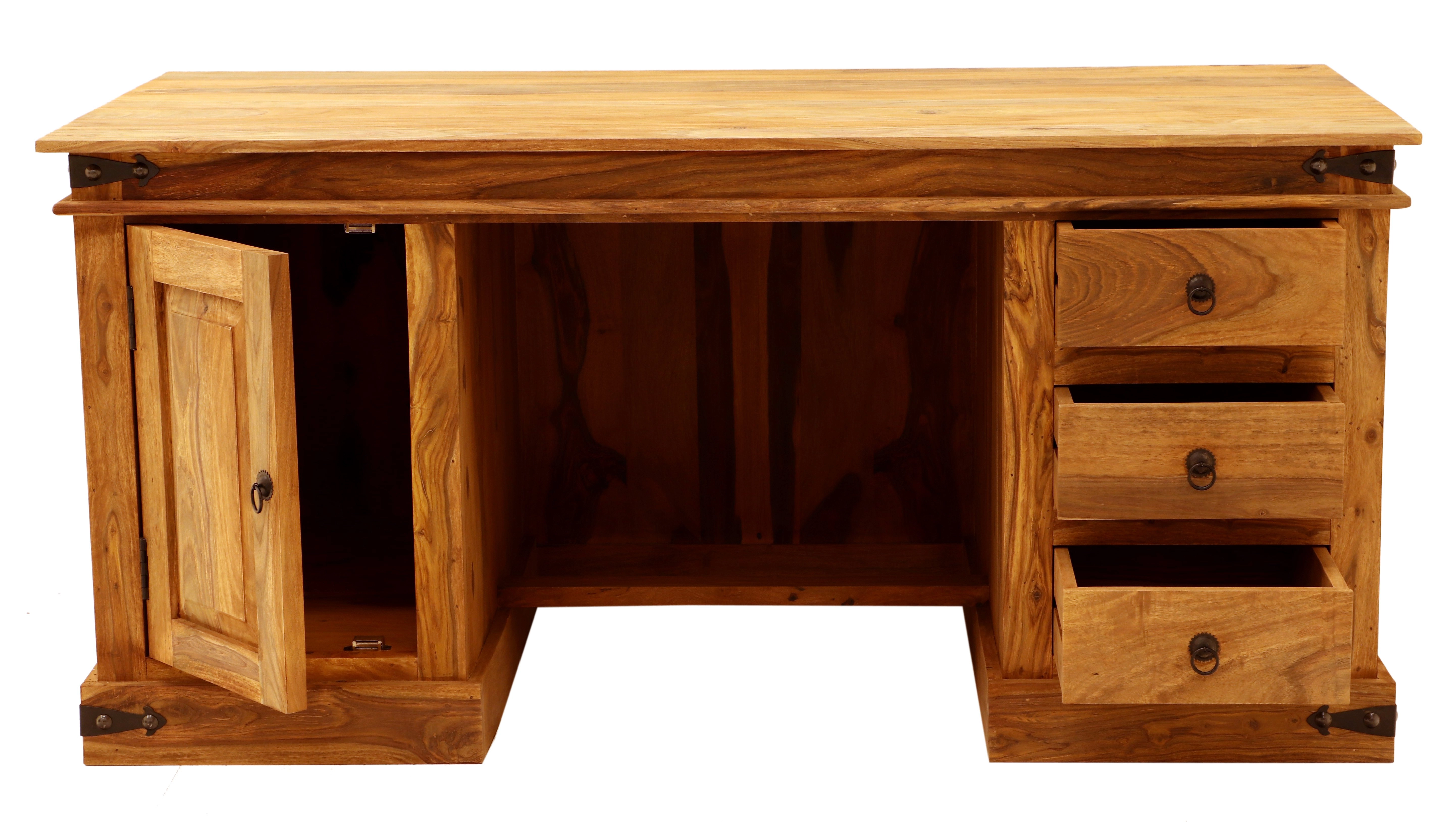 Tento elegantní kancelářský nábytek z masivu nejenže dodává vaší kanceláři nebo domácí pracovně stylový vzhled, ale také nabízí praktické využití. Stůl je vybaven dvířky a třemi prostornými šuplíky, které poskytují dostatek úložného prostoru pro vaše dokumenty a kancelářské potřeby. Stůl z masivu palisandr vnese do vašeho pracovního prostoru jedinečnou atmosféru díky své teplé a přirozené barvě dřeva, která se hodí k jakémukoliv interiéru.