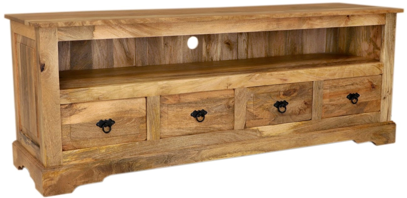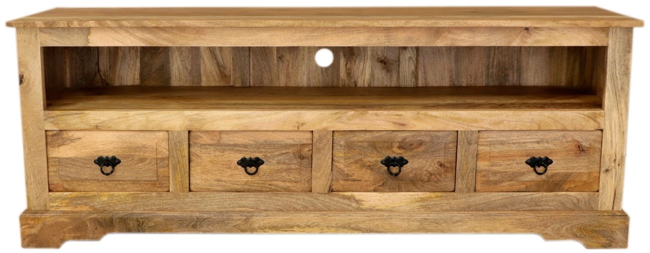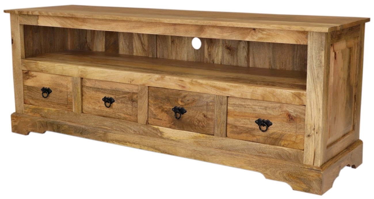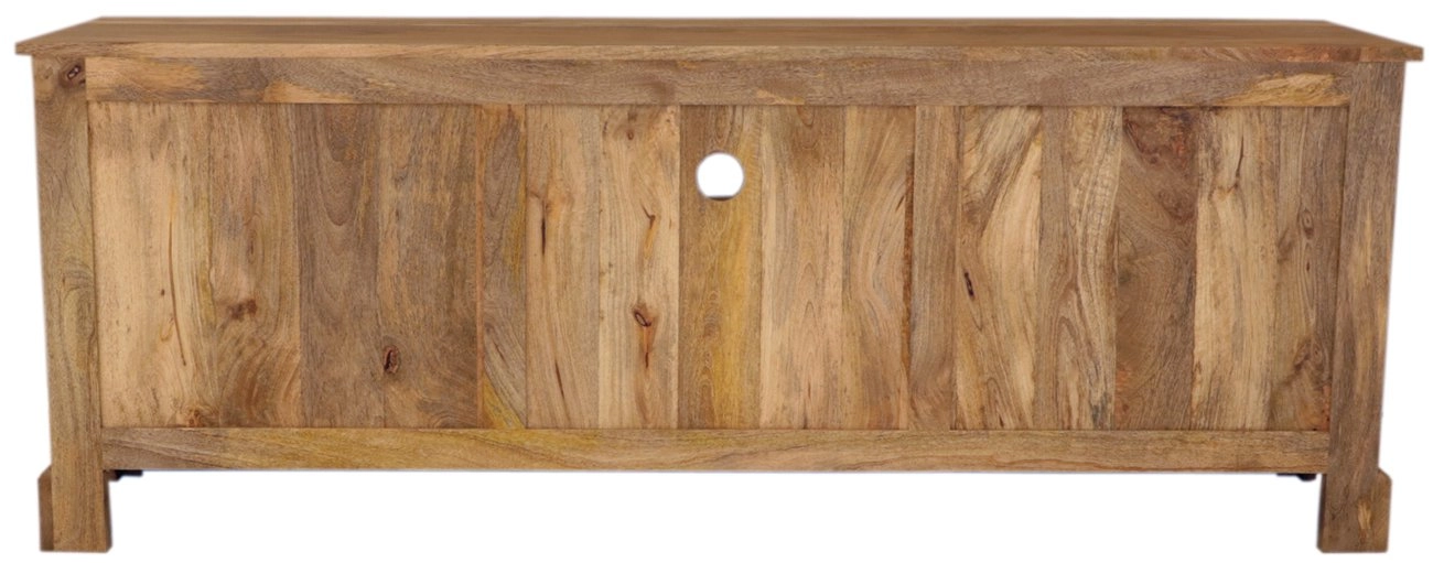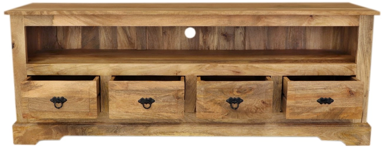Stolek je esteticky navržený s dostatečným prostorem pro vaši elektroniku díky otevřenému prostoru na spodní části. Čtyři prostorné šuplíky navíc umožňují ukládání dalších drobných předmětů nebo multimediálních zařízení. Masivní mango dřevěný povrch dodává stolku rustikální a přirozený vzhled, který snadno sladíte s jinými kusy dřevěného nábytku. Tento stolek se stane středobodem vašeho obývacího pokoje, přičemž jeho konstrukce zajišťuje dlouhou životnost a odolnost.