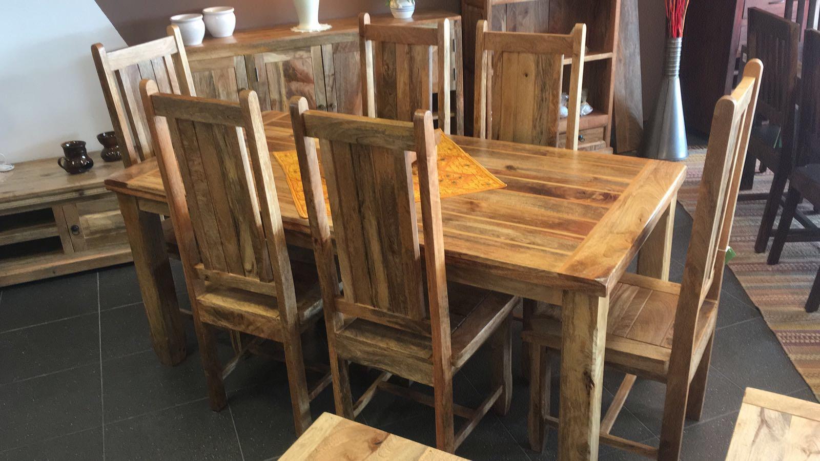 Hochwertiger massiver Tisch, ideal für Ihr Esszimmer, ergänzt durch sechs stilvolle Stühle. Robuste Bauweise und ansprechendes Design vereinen Funktionalität und Eleganz. Perfekt für gesellige Runden oder entspannte Familienabende.